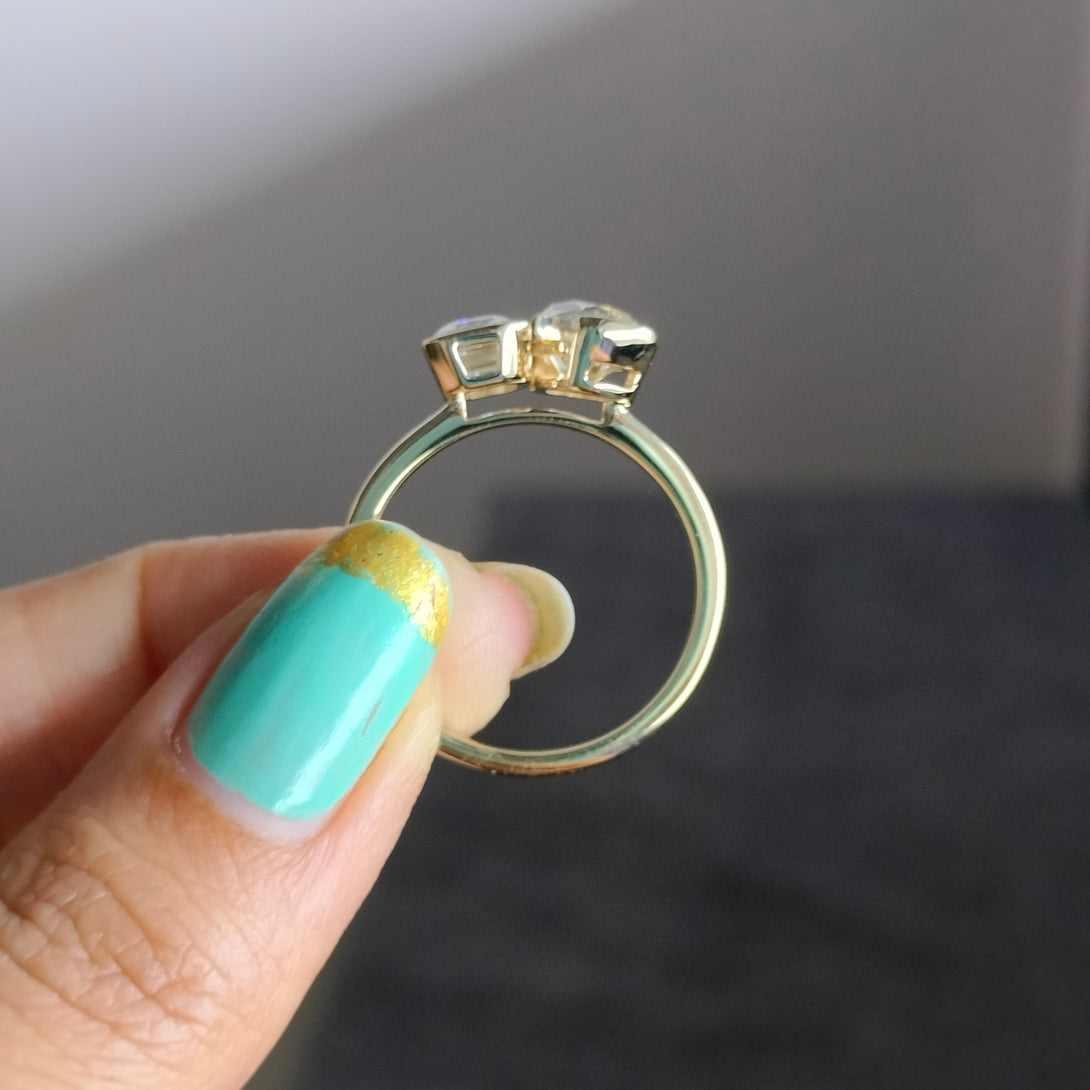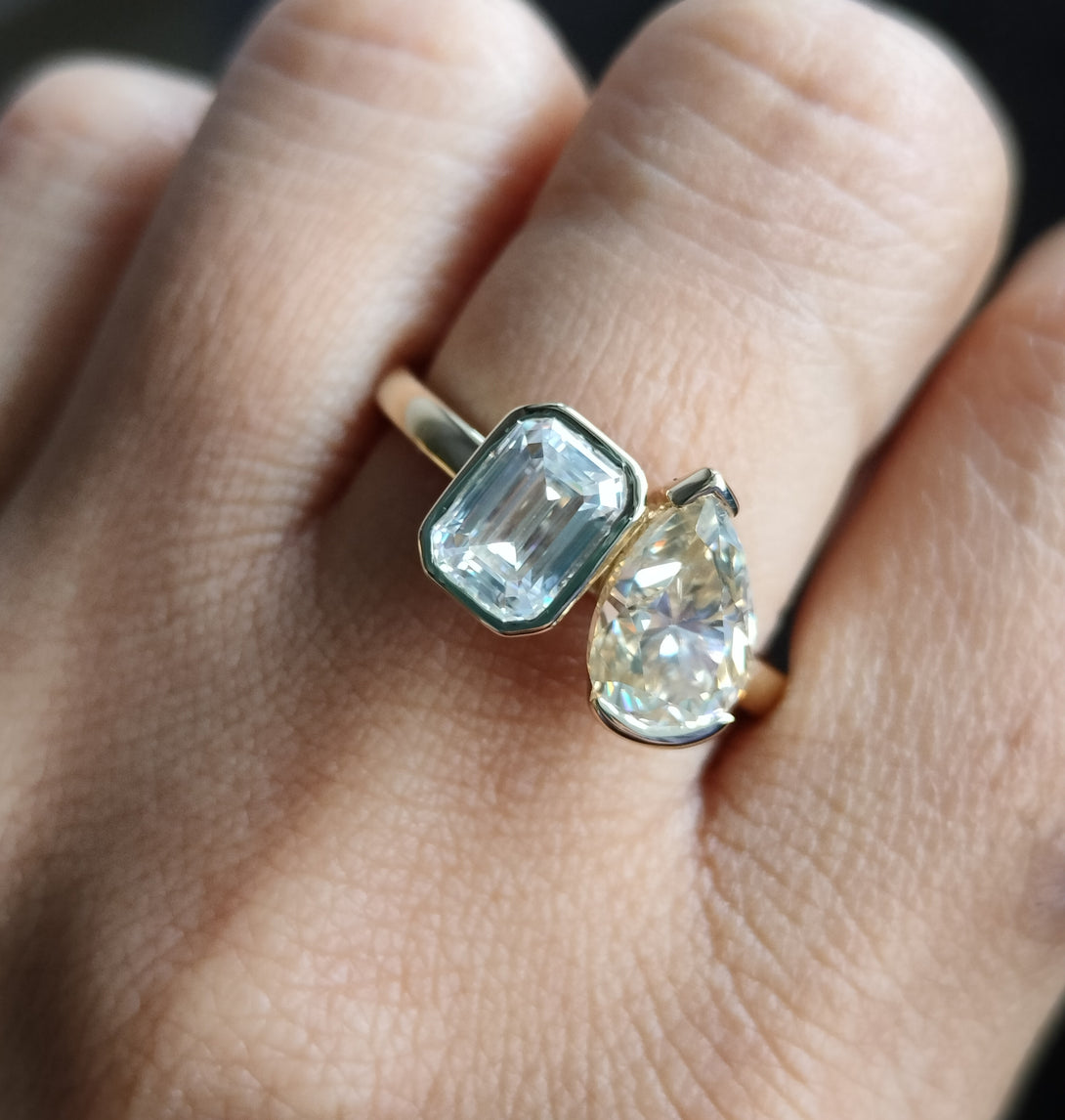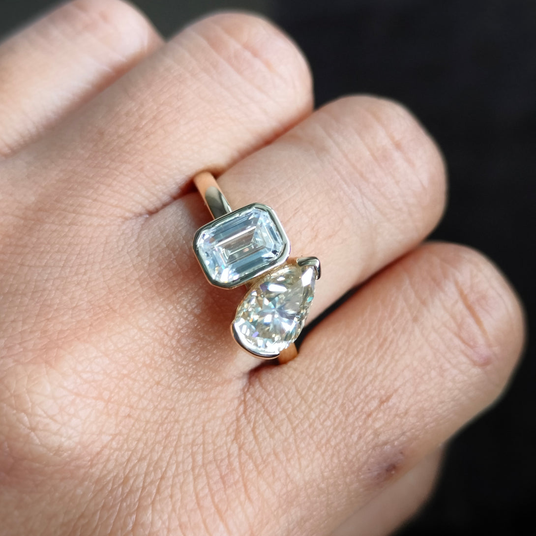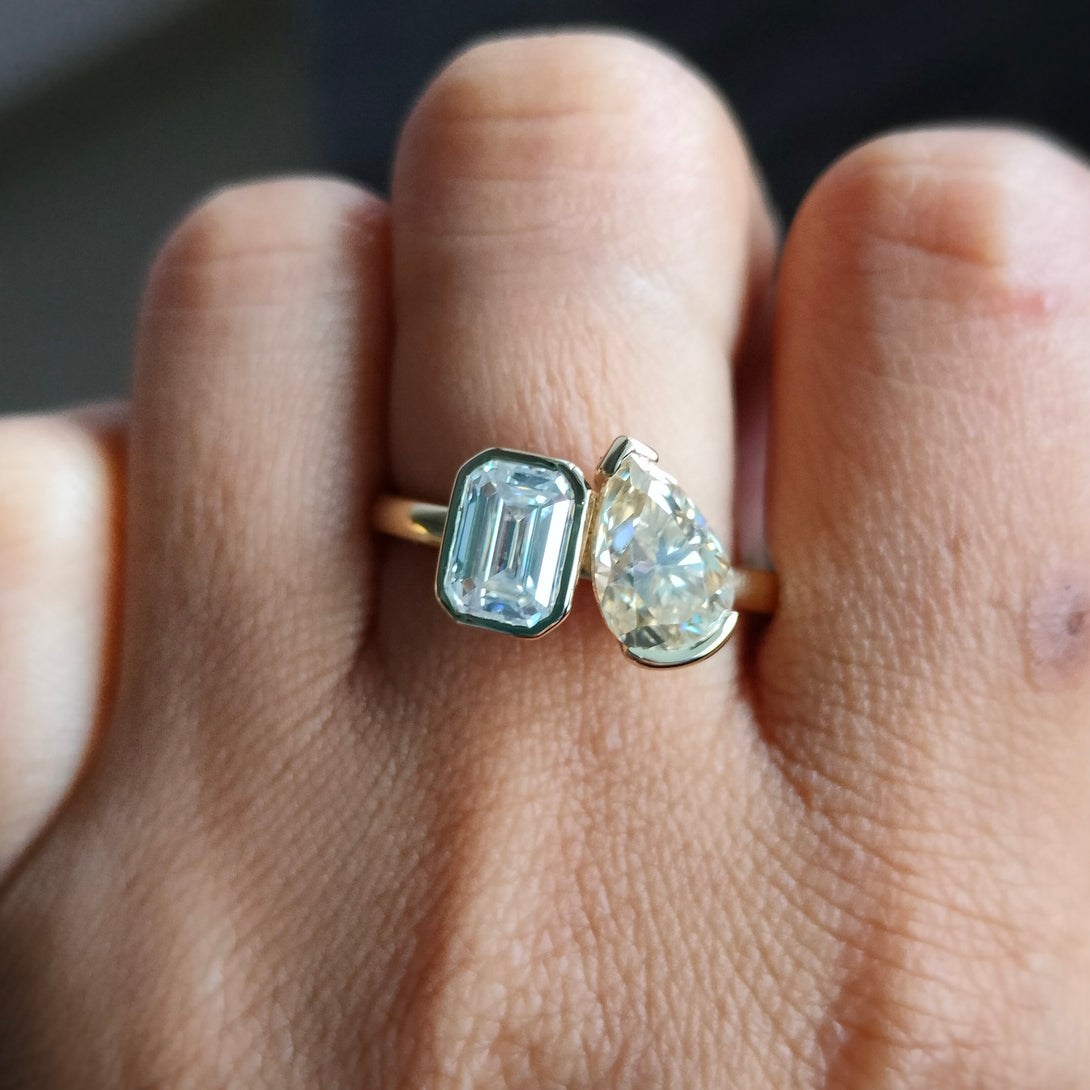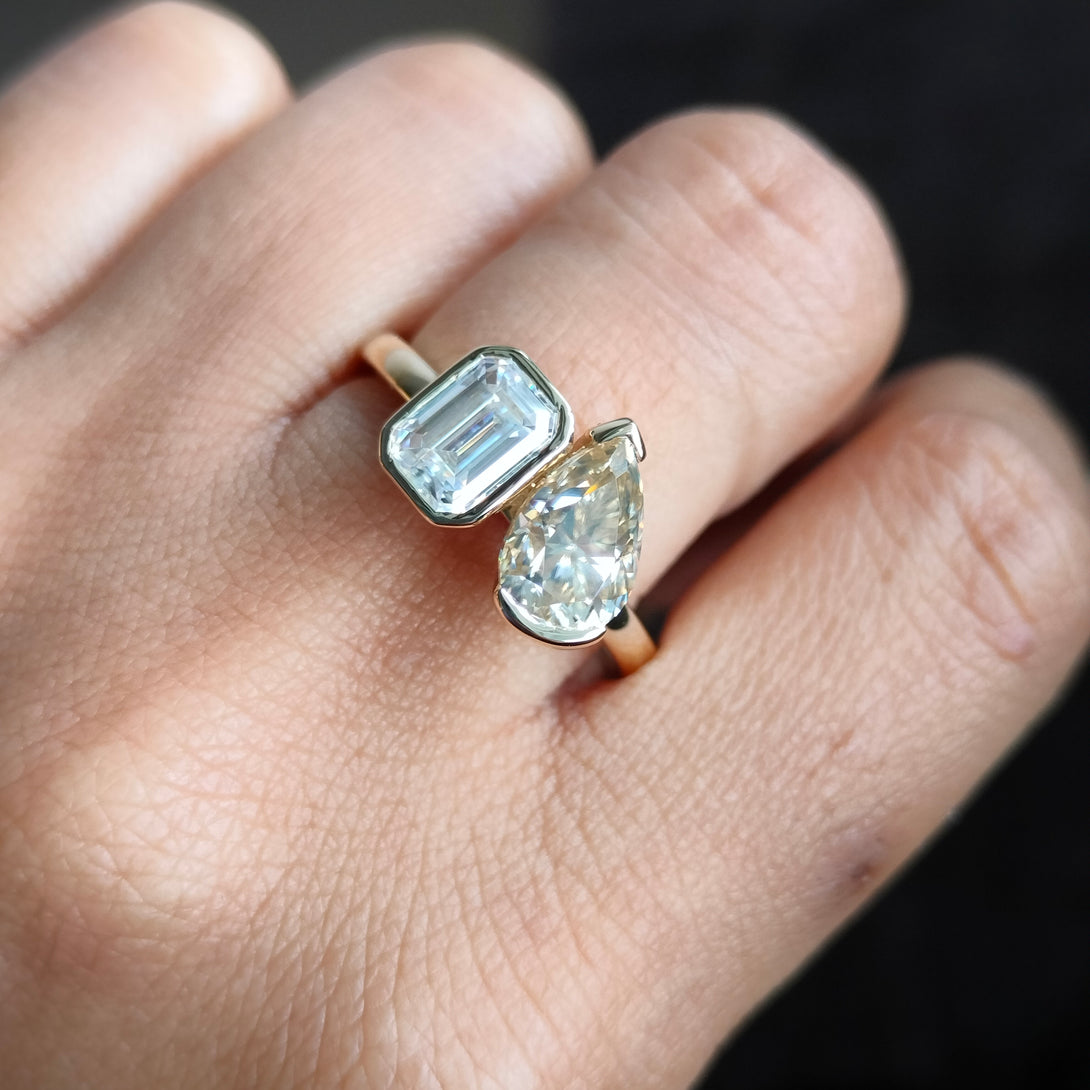 Emerald & Pear Brown Moissanite Wedding Ring Bezel Set Two Stone Ring