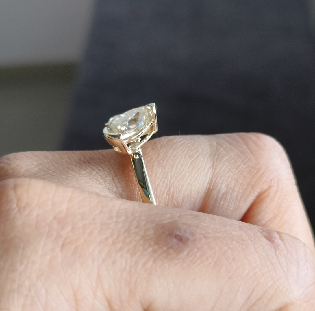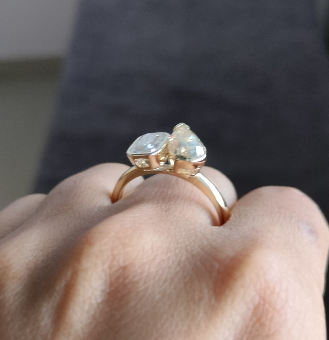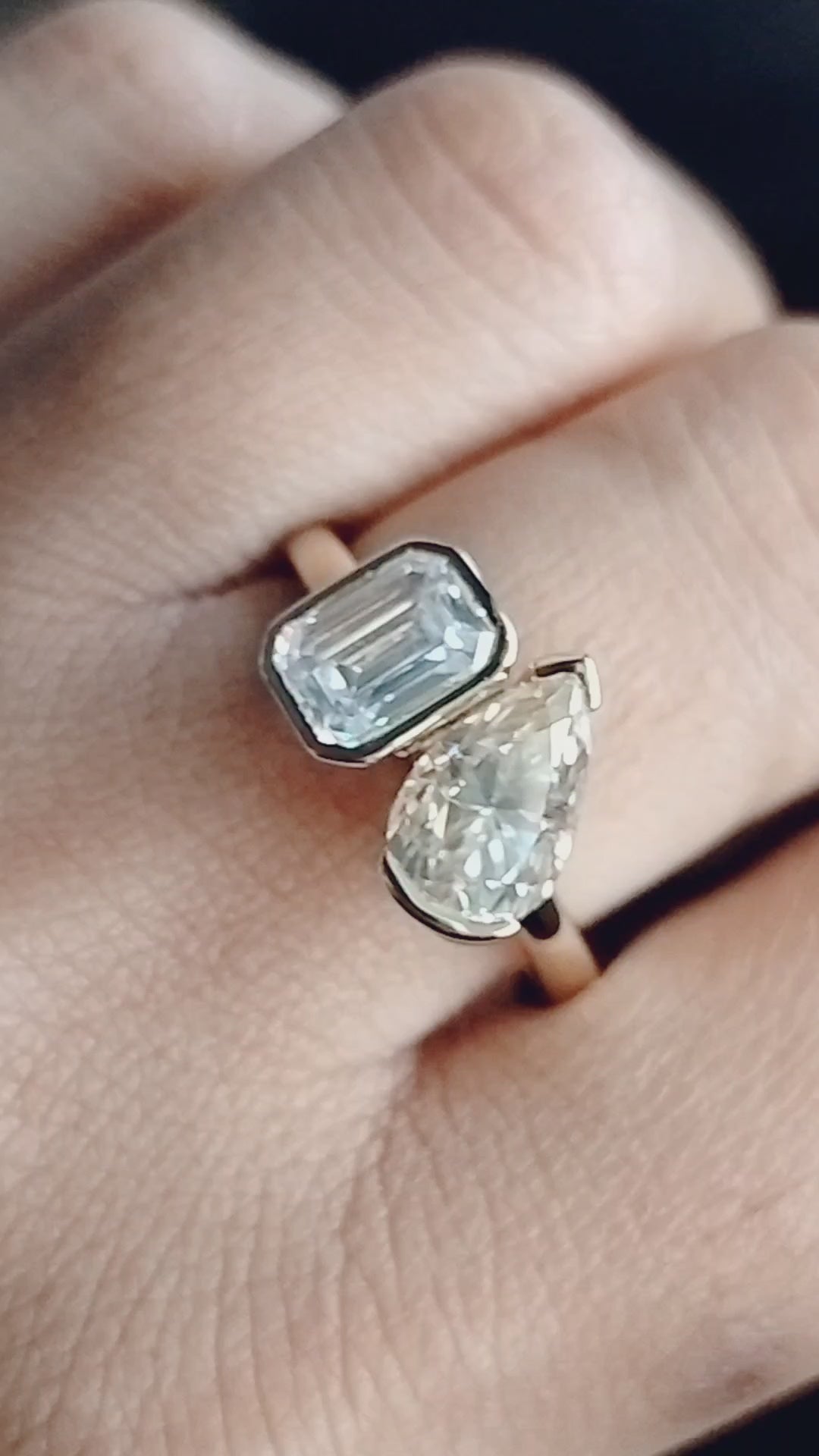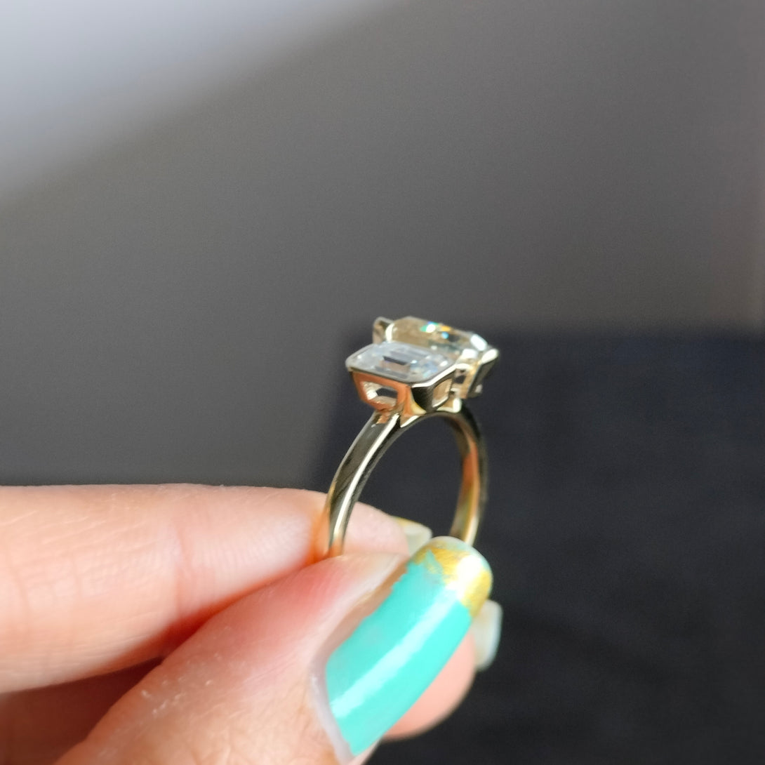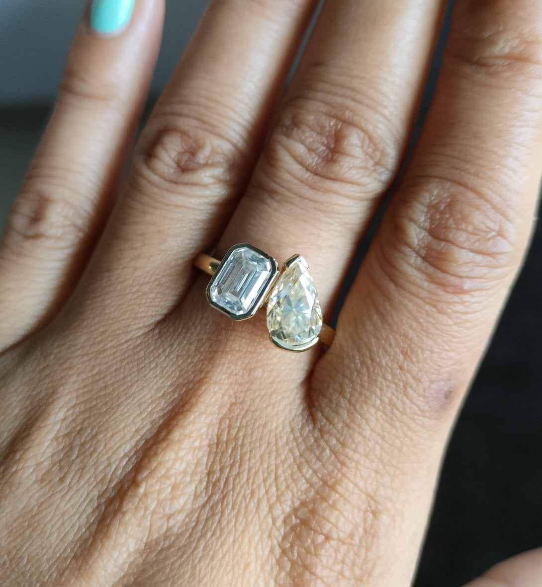 Emerald & Pear Brown Moissanite Wedding Ring Bezel Set Two Stone Ring