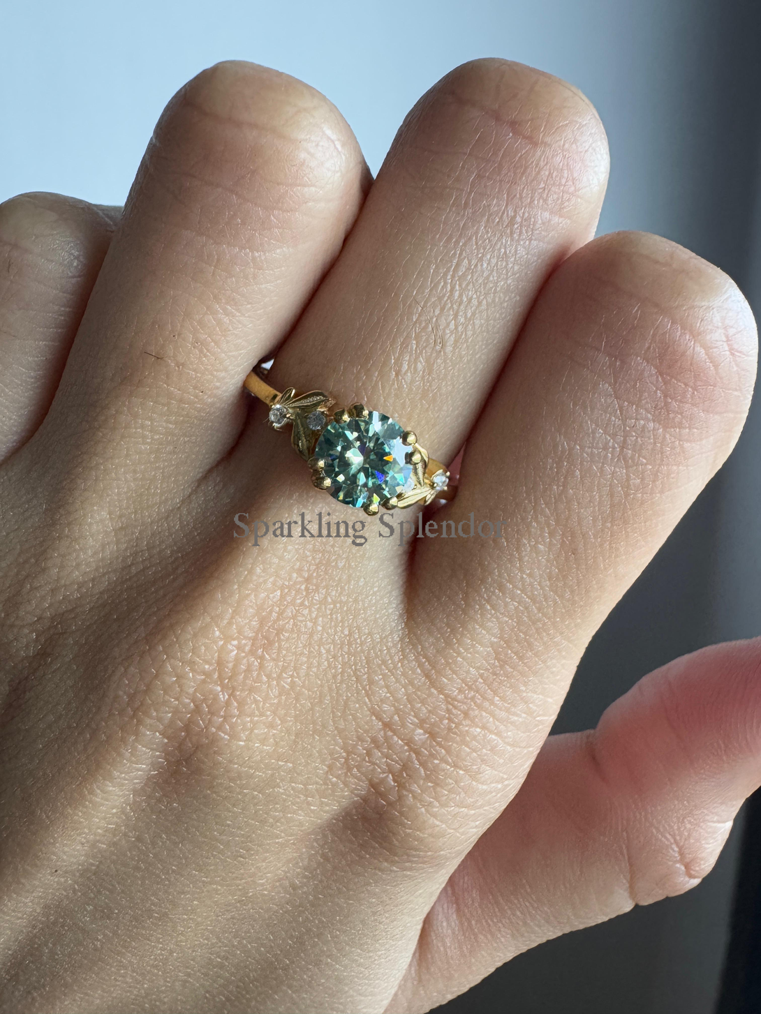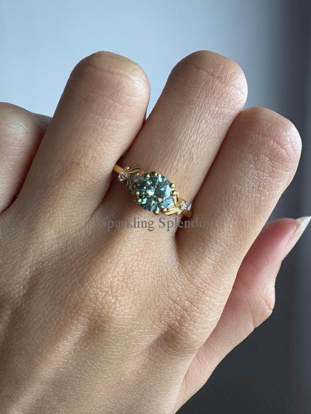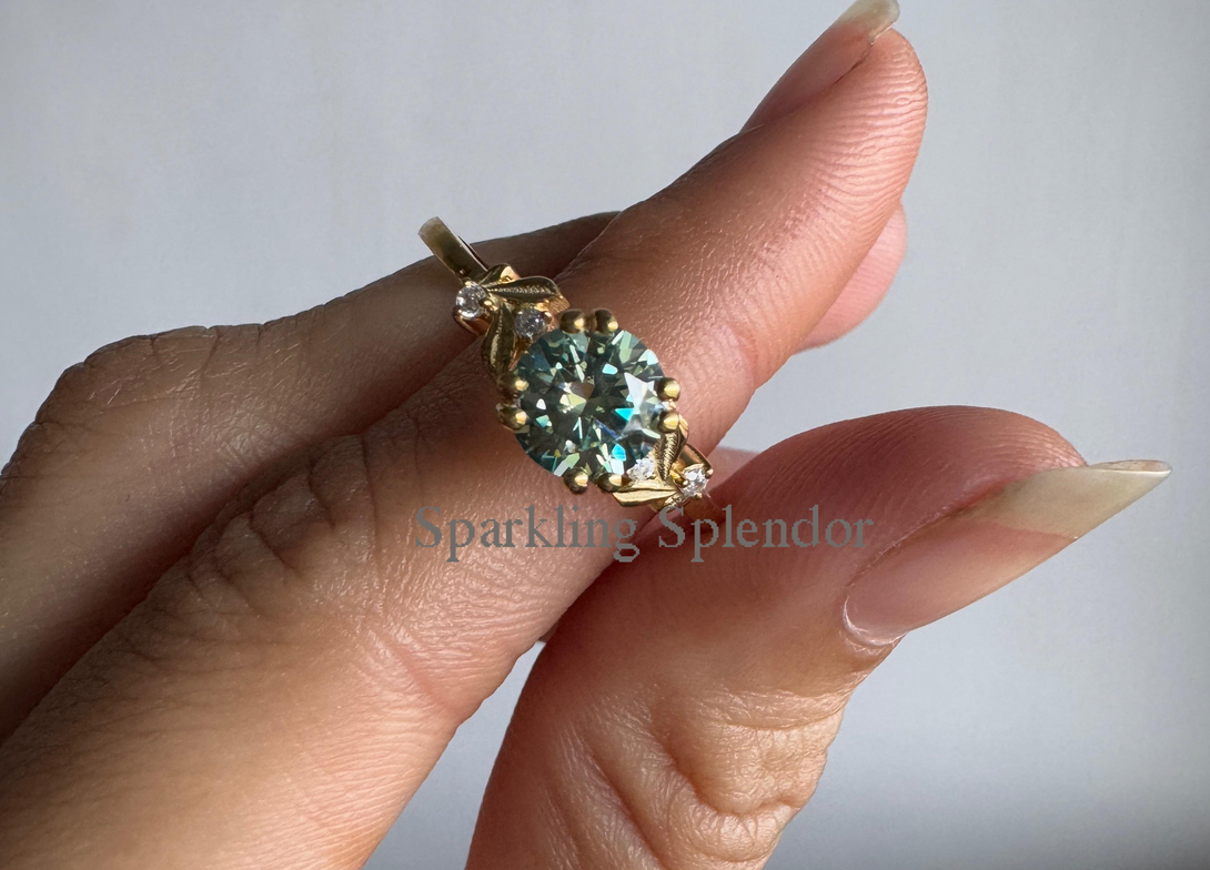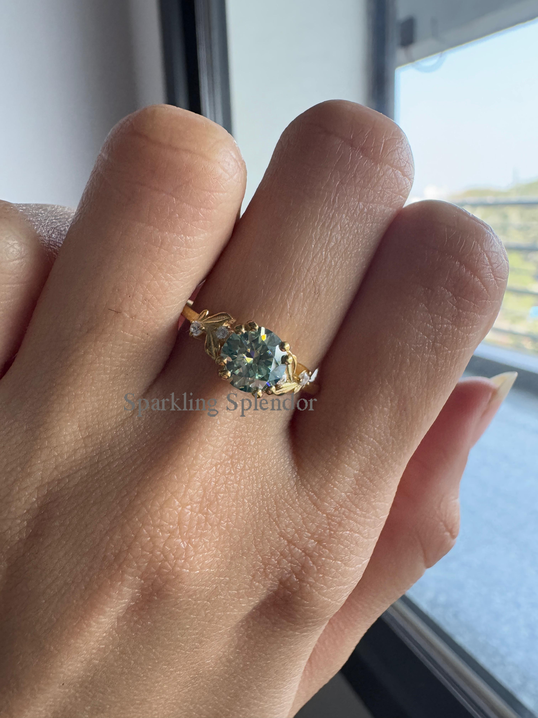 Green Round Moissanite Engagement Ring Gorgeous Flower Leaf Wedding Ring