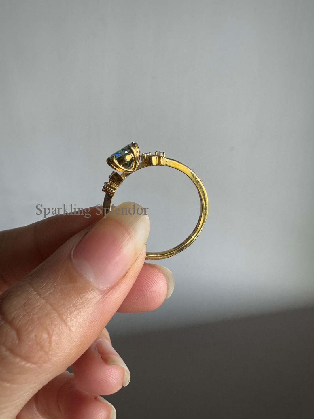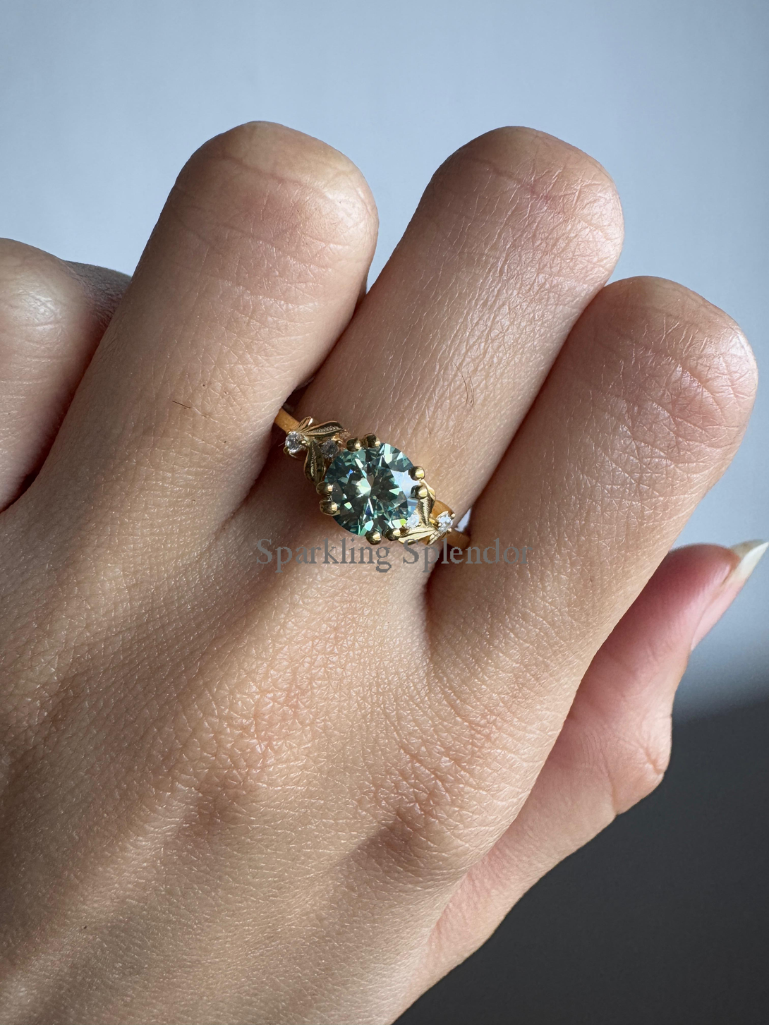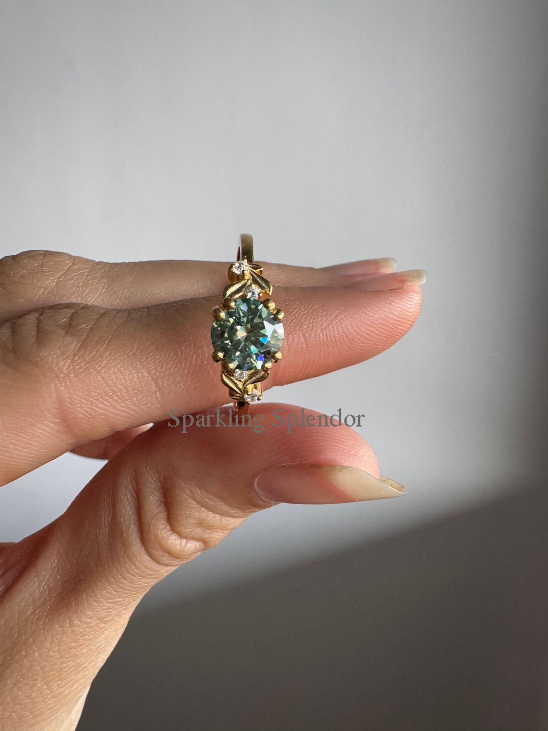 Green Round Moissanite Engagement Ring Gorgeous Flower Leaf Wedding Ring