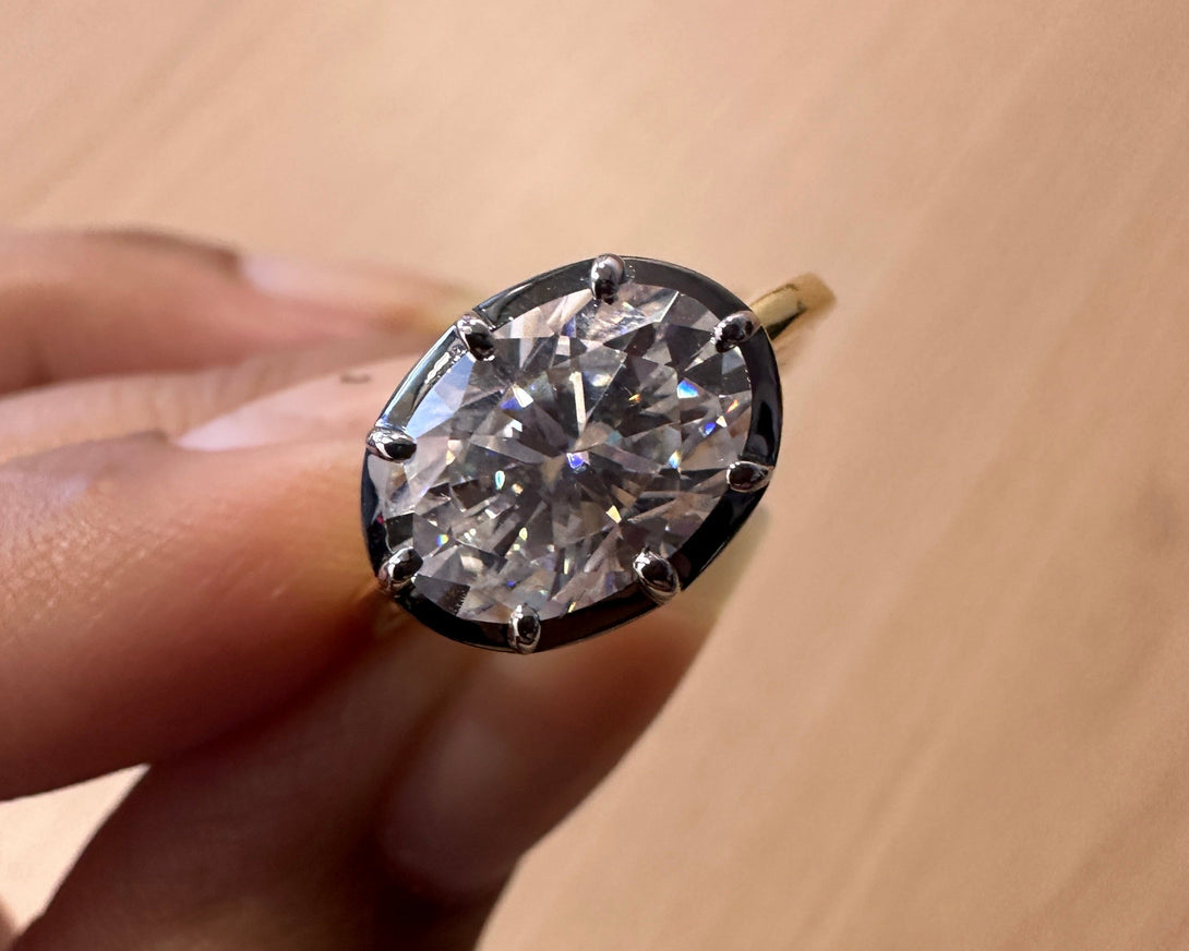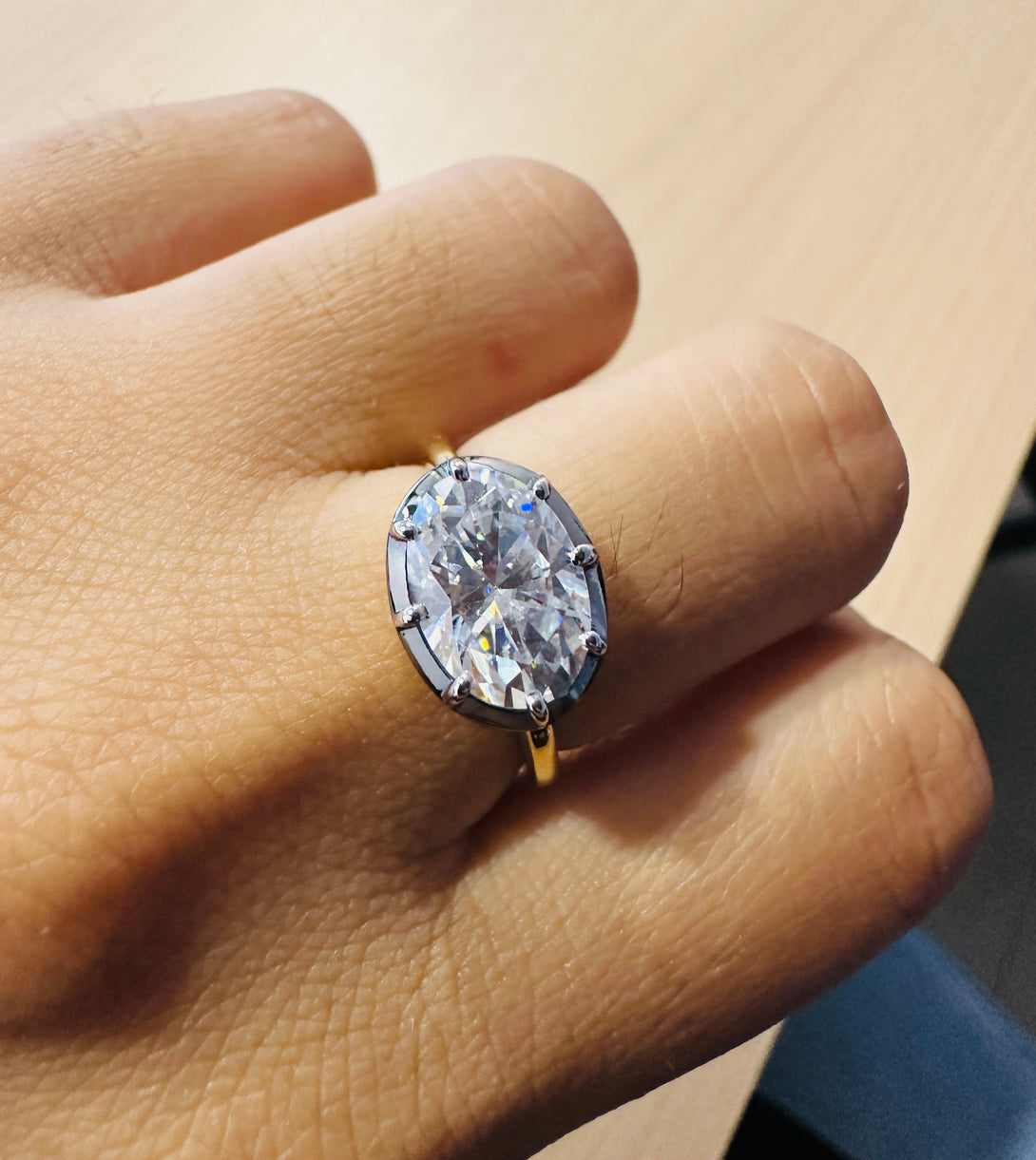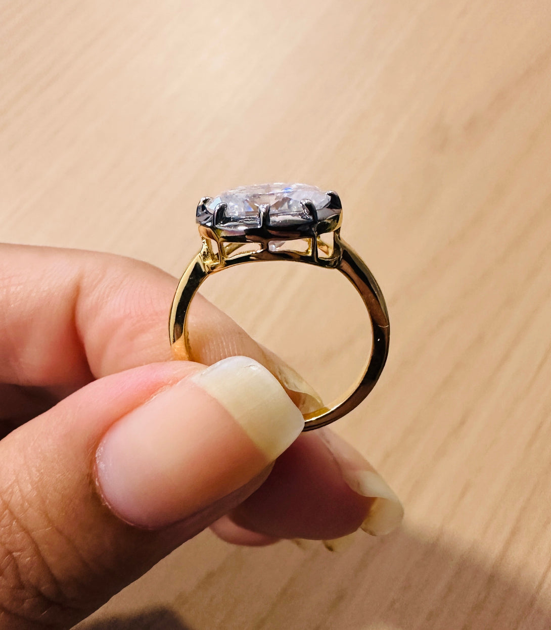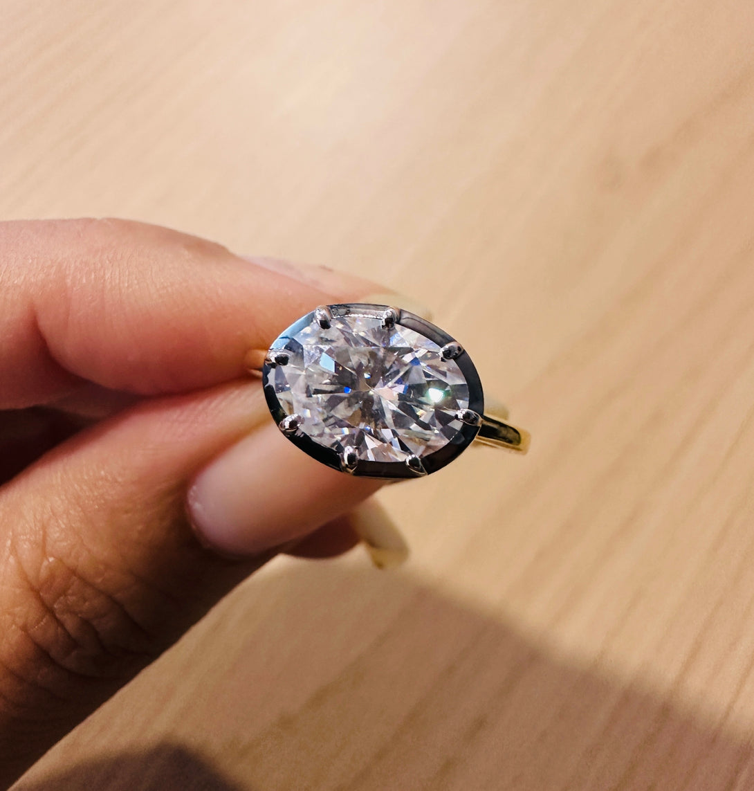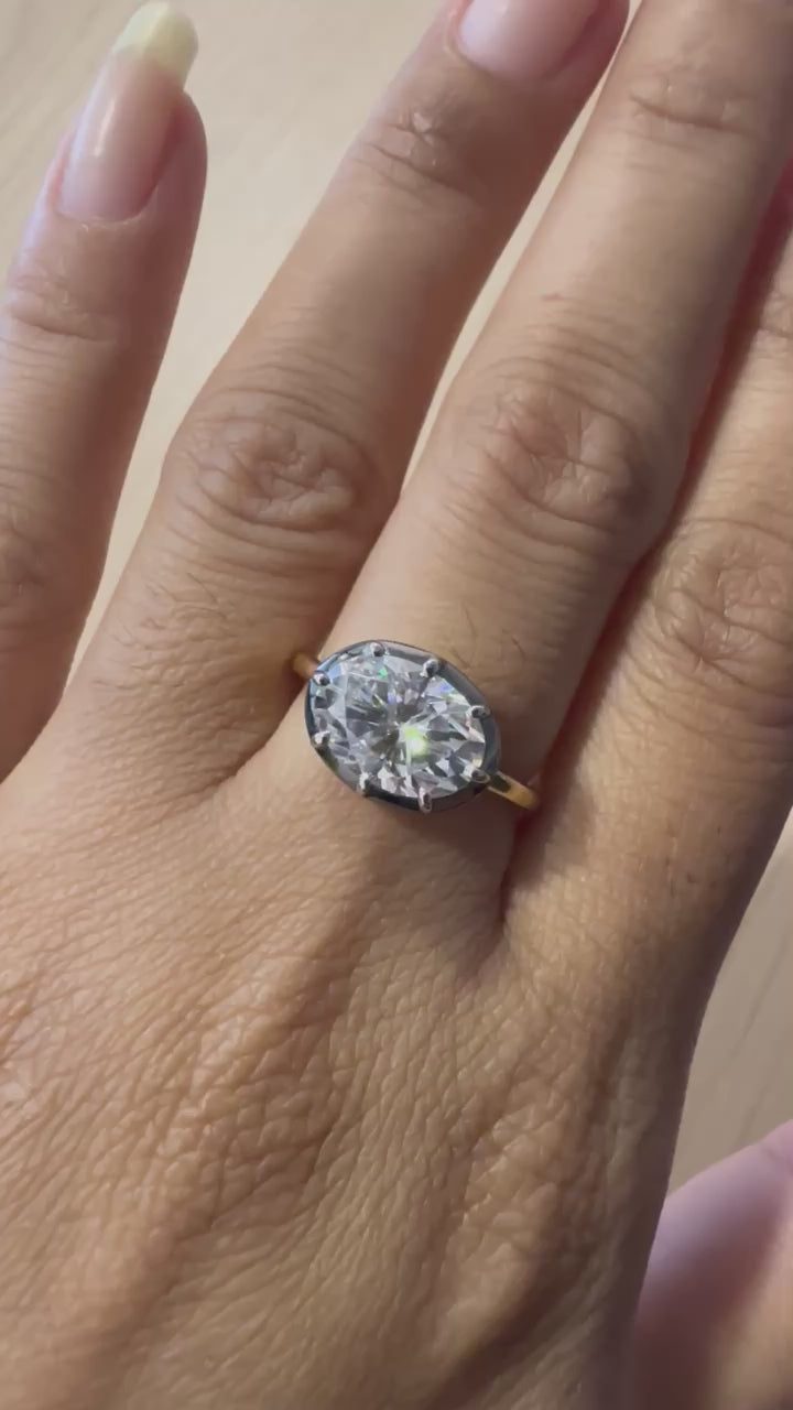 Black Rhodium Bezel Set Solitaire Ring White Oval Moissanite East West Engagement Ring