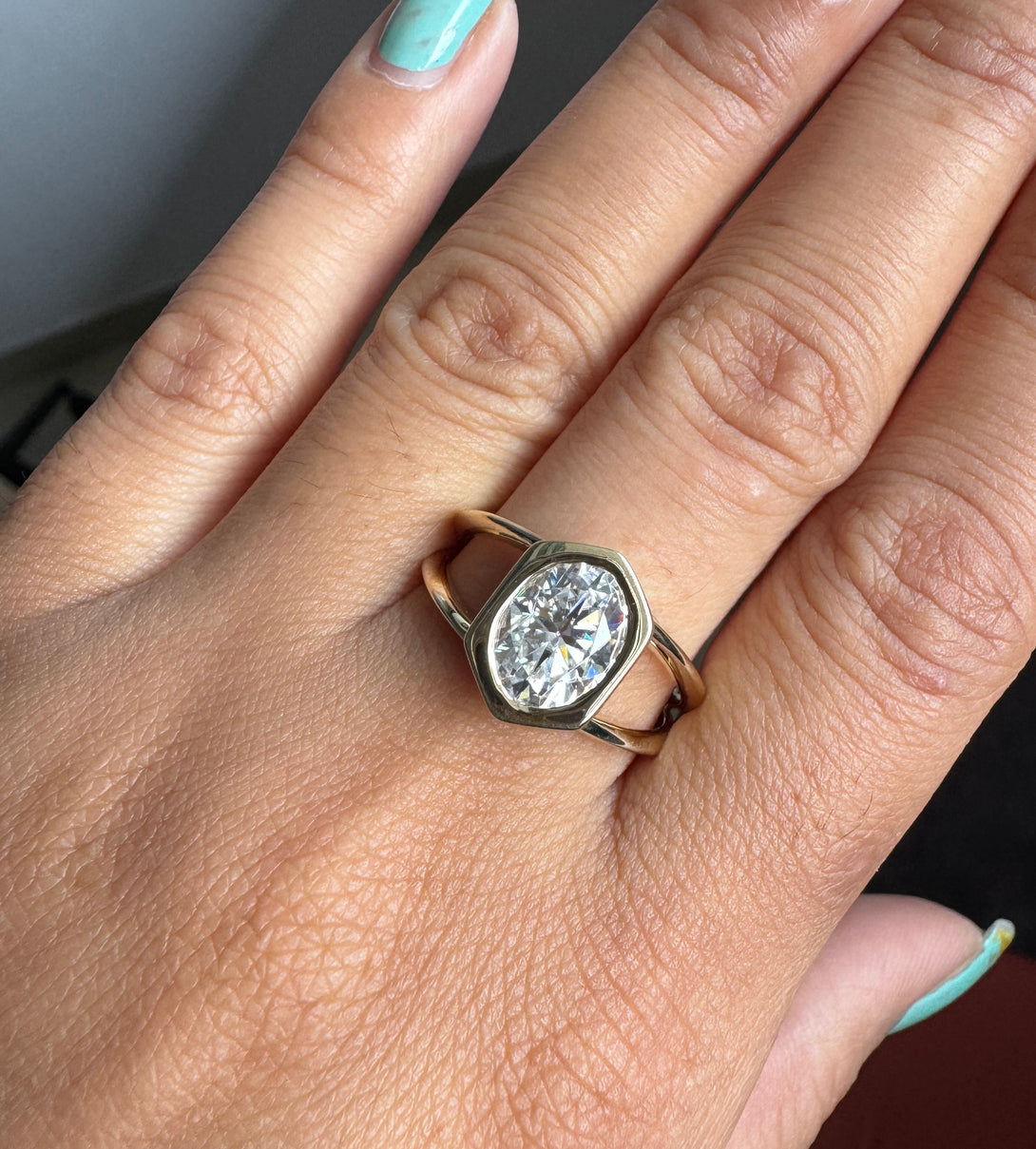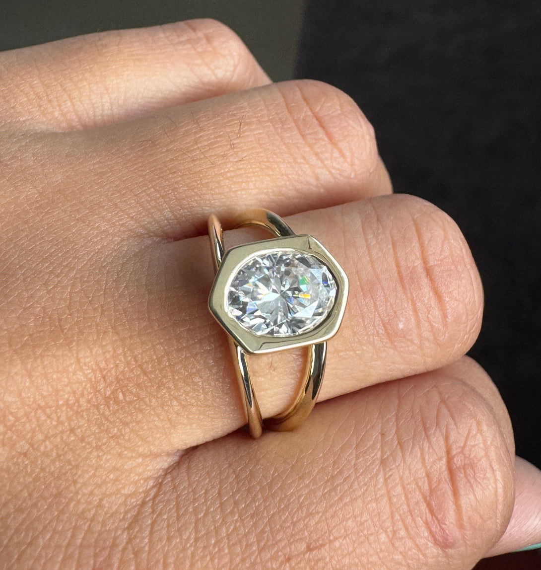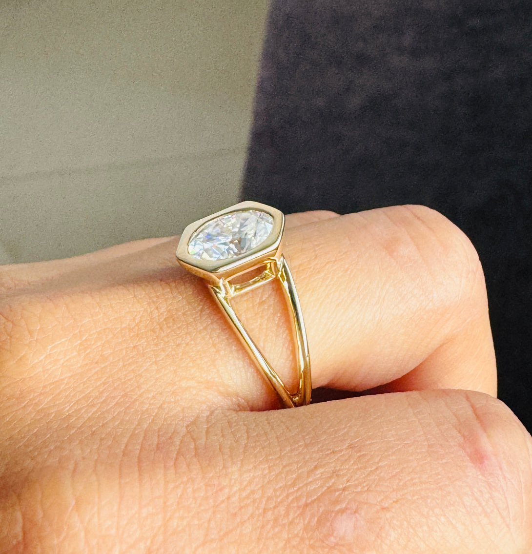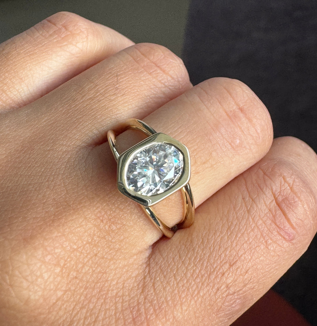 Hexagon Shape Bezel Set Oval Moissanite Solitaire Engagement Ring in 18K Gold