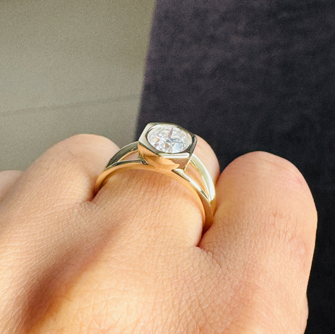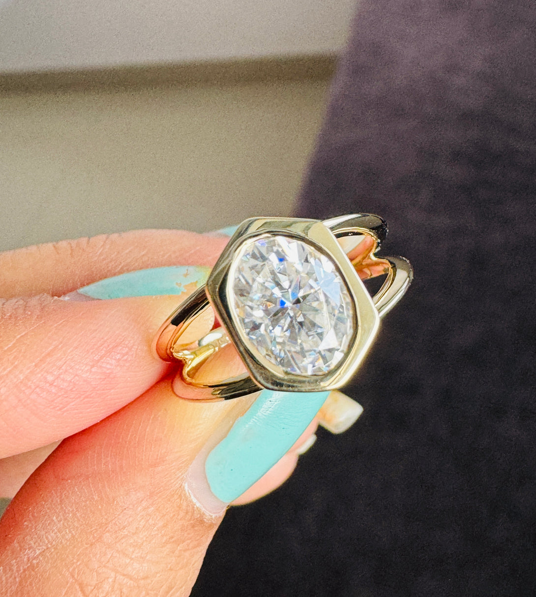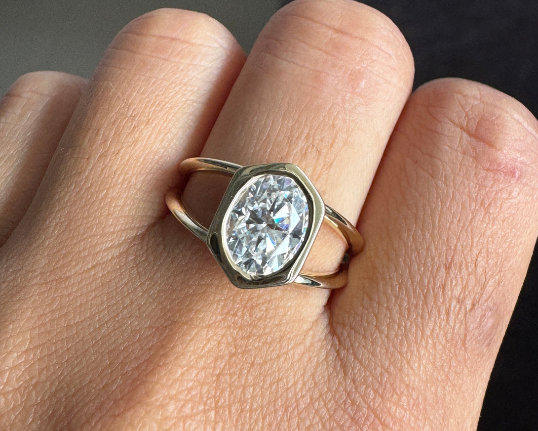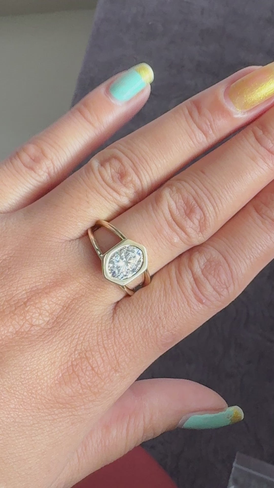 Hexagon Shape Bezel Set Oval Moissanite Solitaire Engagement Ring in 18K Gold