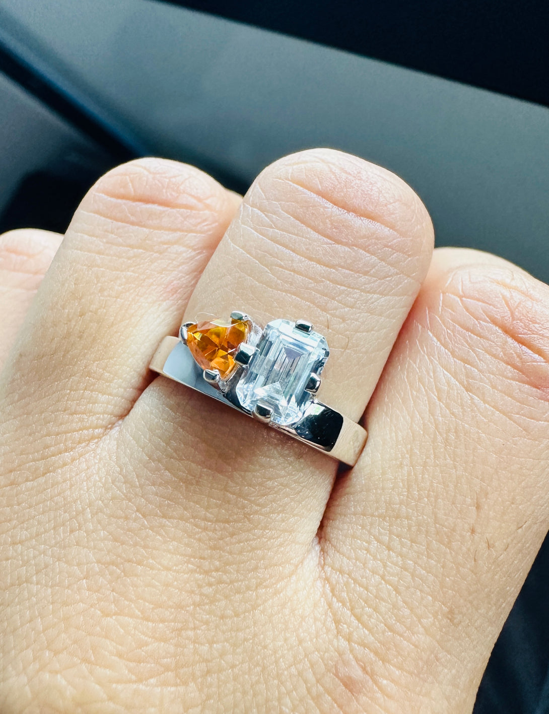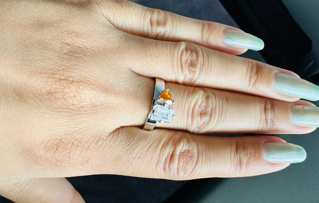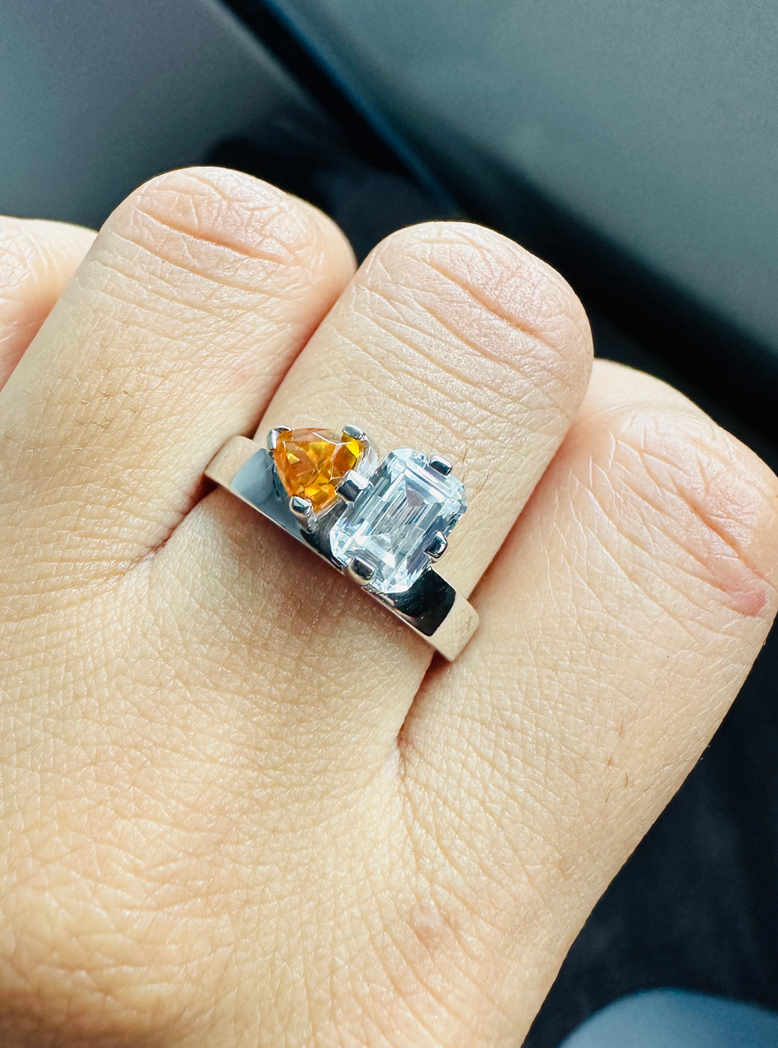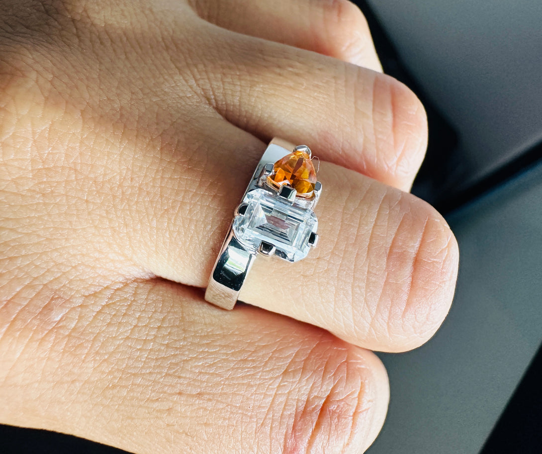 Brown Trillion & White Emerald Moissanite Chunky Band 2 Stone Wedding Ring in Gold