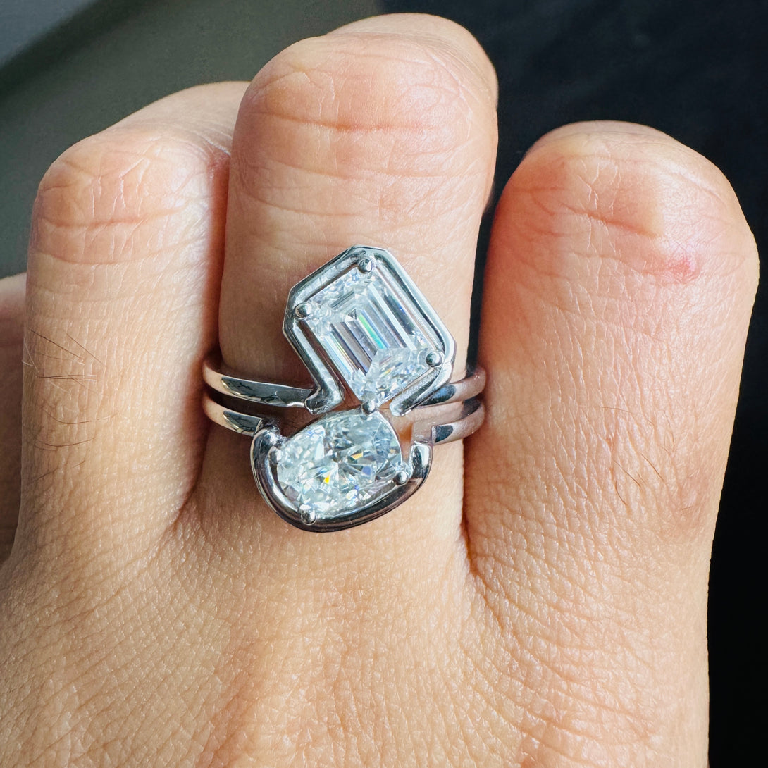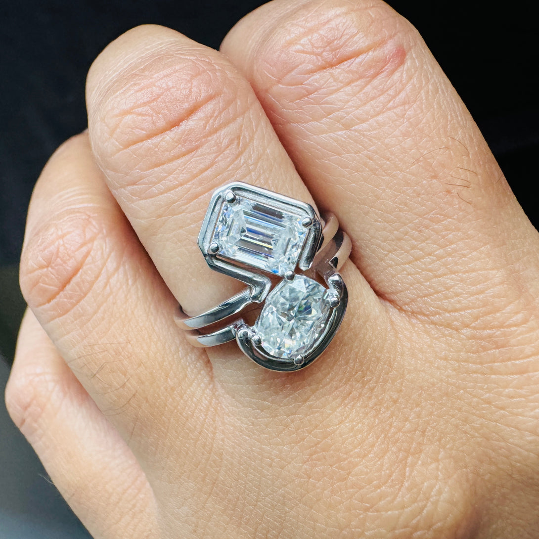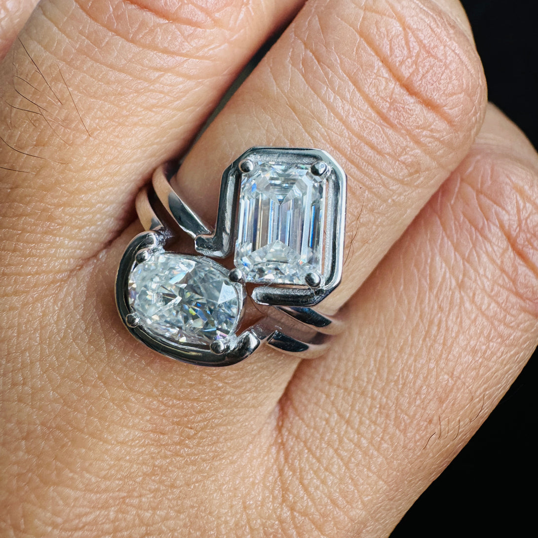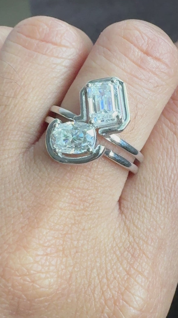Toi Et Moi Ring Double Band Ring Emerald & Cushion Cut Moissanite Engagement Ring