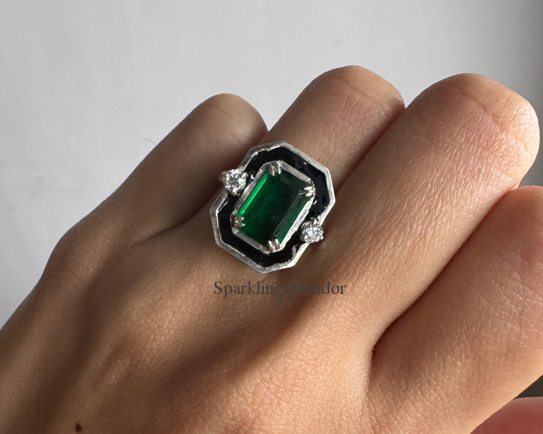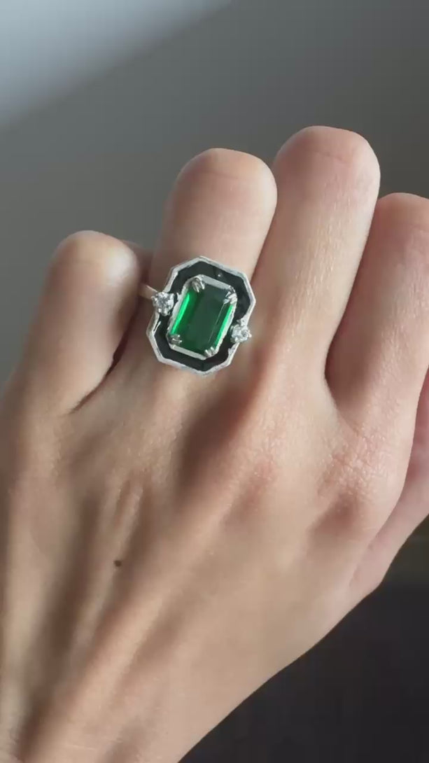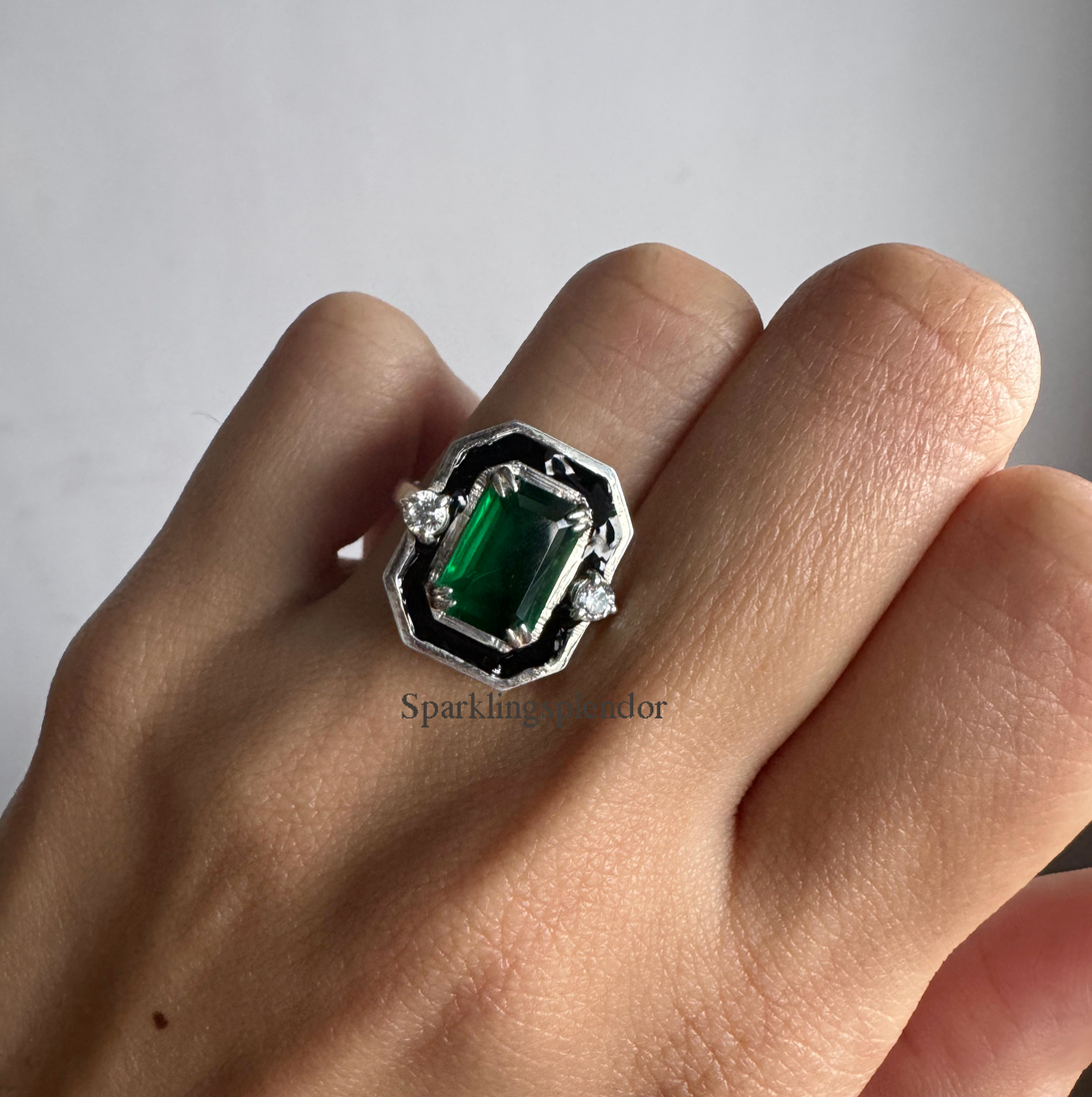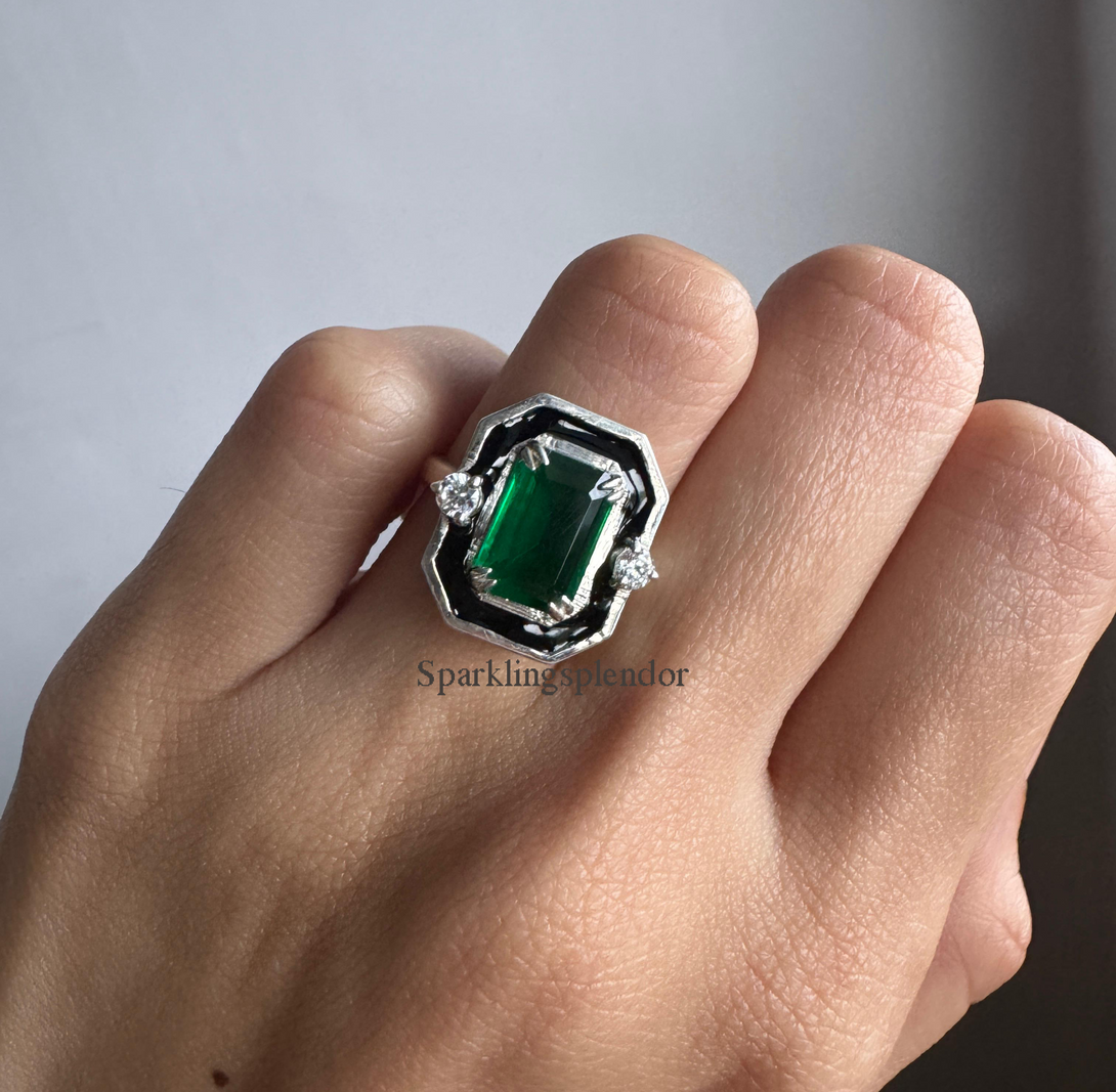 Vintage Style Emerald CZ Diamond Bezel Set Engagement Ring in Solid Gold