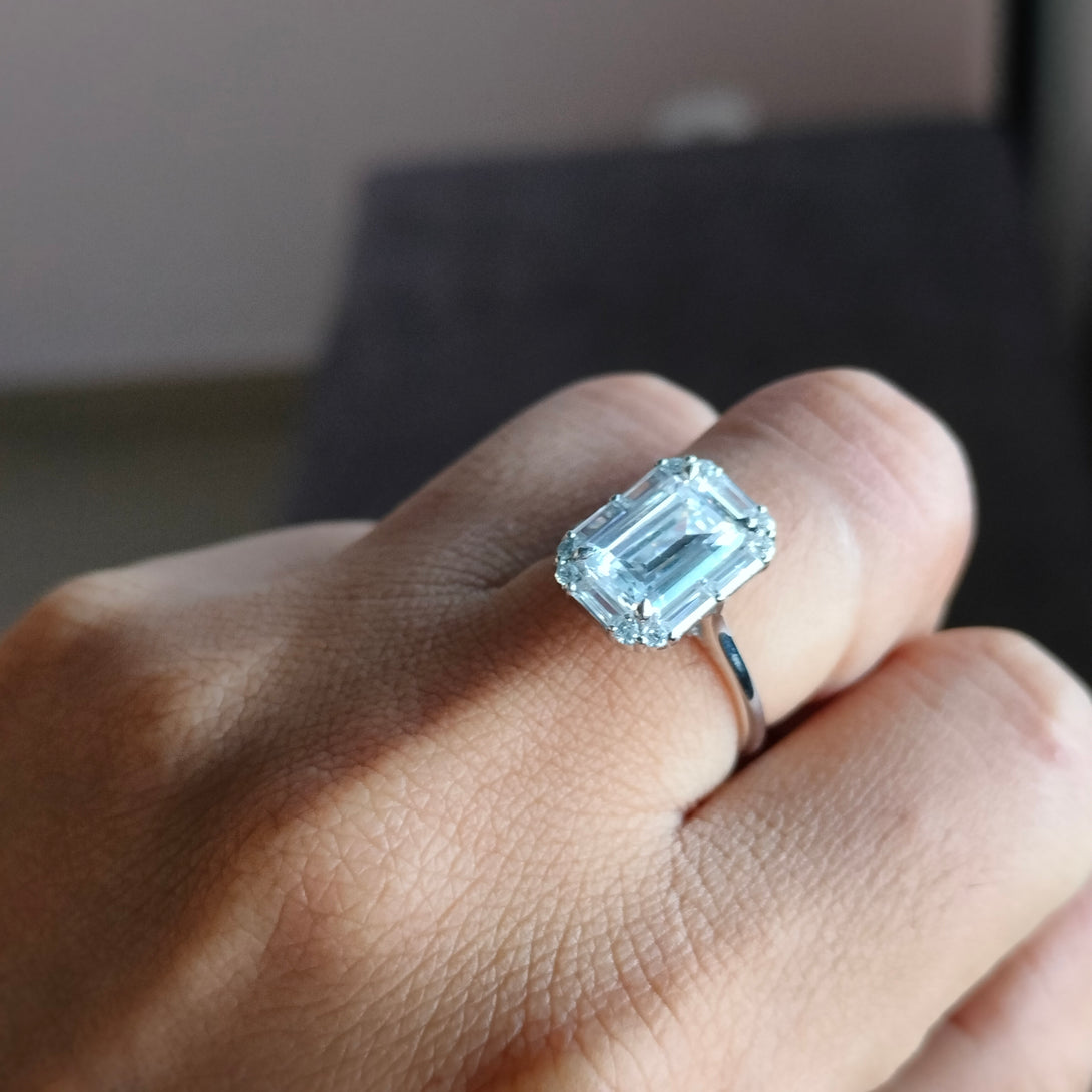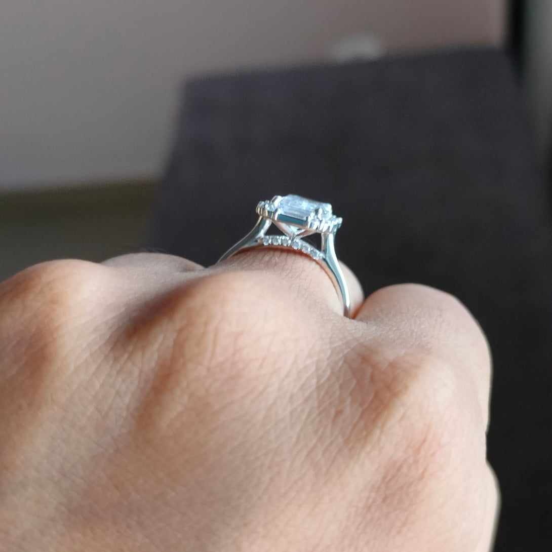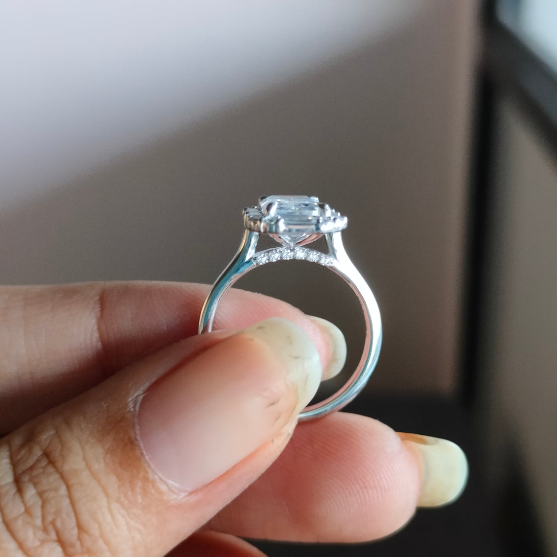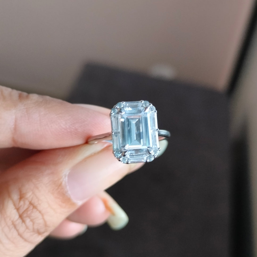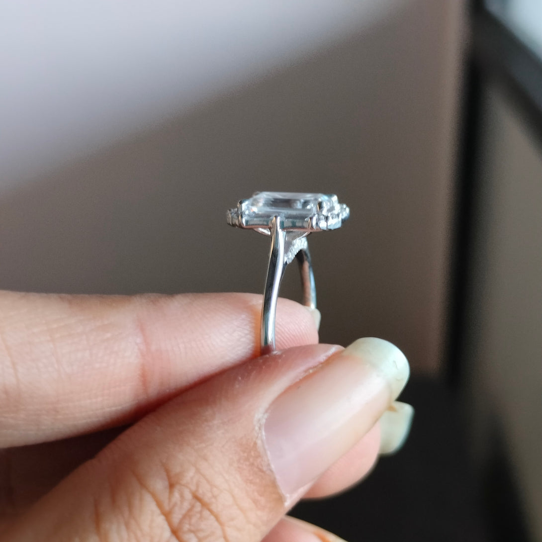 Colorless Emerald Cut Moissanite Engagement Ring Cluster Halo Wedding Ring