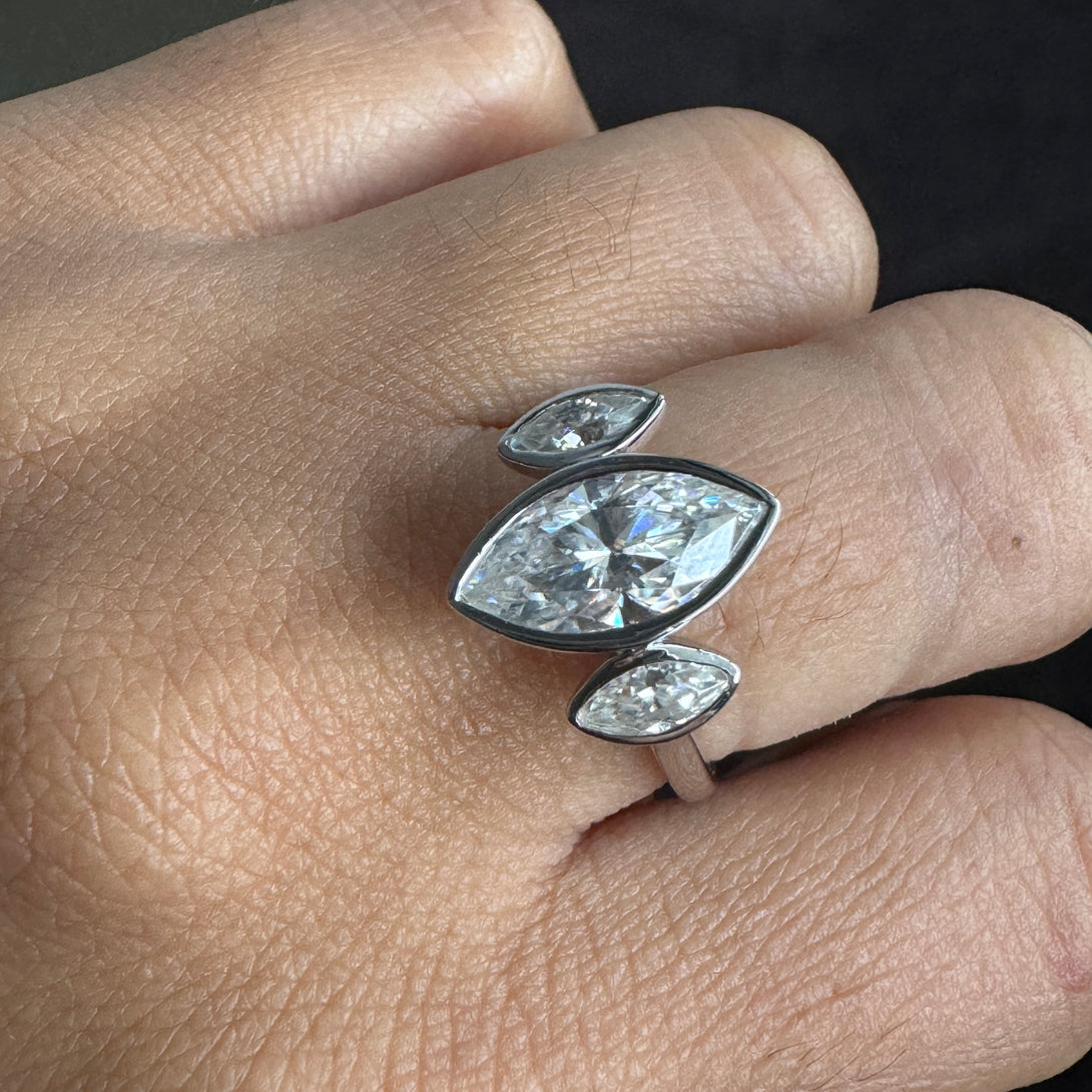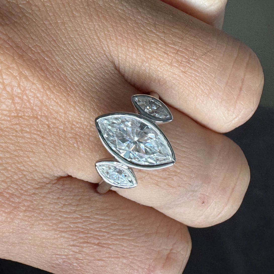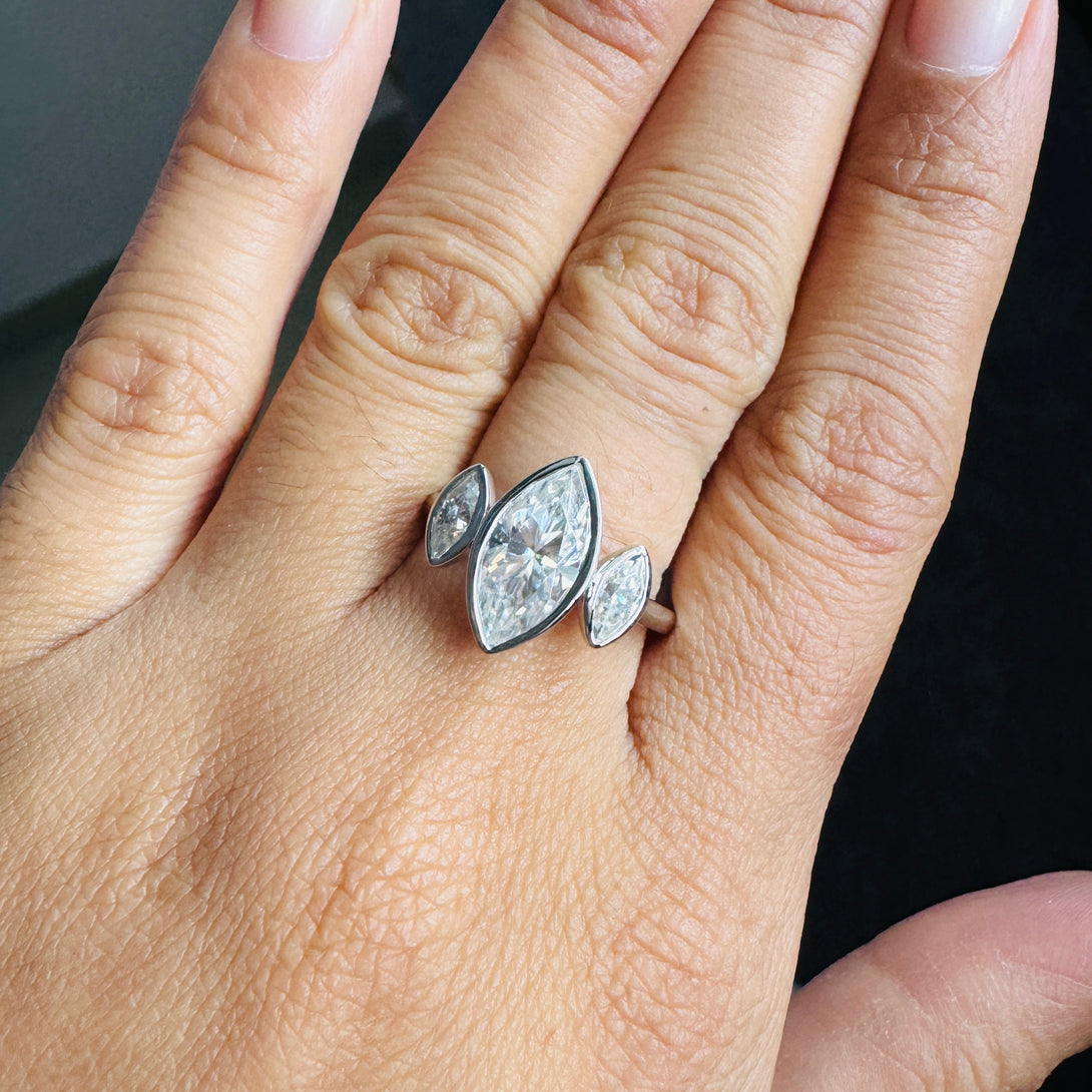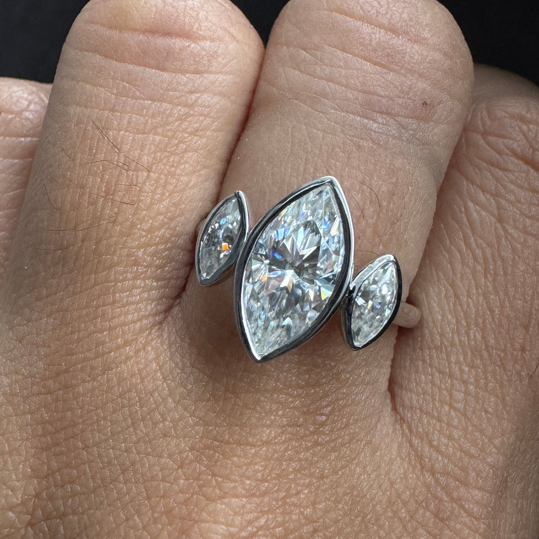 Bezel Set Marquise Three Stone Ring Colorless Moissanite Engagement Ring