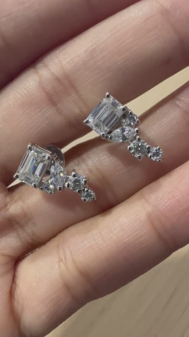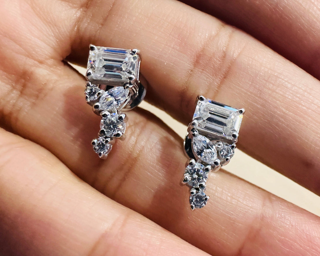 2 CTW Emerald Cut Moissanite Earrings Solid Gold Cluster Studs For Her