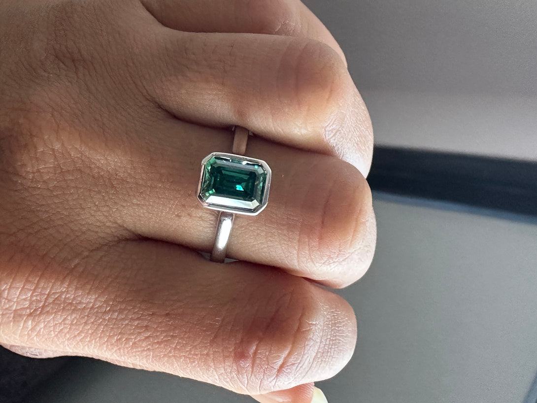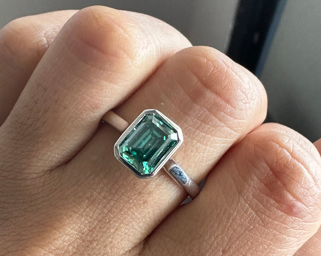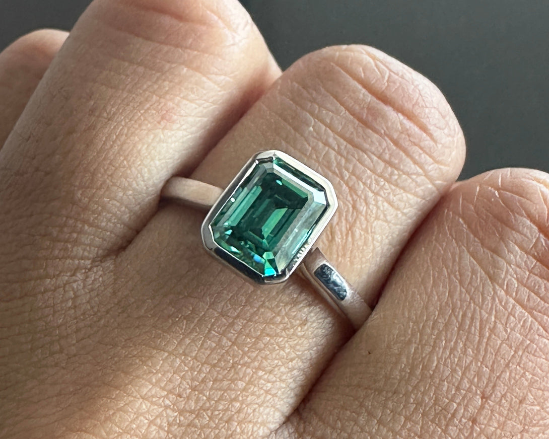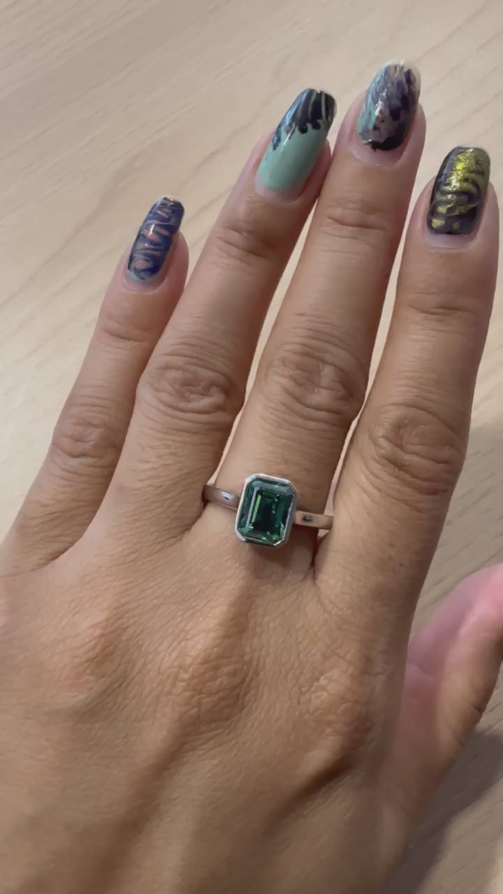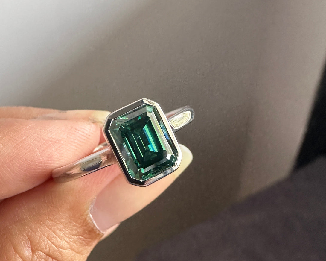 Bezel Set Emerald Cut Moissanite Engagement Ring 18K White Gold Solitaire Wedding Ring