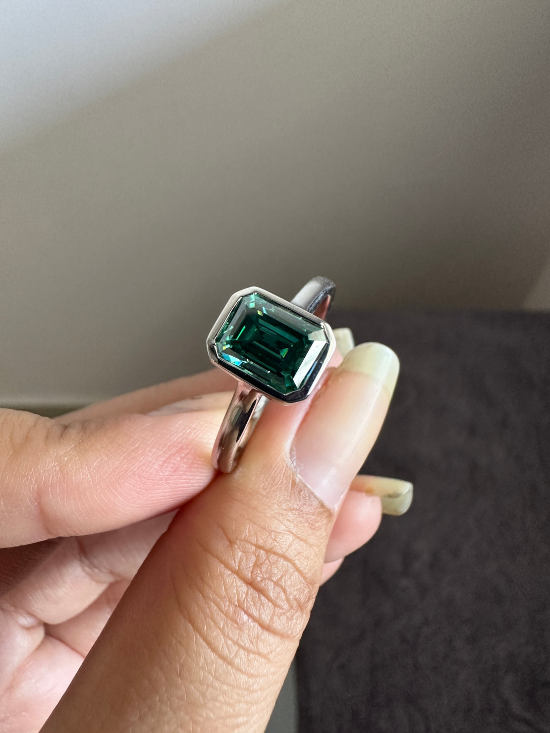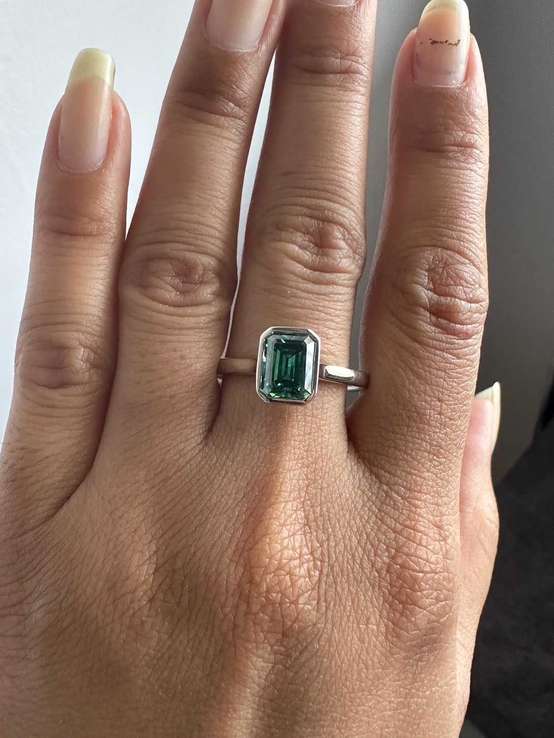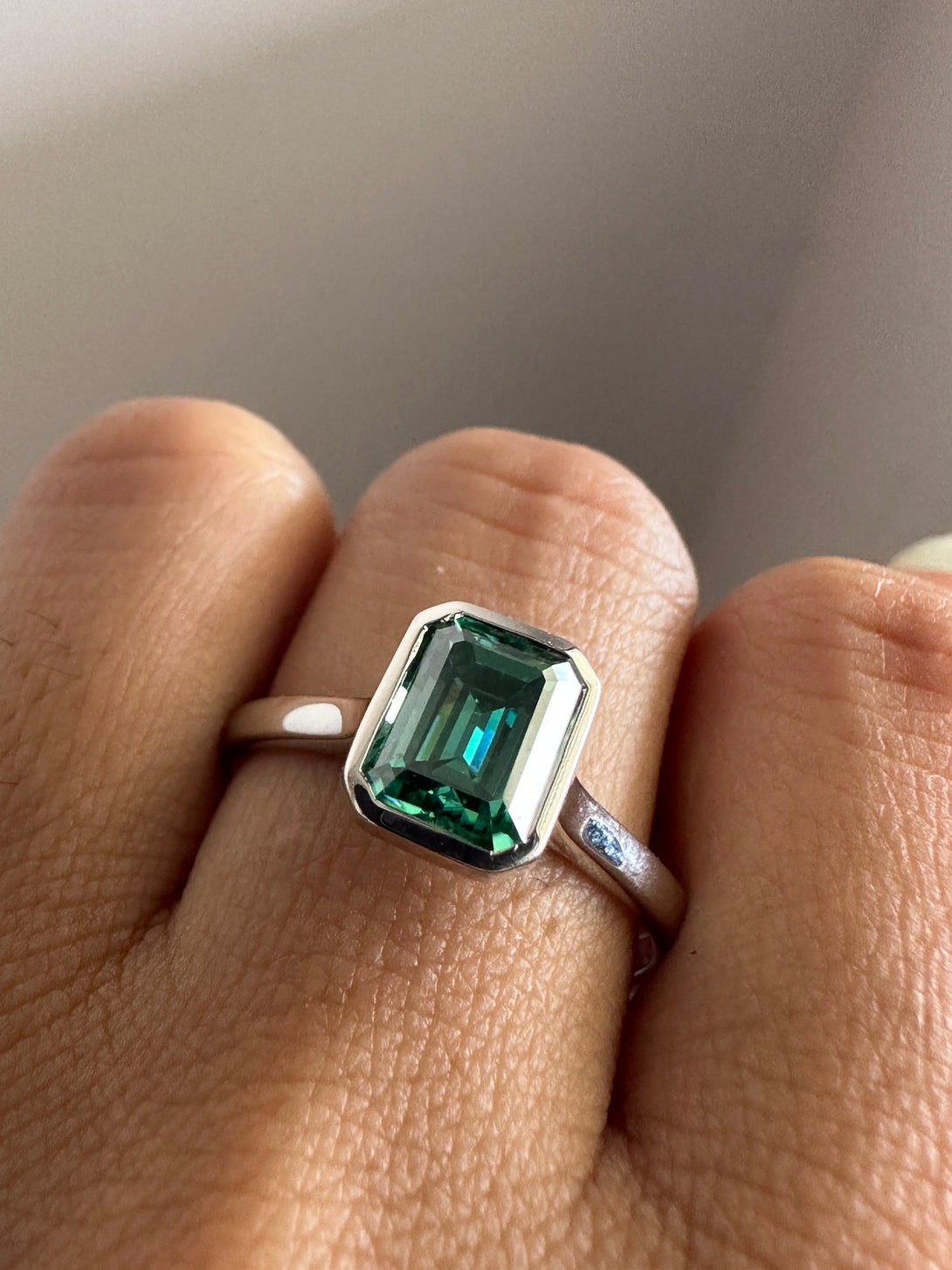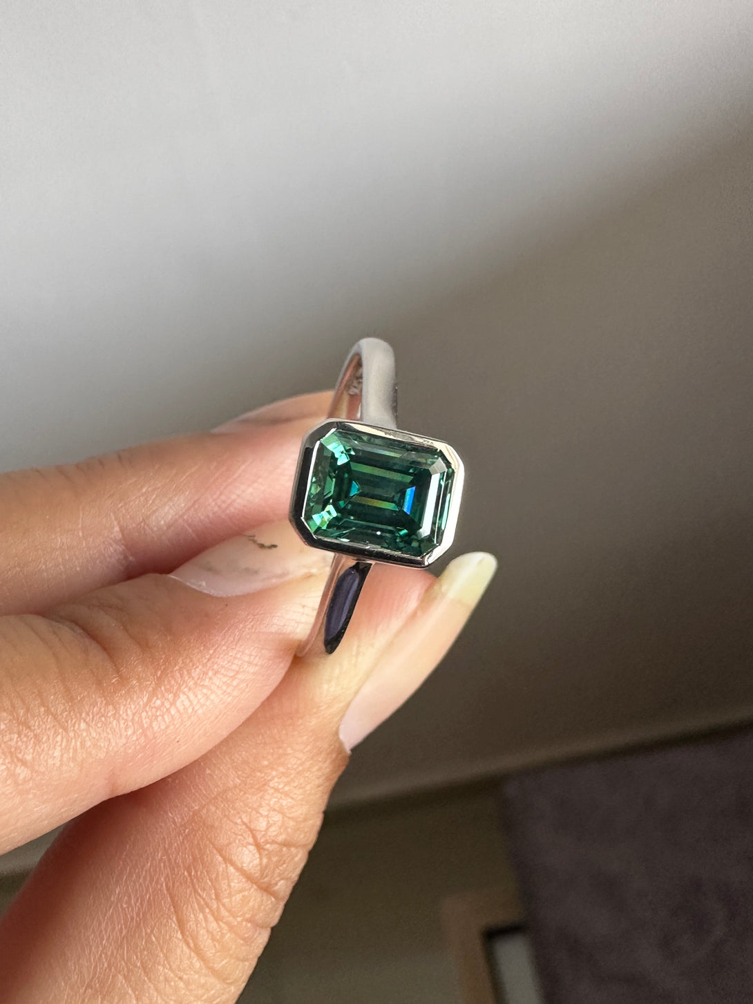 Bezel Set Emerald Cut Moissanite Engagement Ring 18K White Gold Solitaire Wedding Ring