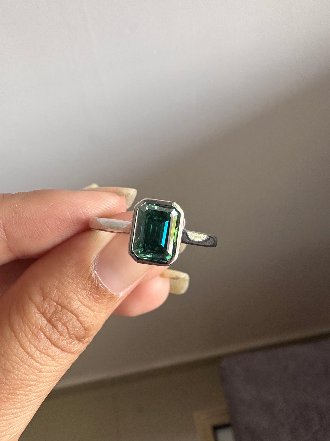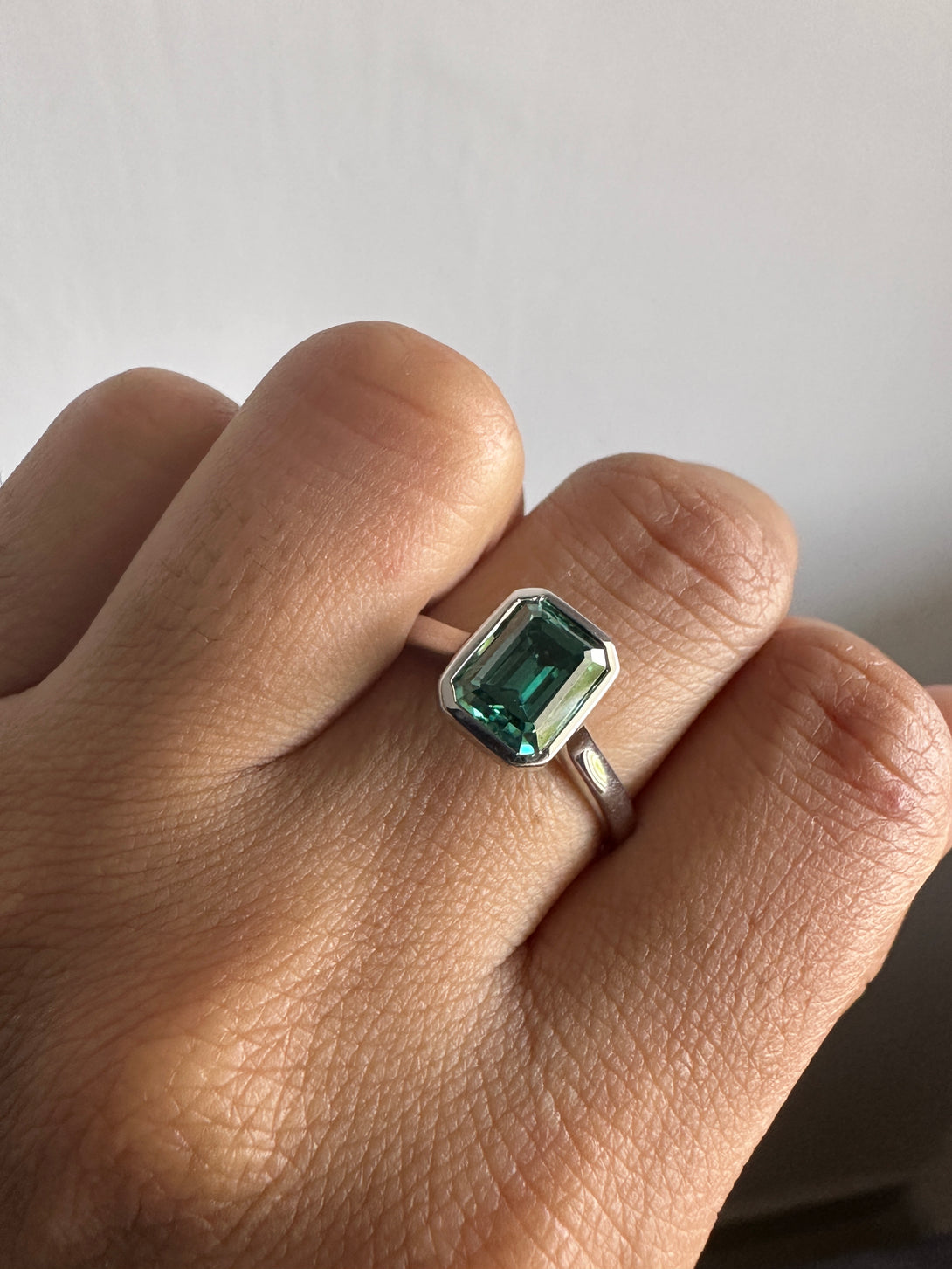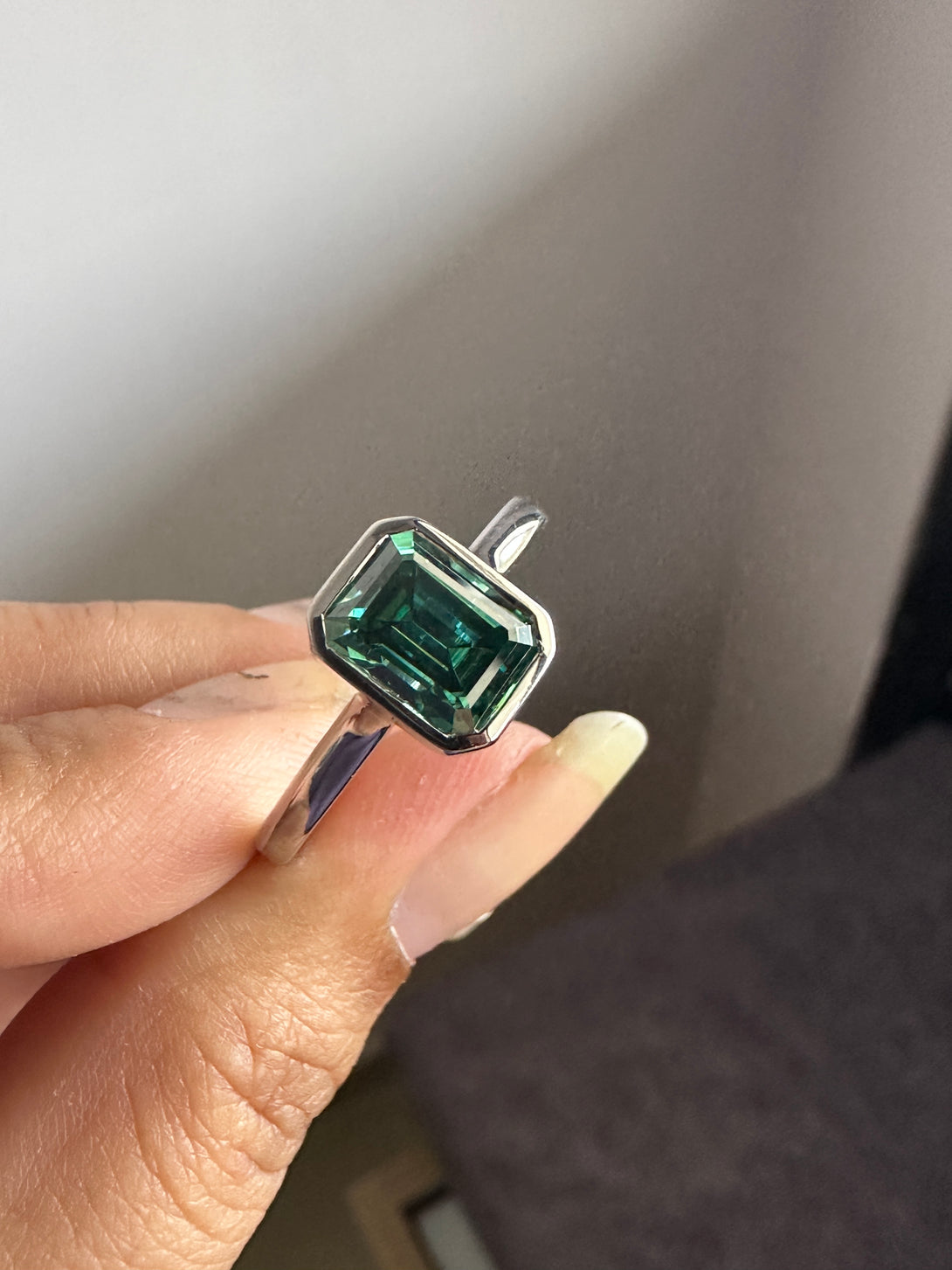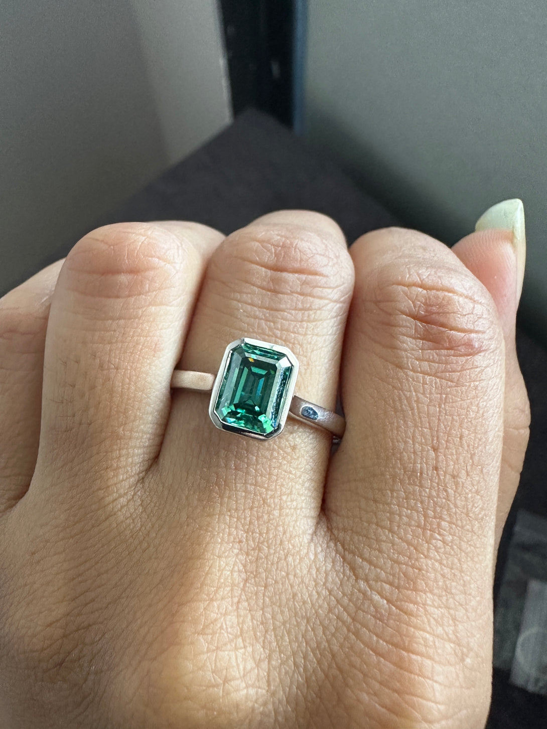 Bezel Set Emerald Cut Moissanite Engagement Ring 18K White Gold Solitaire Wedding Ring