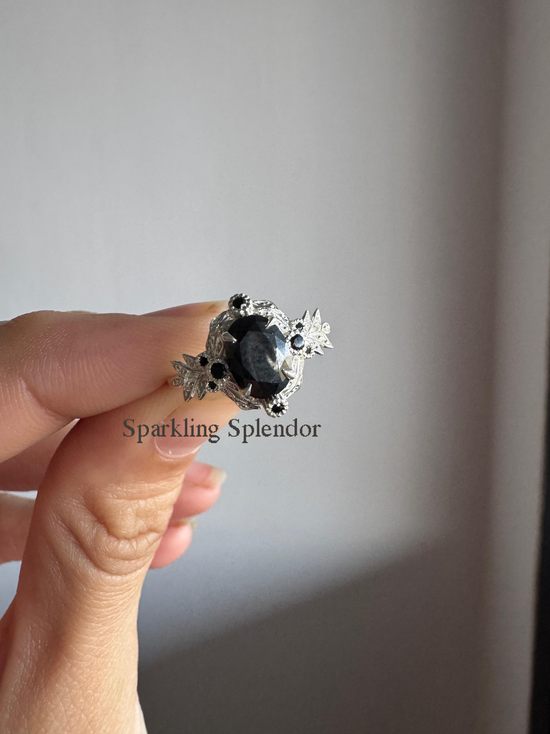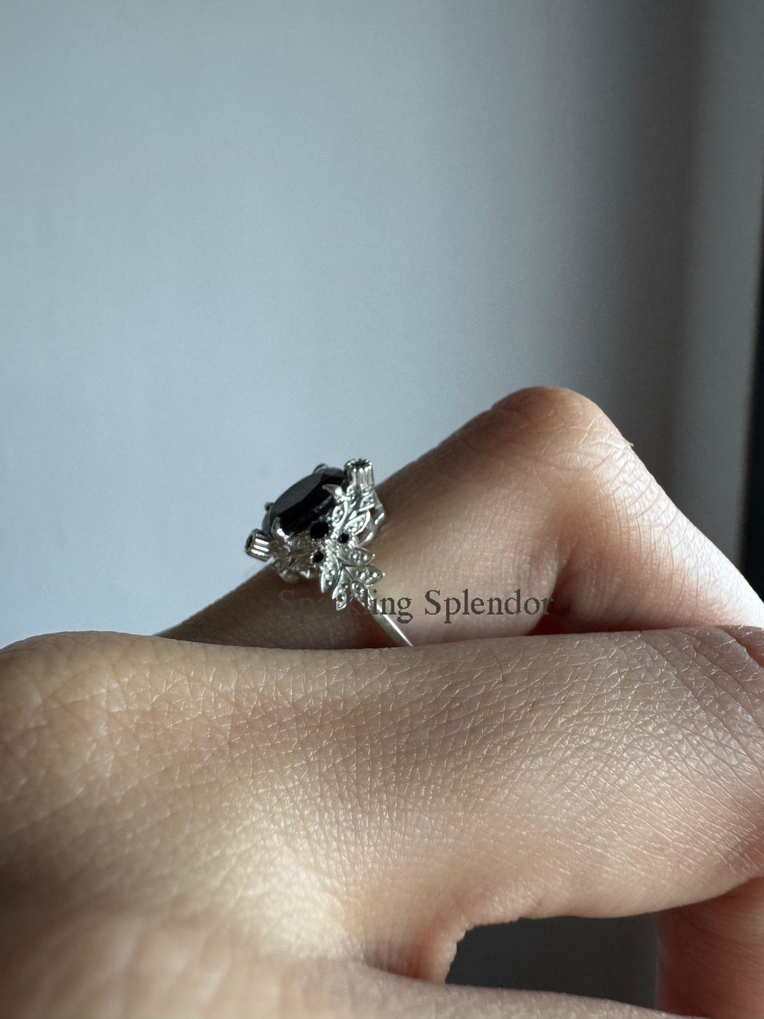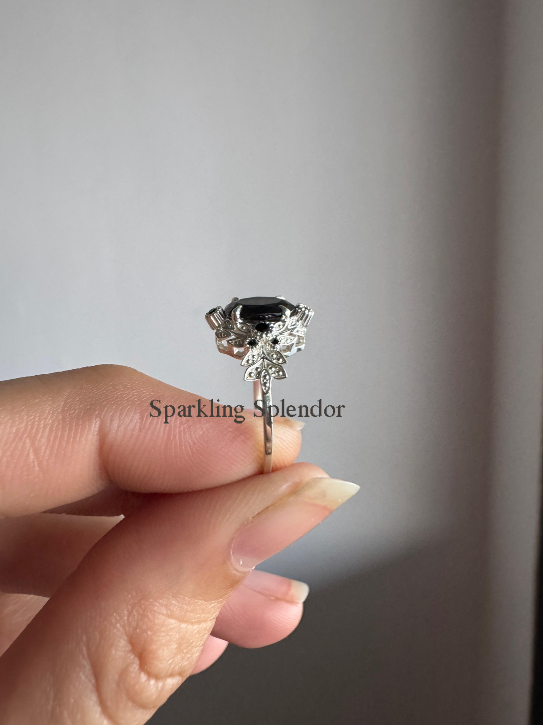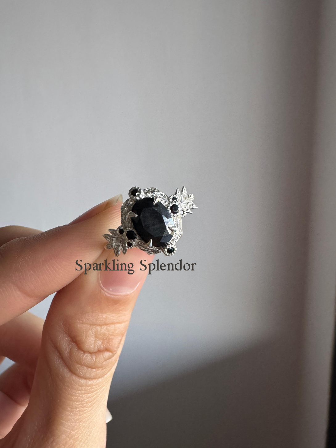Vintage Art Deco Oval Cut Floral Engagement Ring Black Wedding Ring For Her