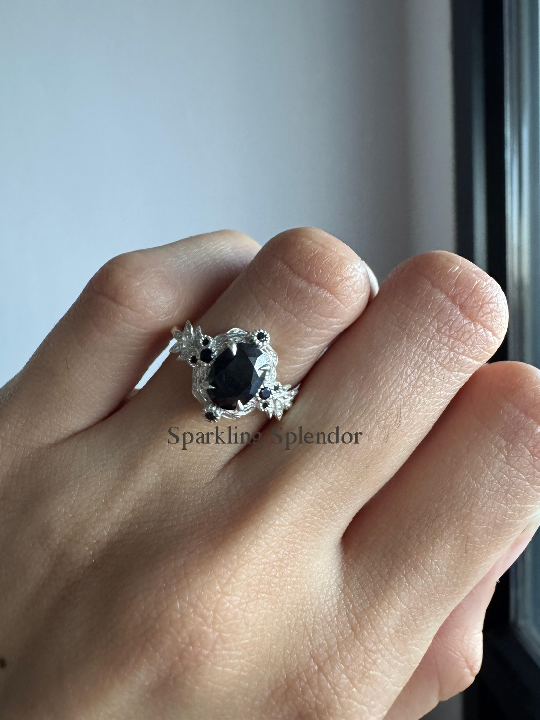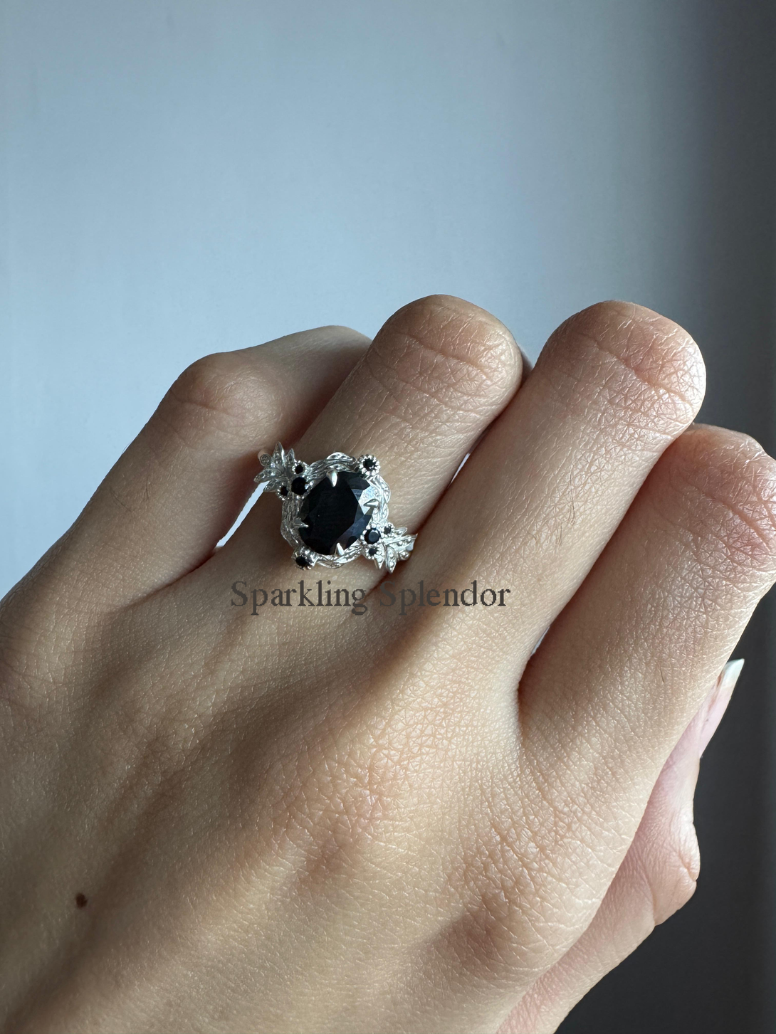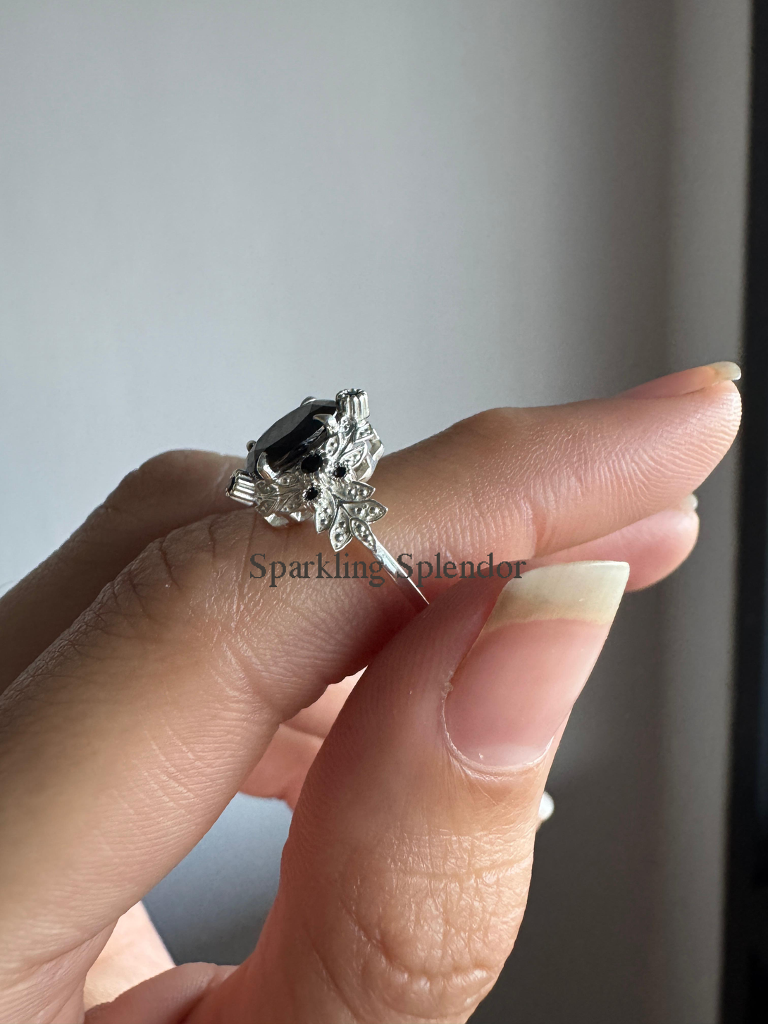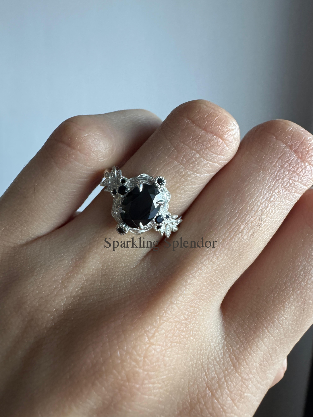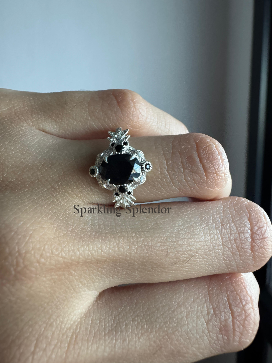 Vintage Art Deco Oval Cut Floral Engagement Ring Black Wedding Ring For Her