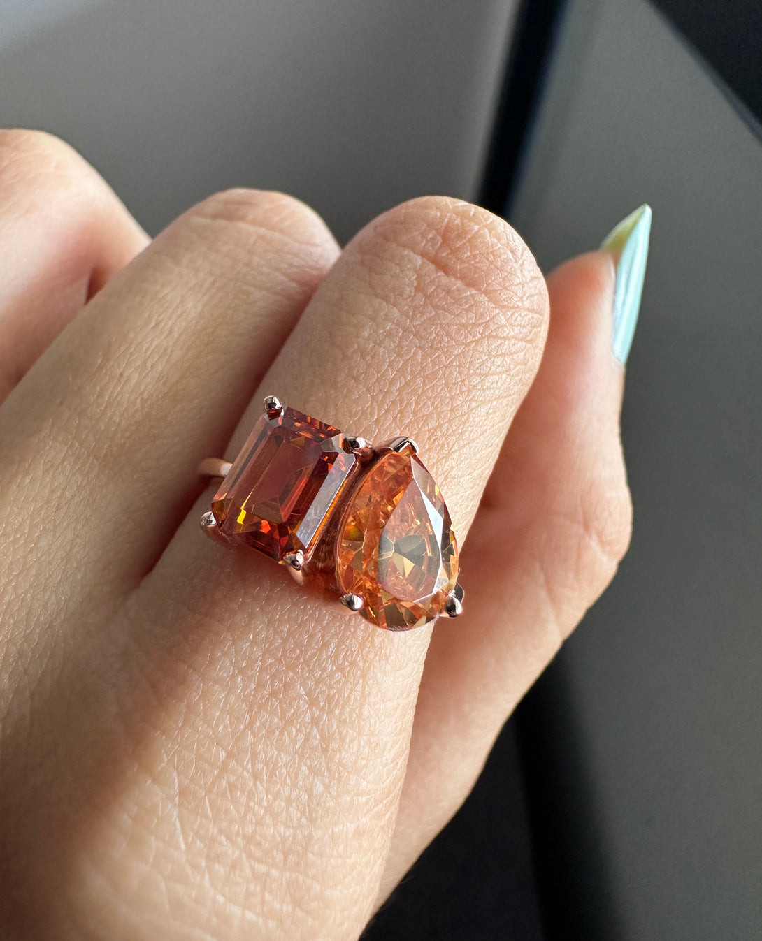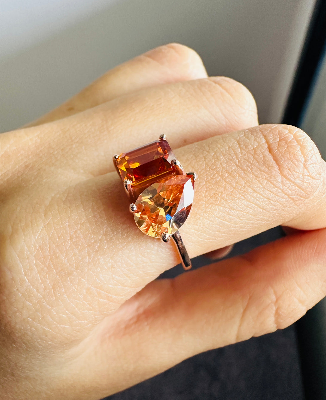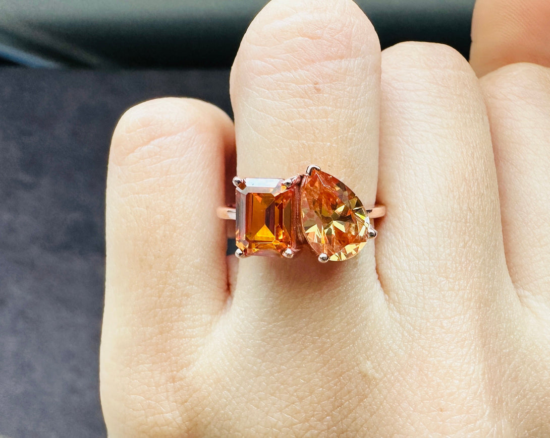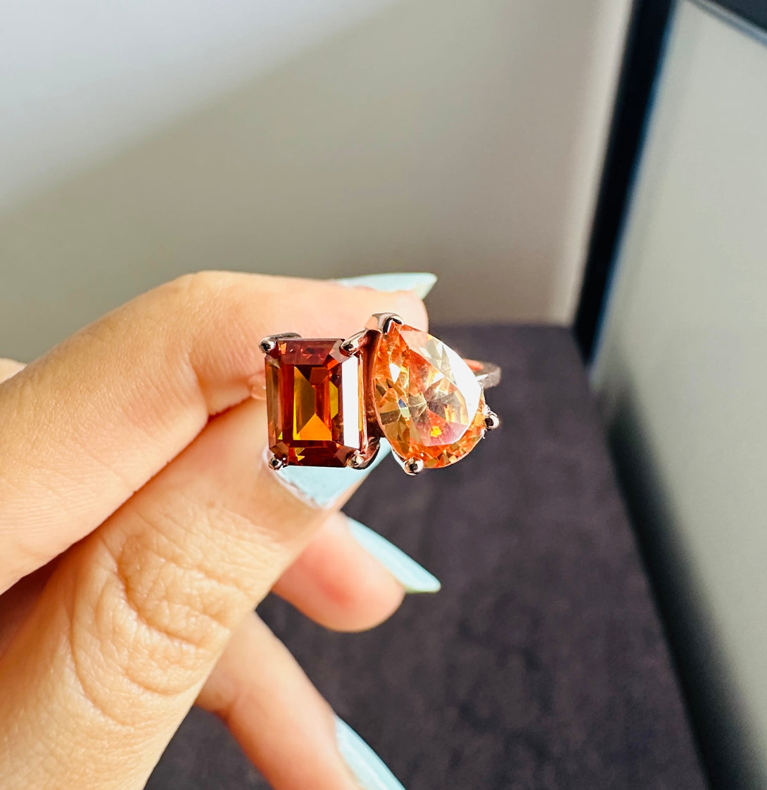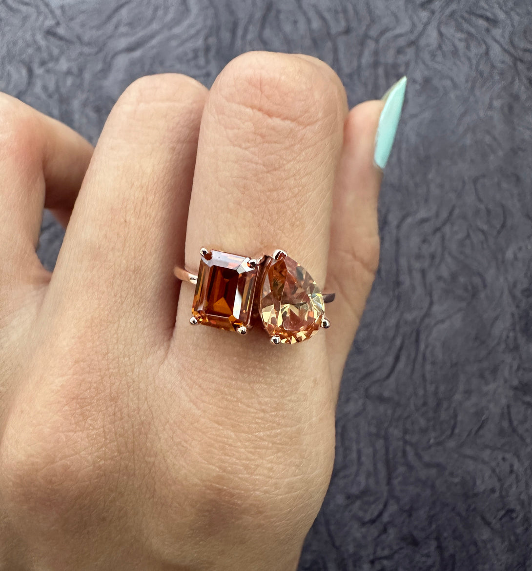 Dark Brown CZ Diamond Ring Champagne Pear & Emerald Cut Toi Et Moi Engagement Ring