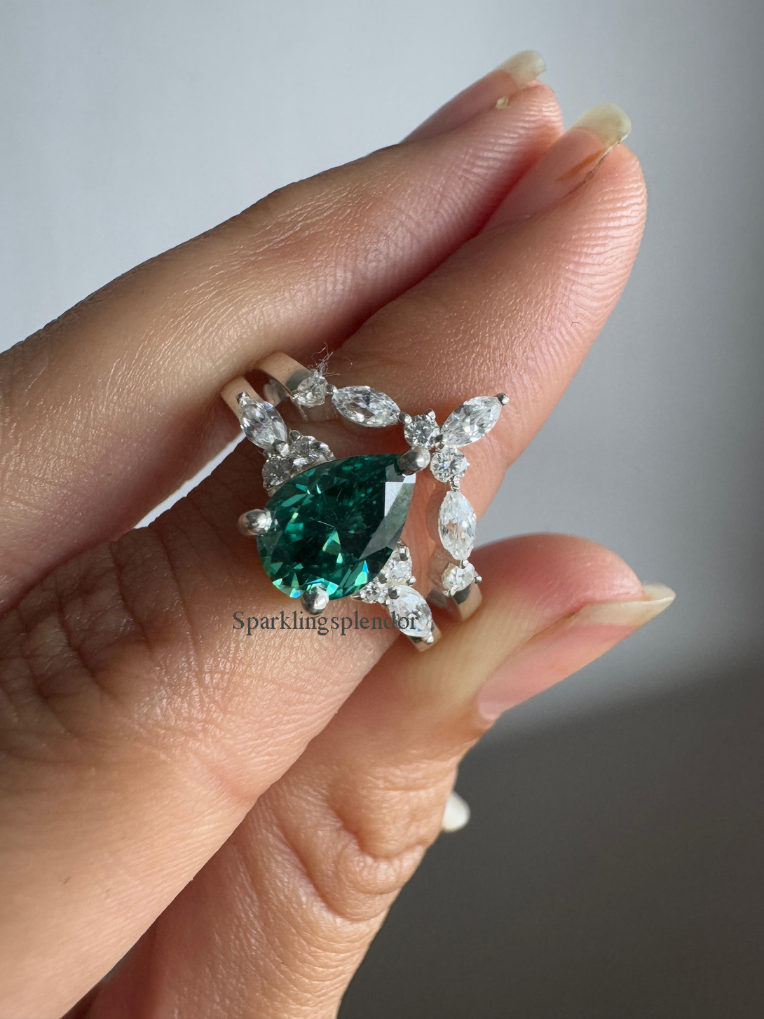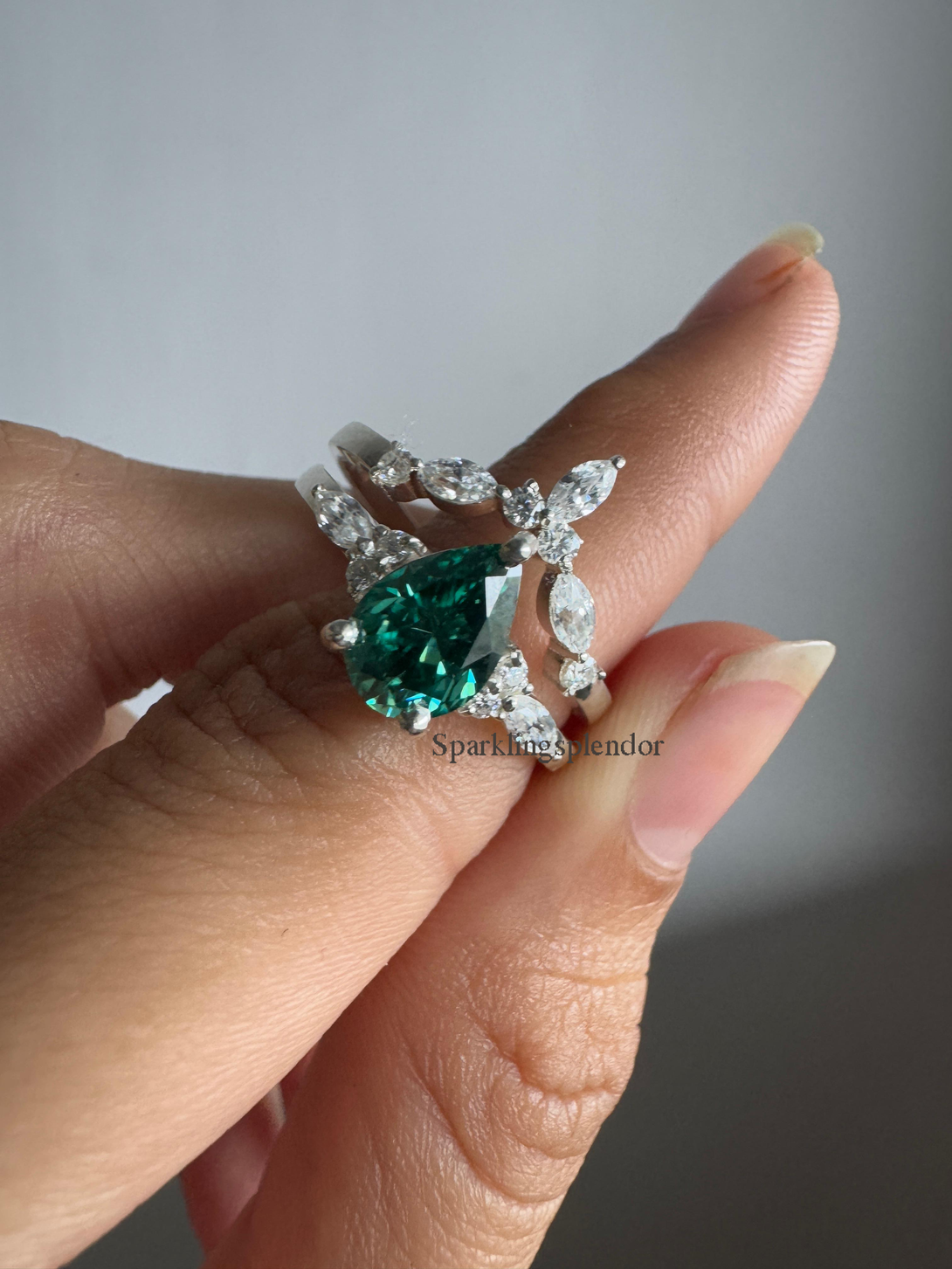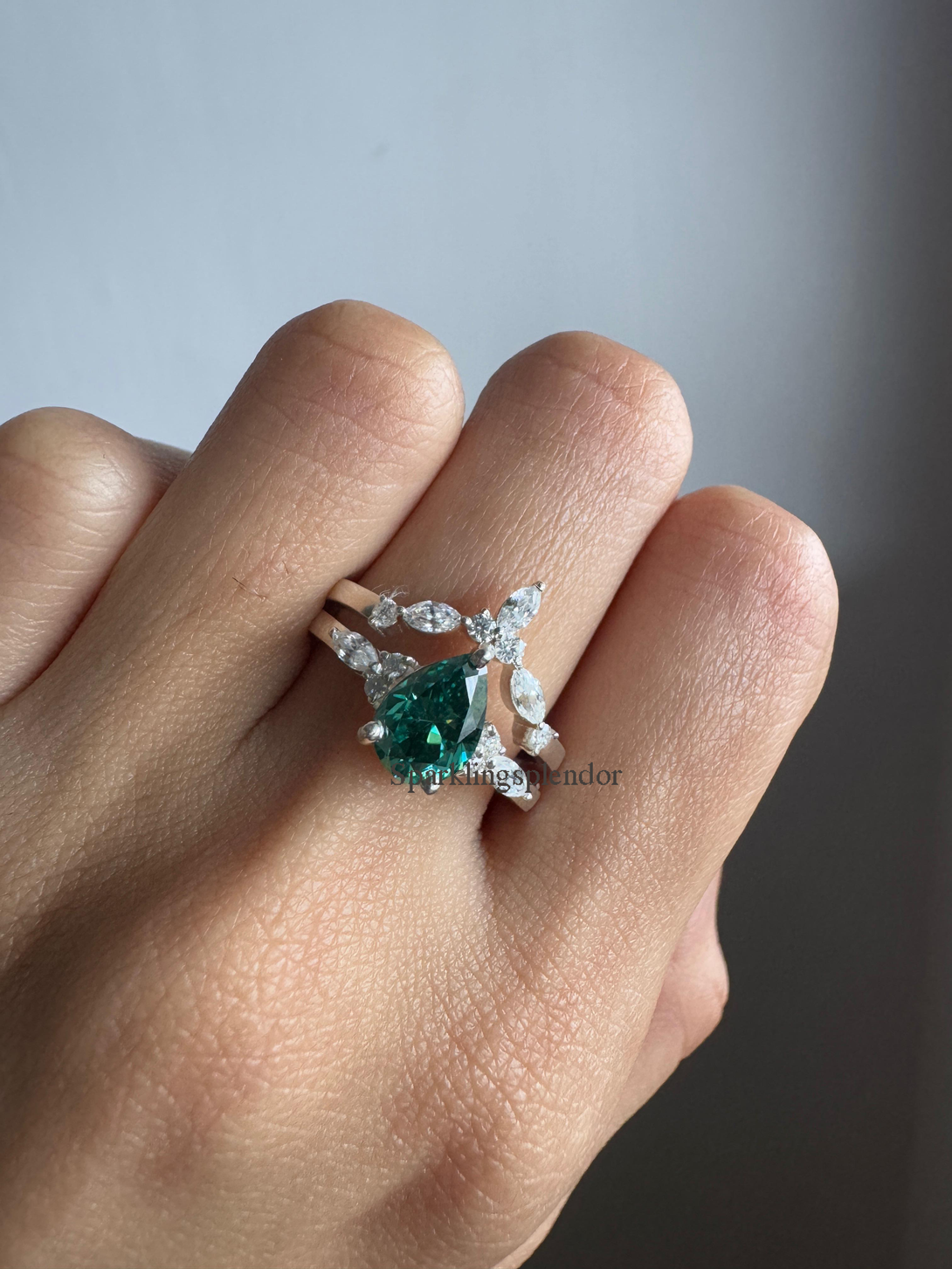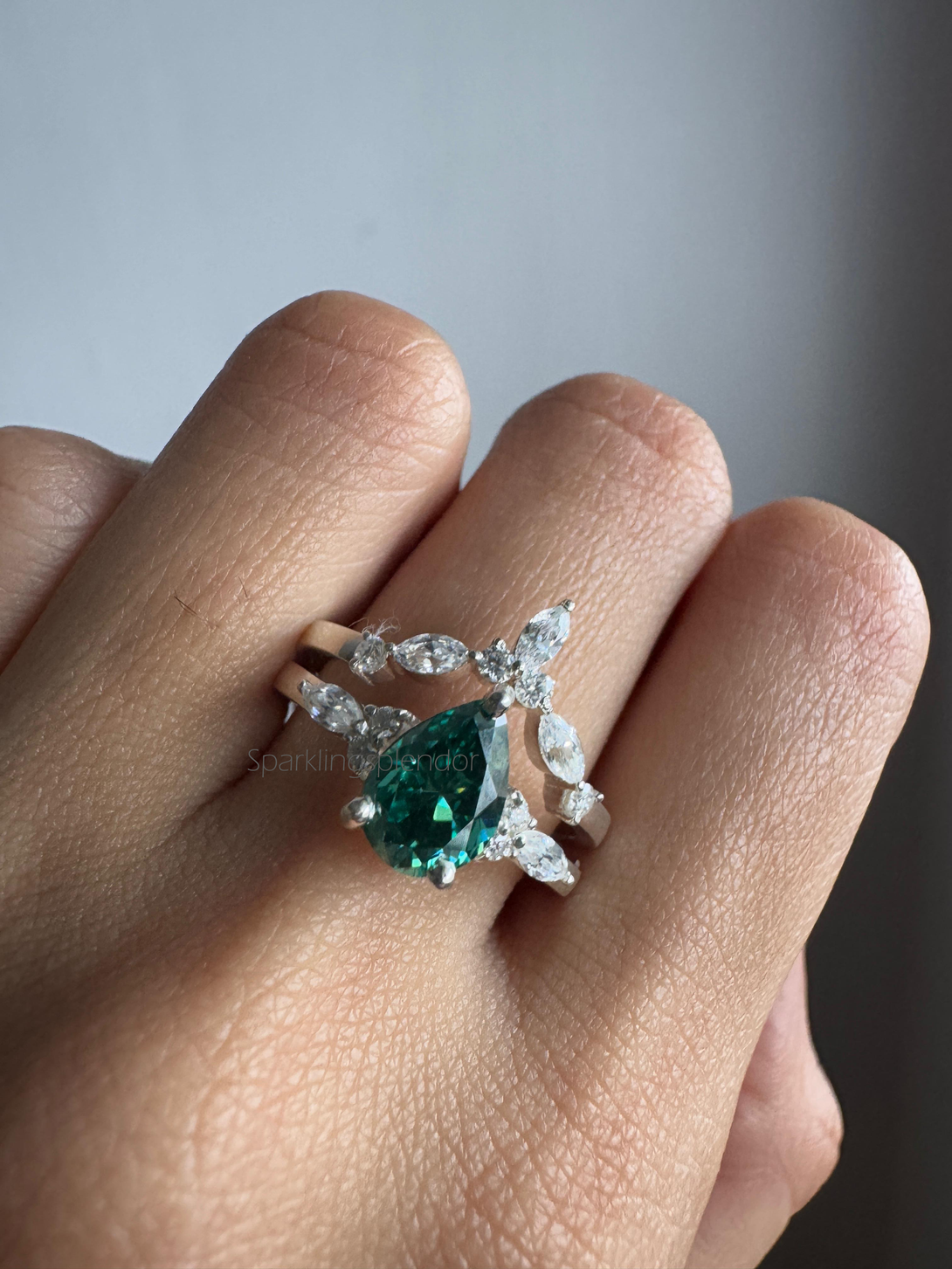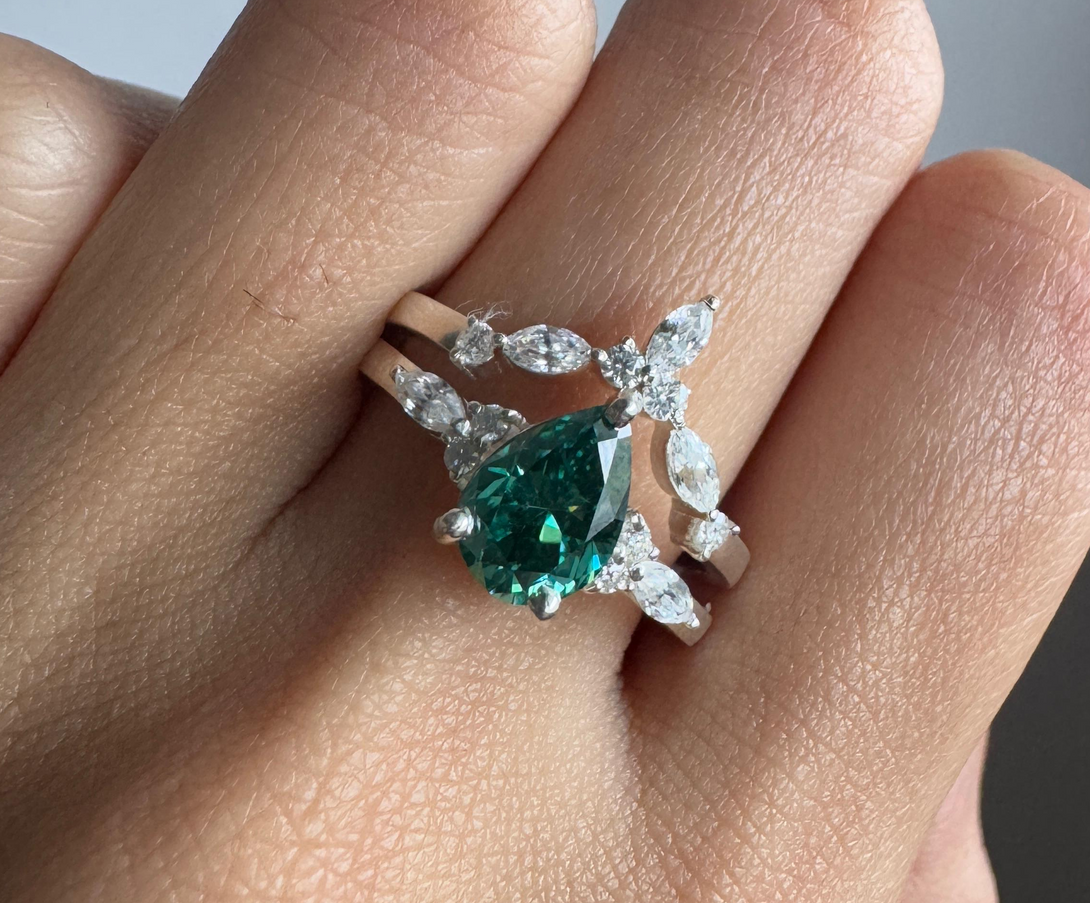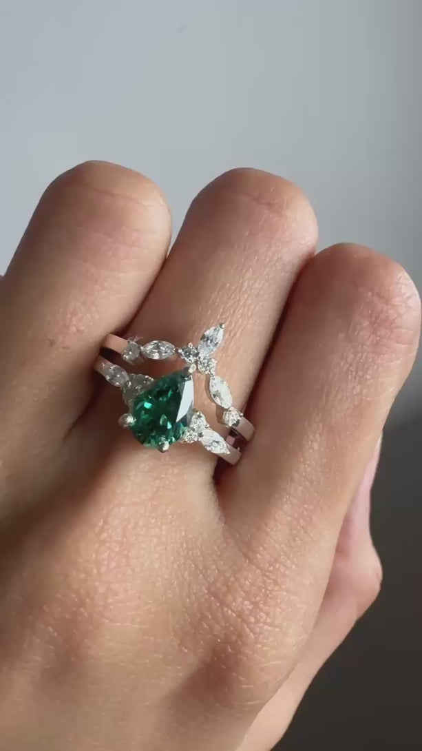 Green Pear Cut Moissanite Engagement Ring With Matching Band Wedding Ring Set