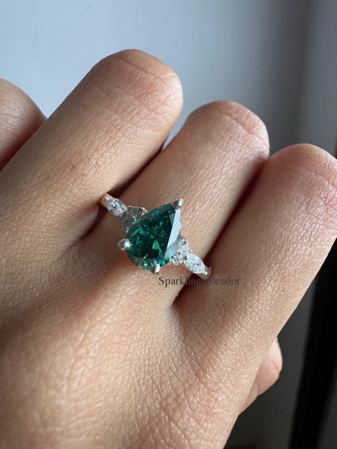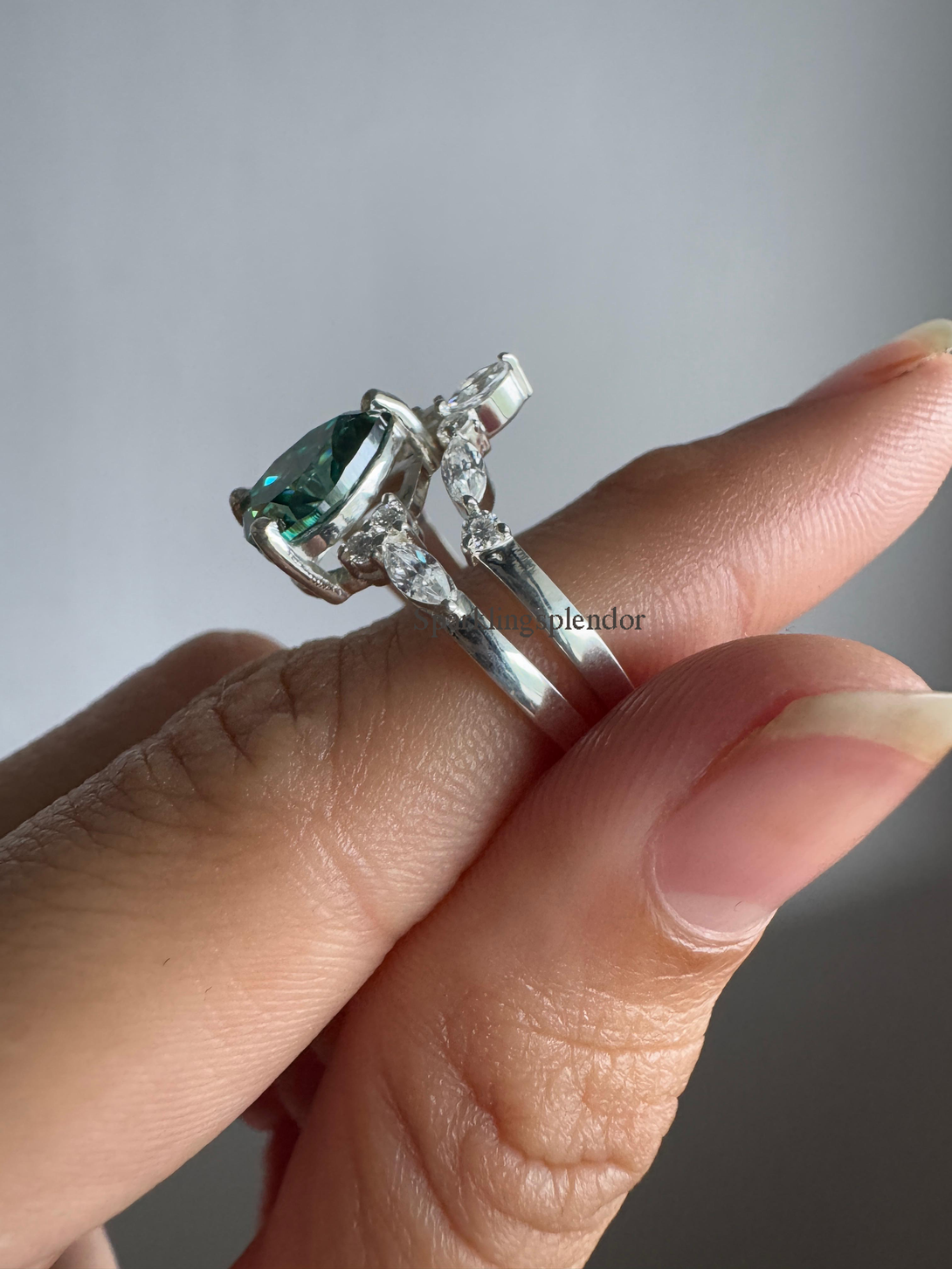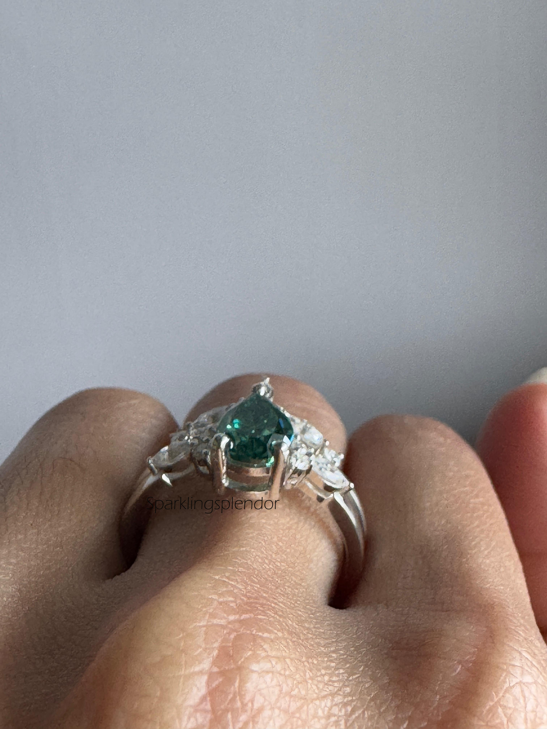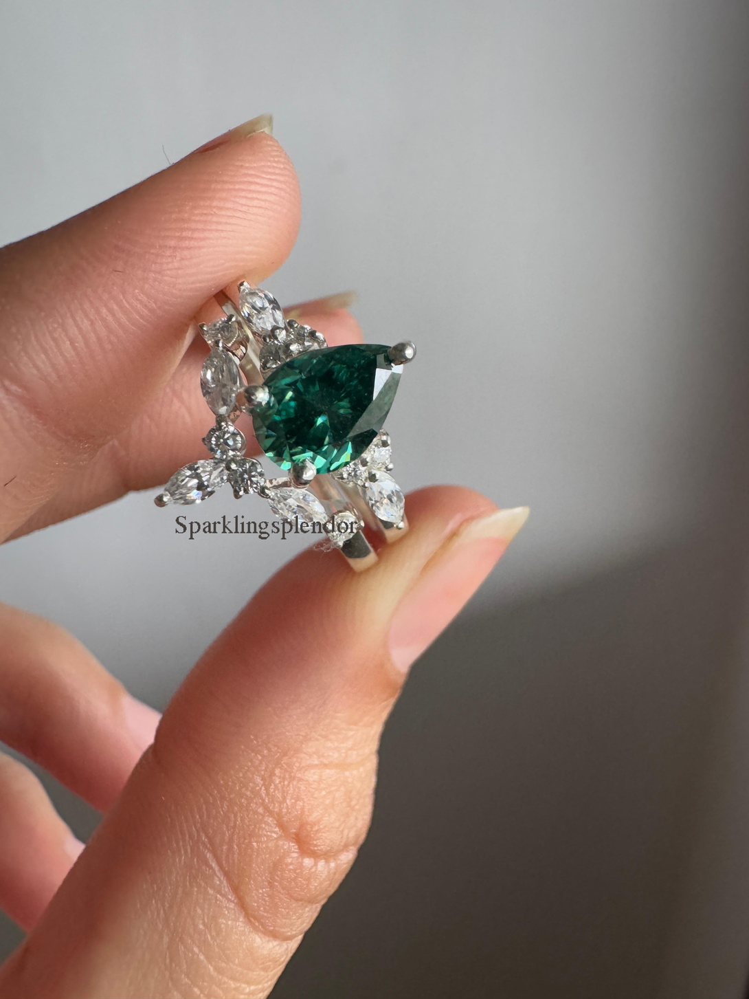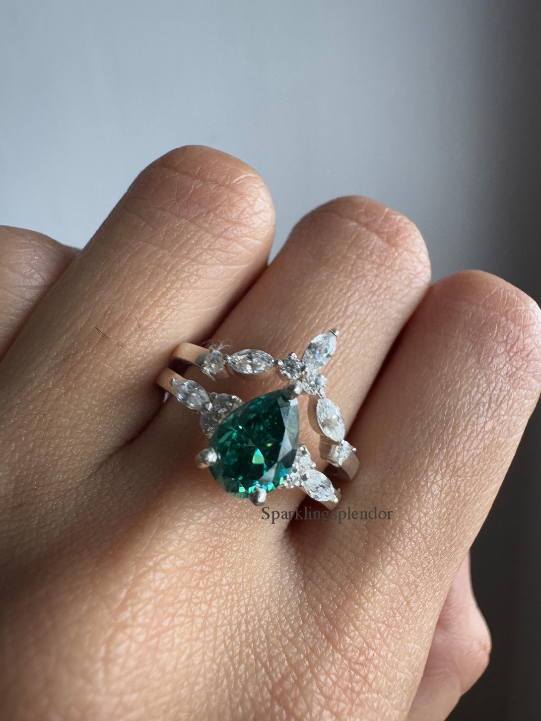 Green Pear Cut Moissanite Engagement Ring With Matching Band Wedding Ring Set