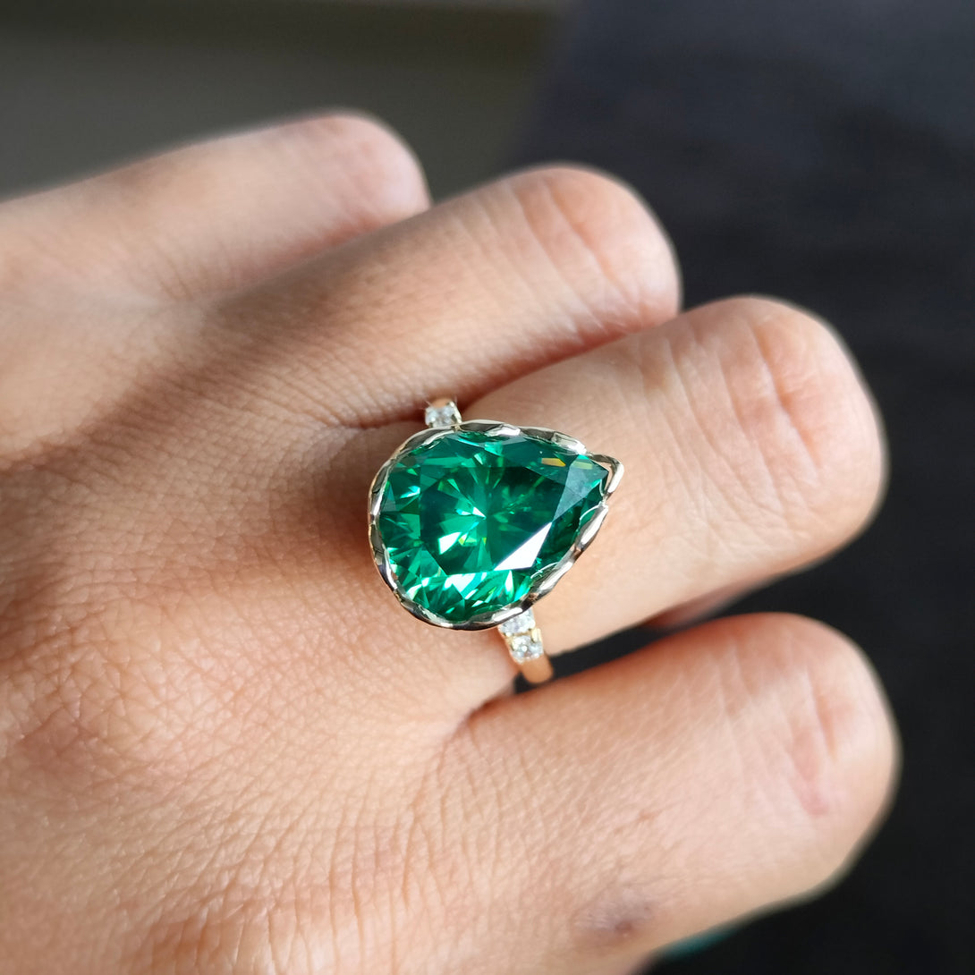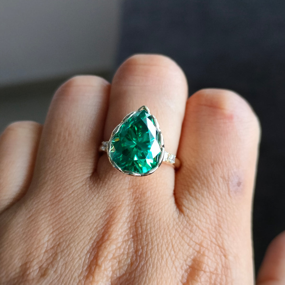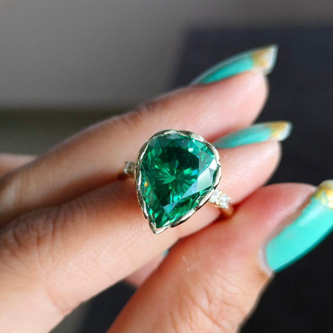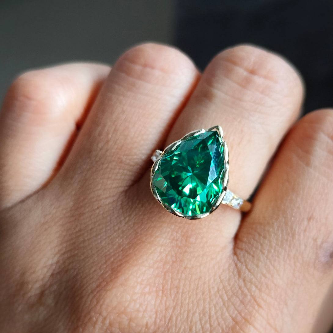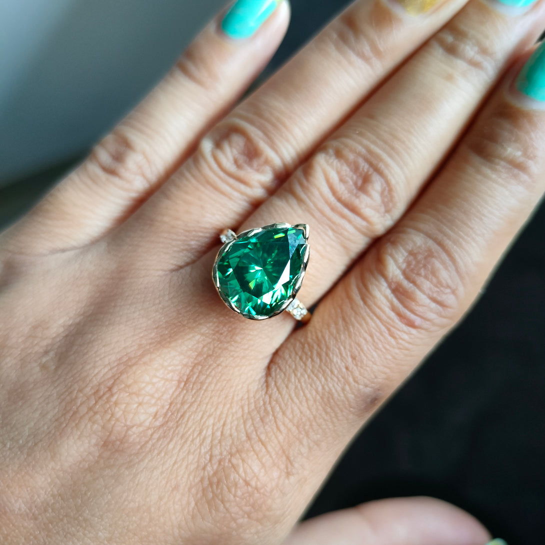 Pear Cut Big Engagement Ring 18K Gold Dark Green Moissanite Wedding Ring