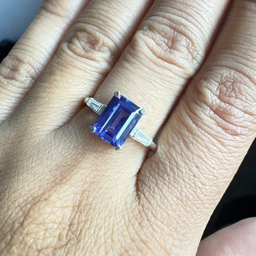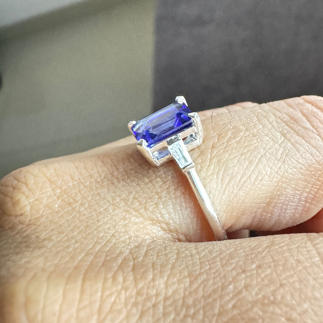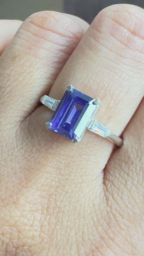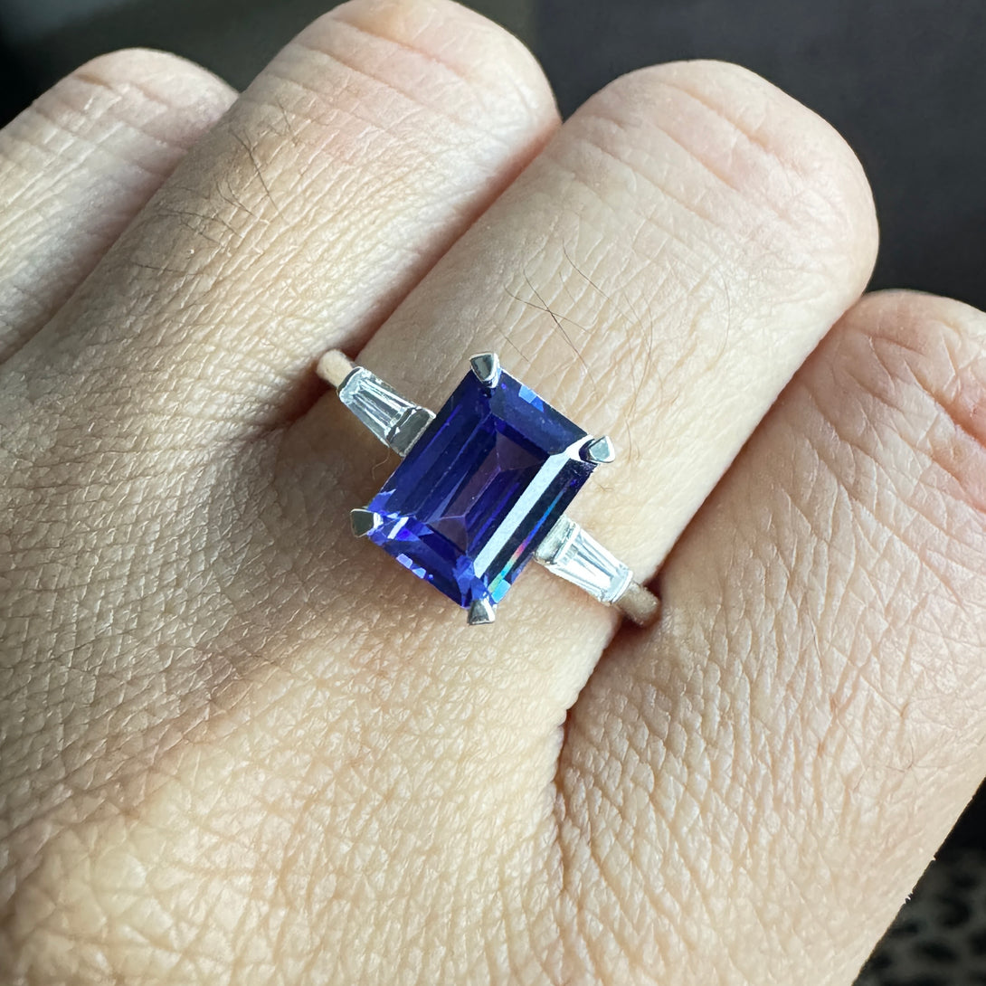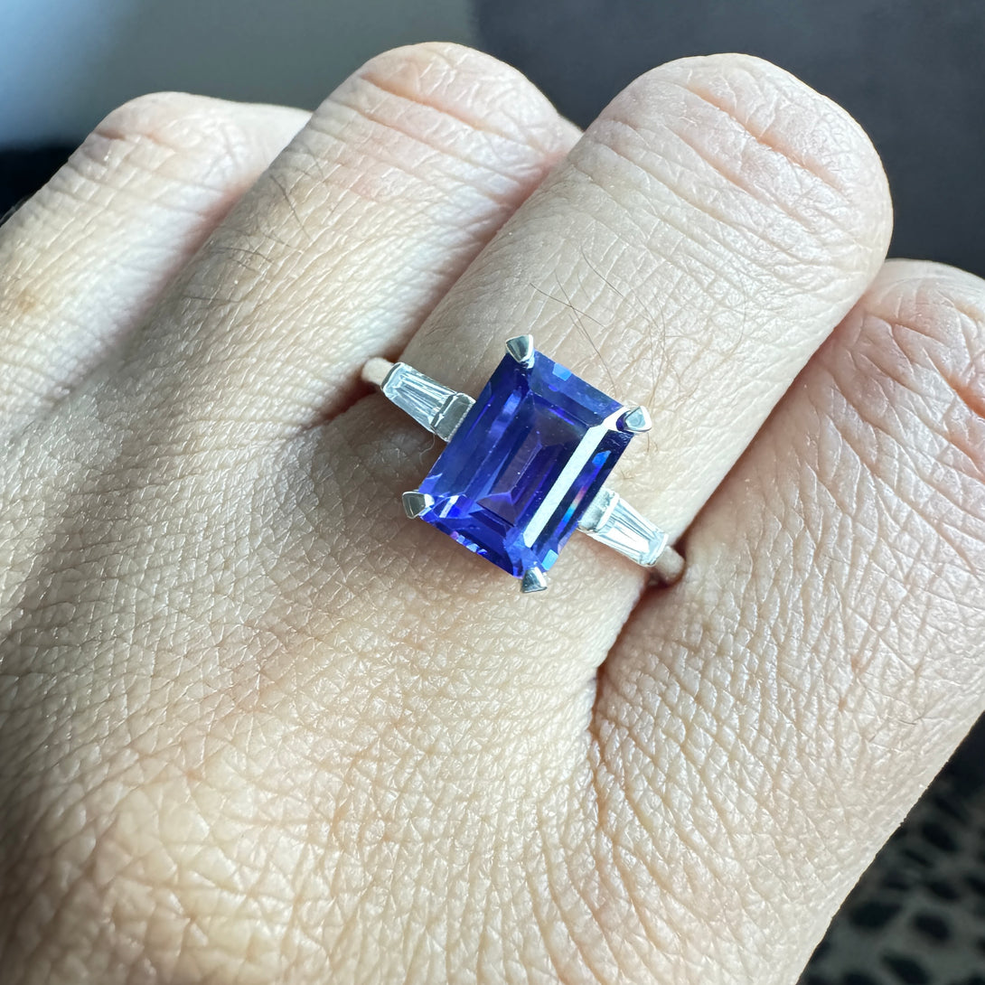 Dark Blue Emerald Cut CZ Diamond Ring Three Stone Fancy Wedding Ring