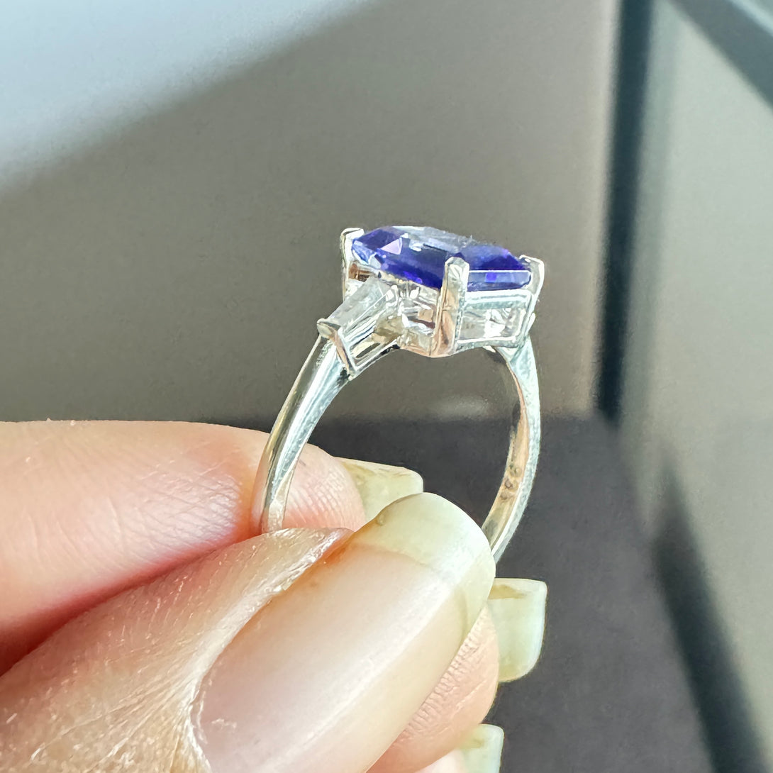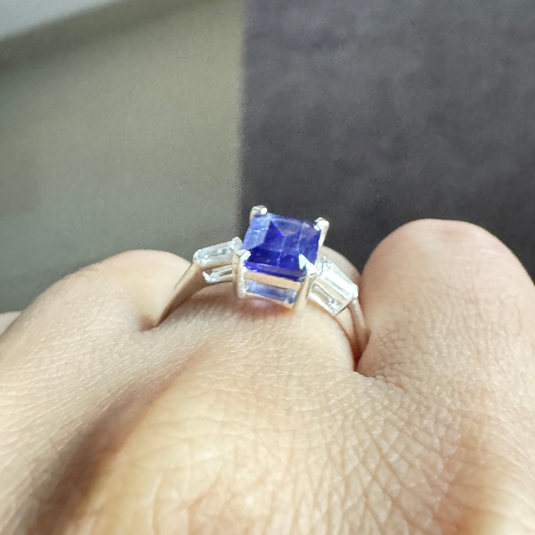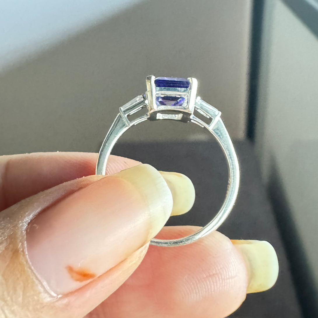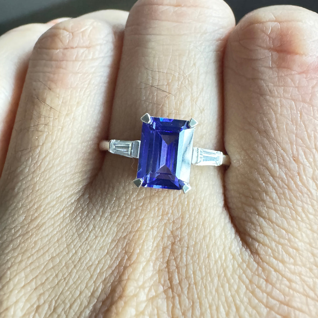 Dark Blue Emerald Cut CZ Diamond Ring Three Stone Fancy Wedding Ring