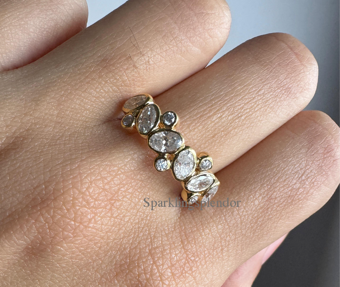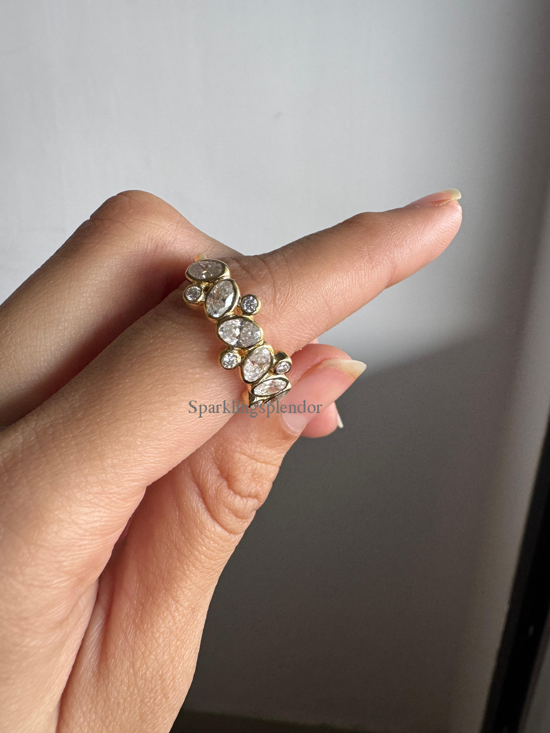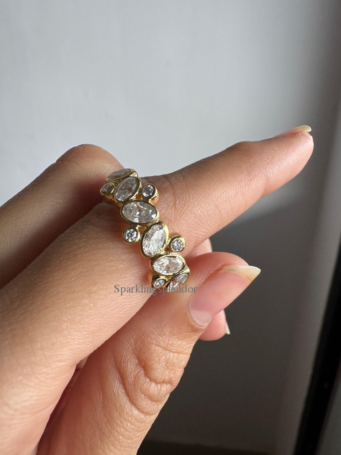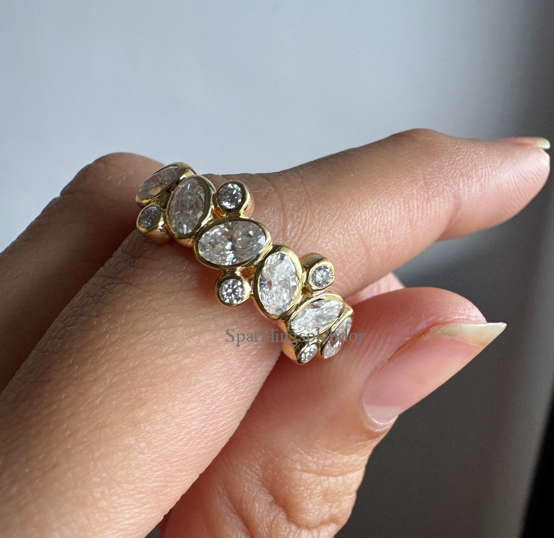 Oval Cut Moissanite Band Bezel Set Art Deco Cluster Wedding Band in Gold