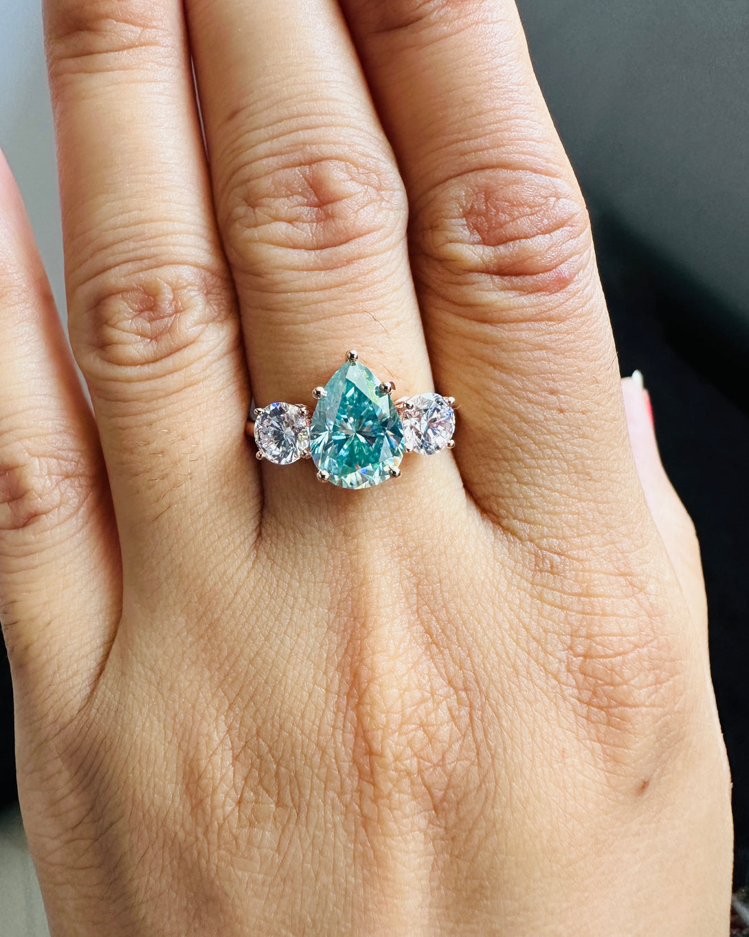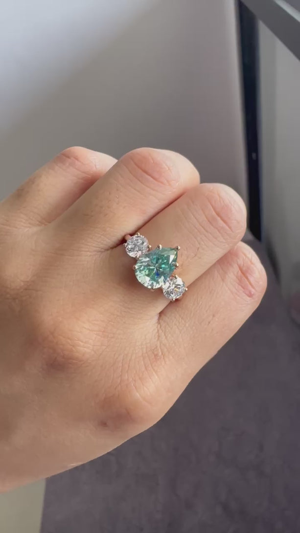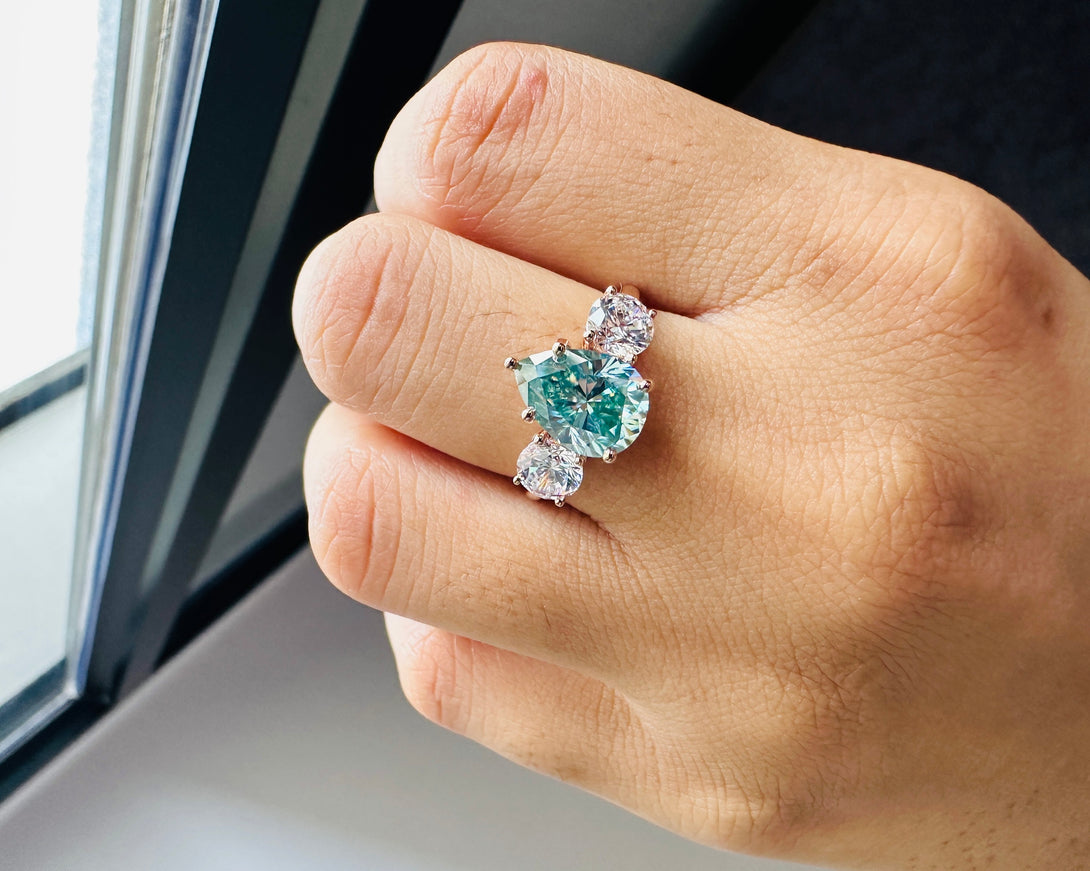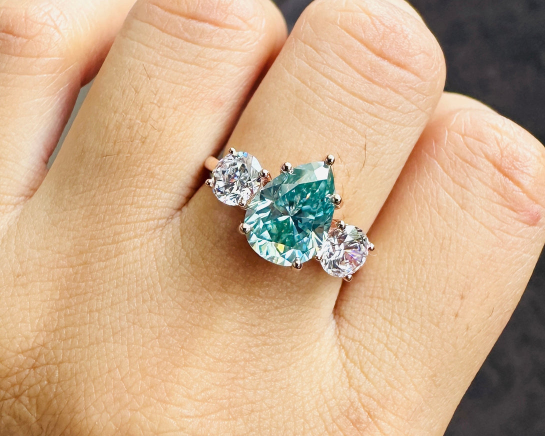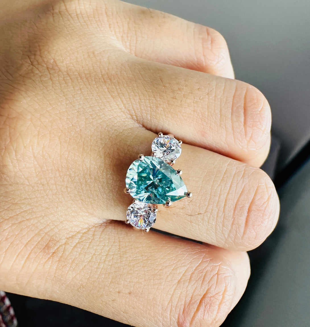 Blue Pear Cut Moissanite Three Stone Ring 18K Solid Gold Engagement Ring