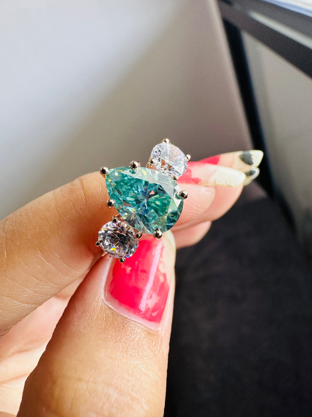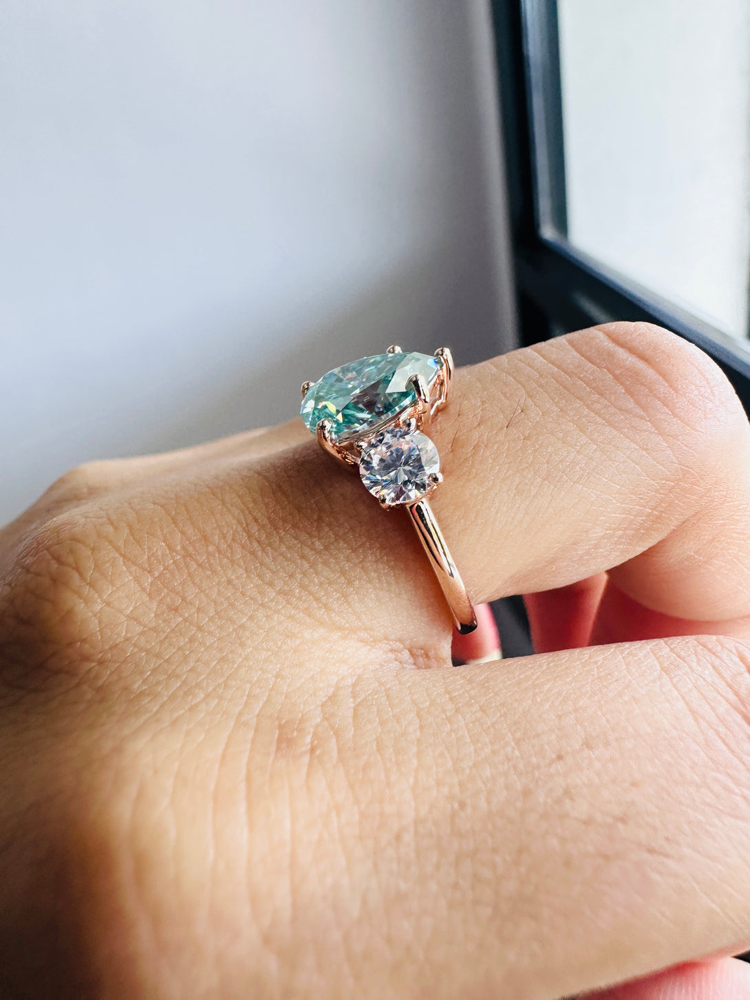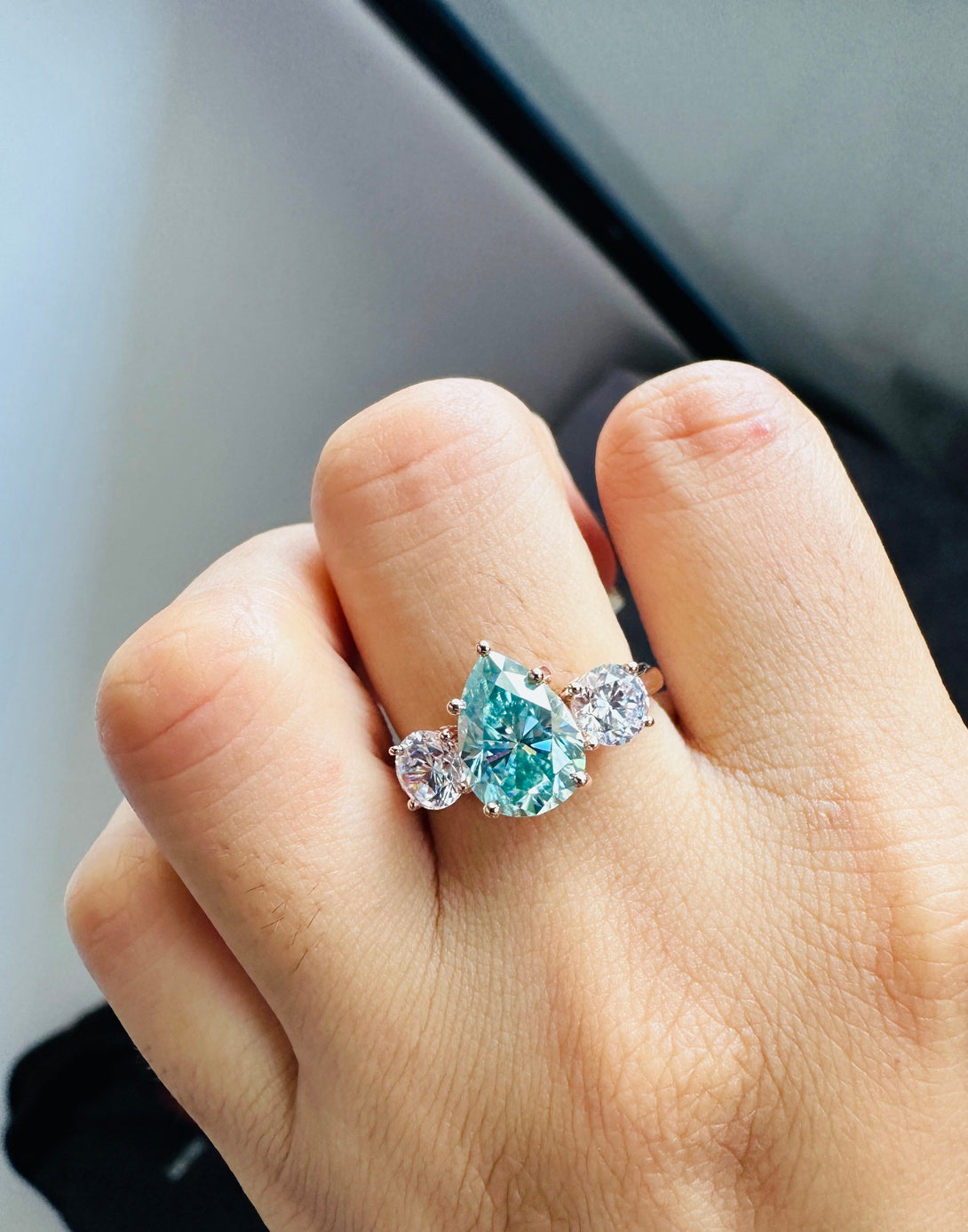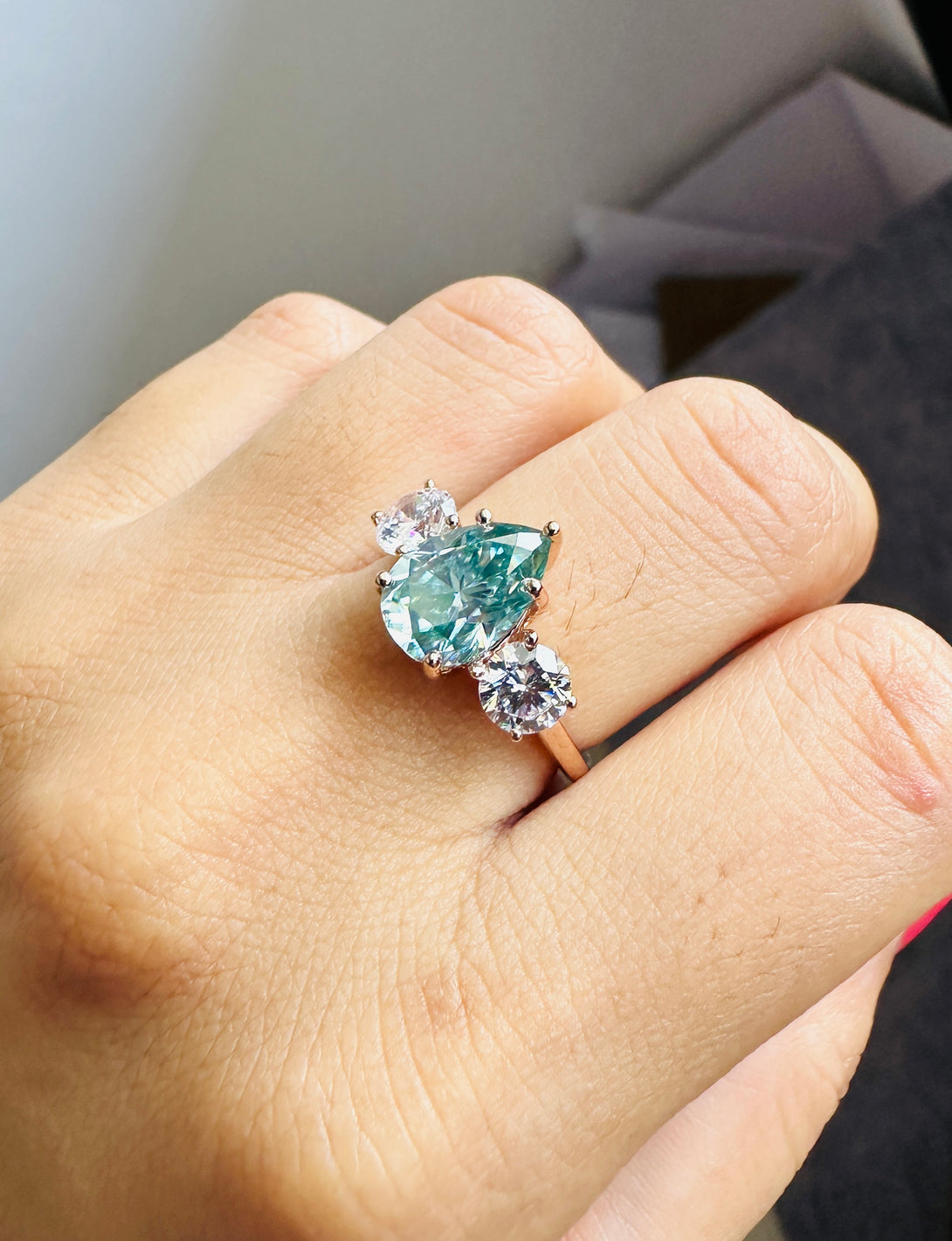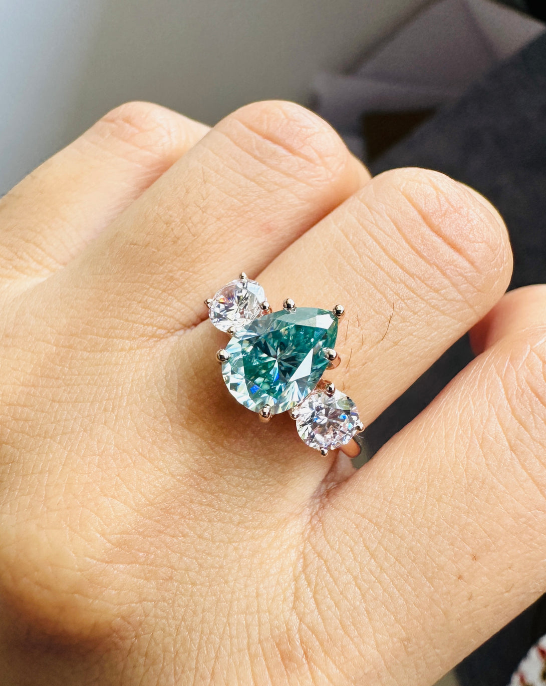 Blue Pear Cut Moissanite Three Stone Ring 18K Solid Gold Engagement Ring