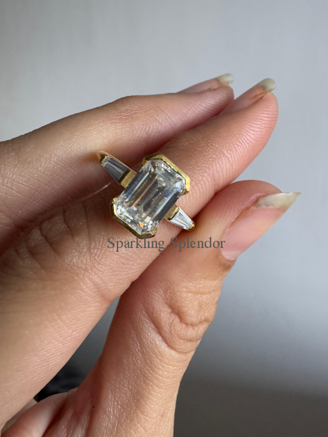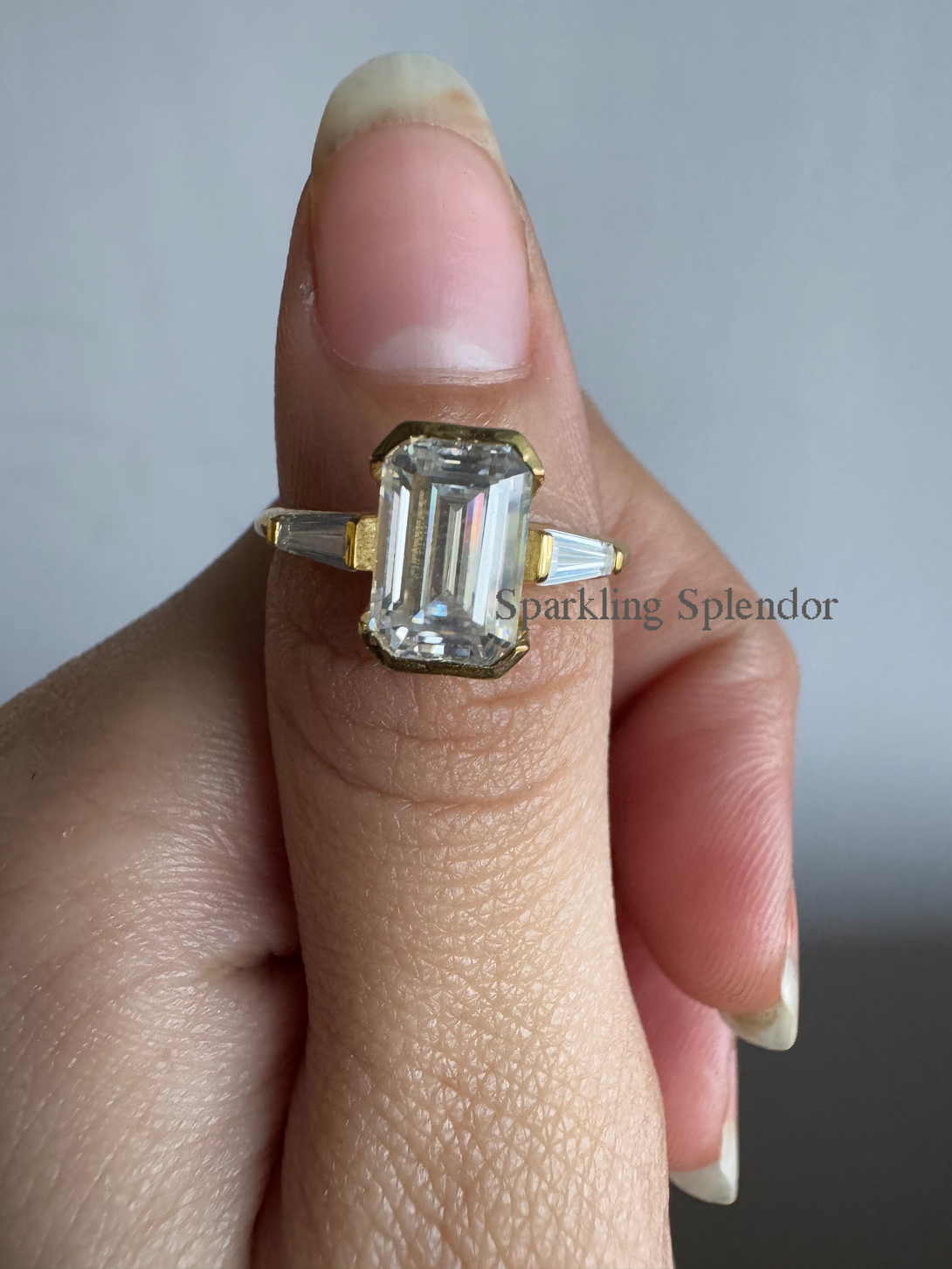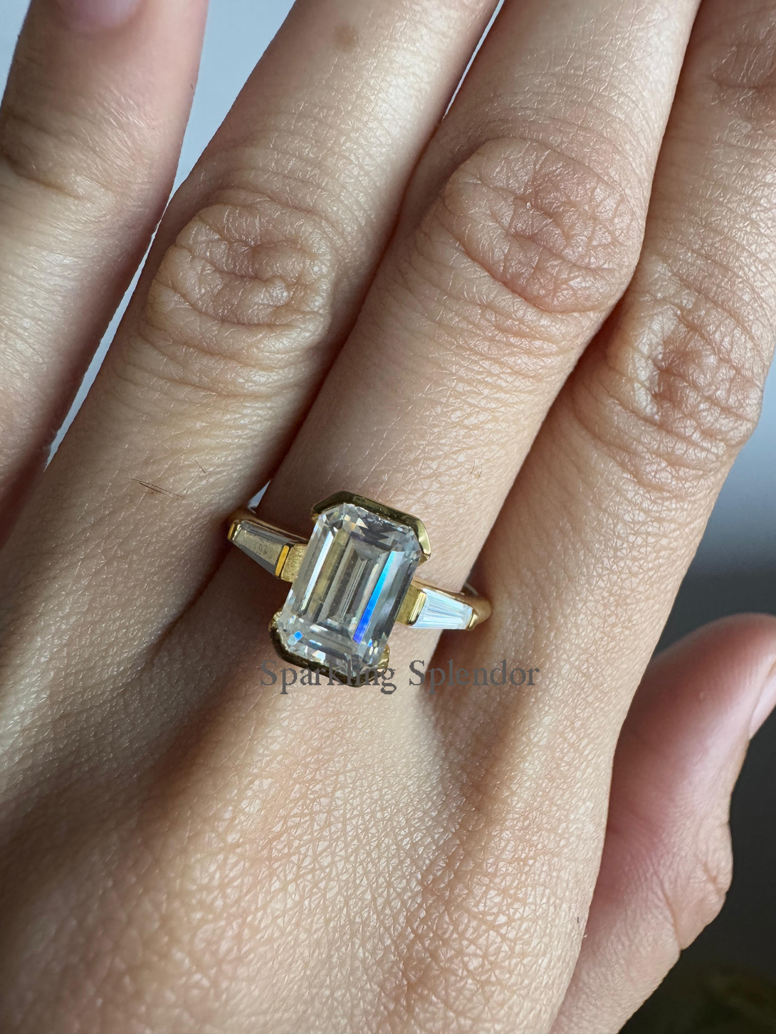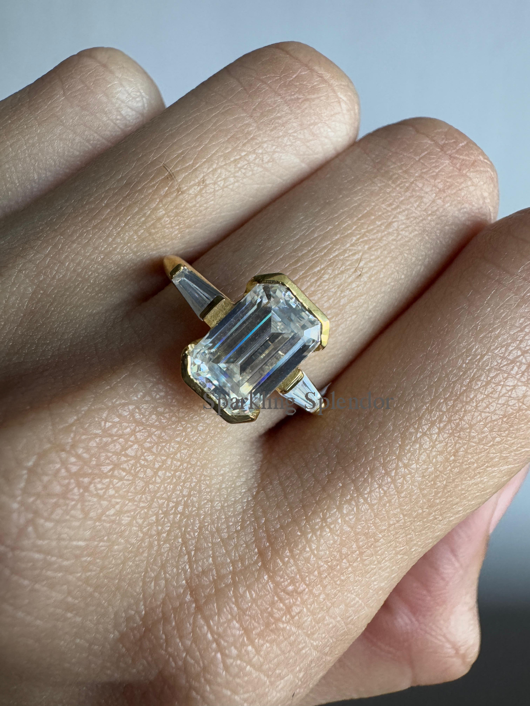 Three Stone Engagement Ring Half Bezel Set Emerald Cut Anniversary Gift Ring