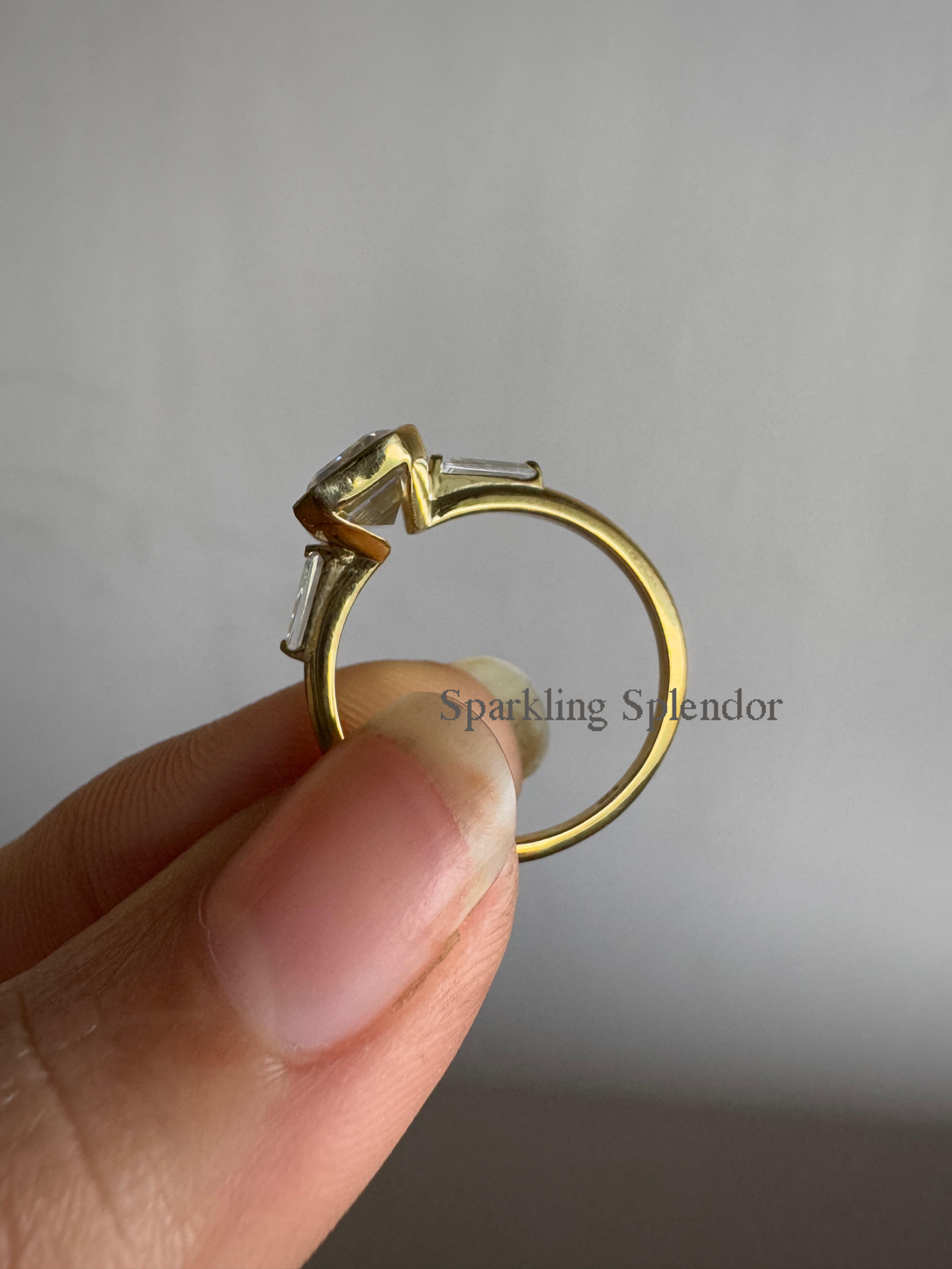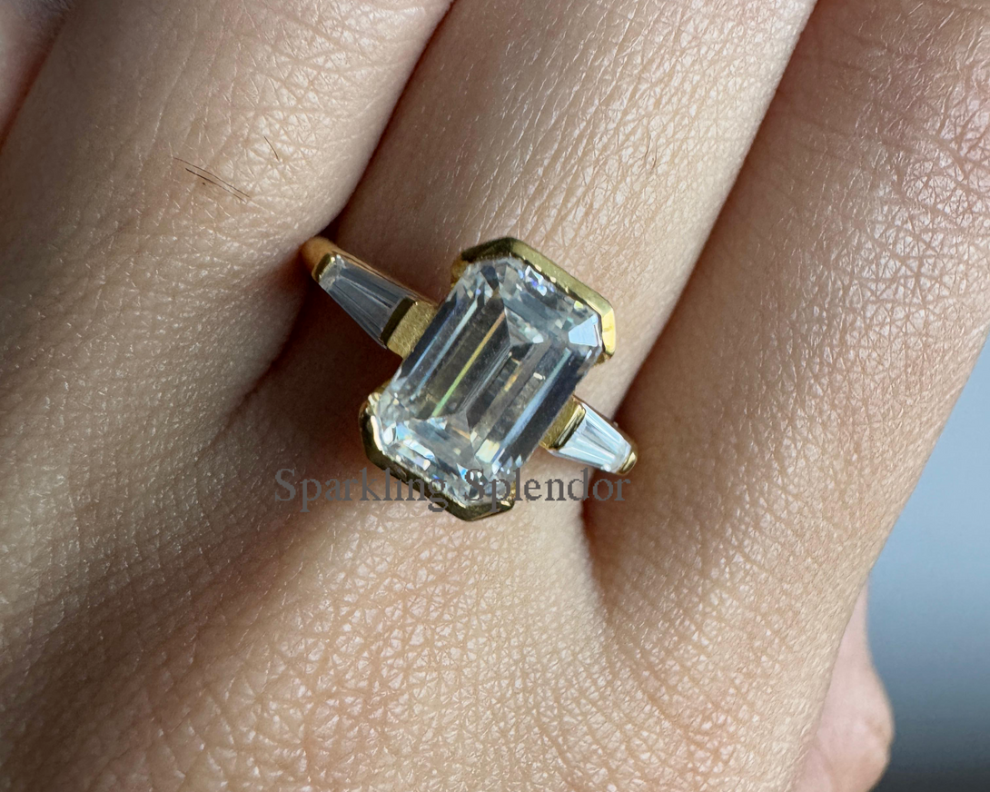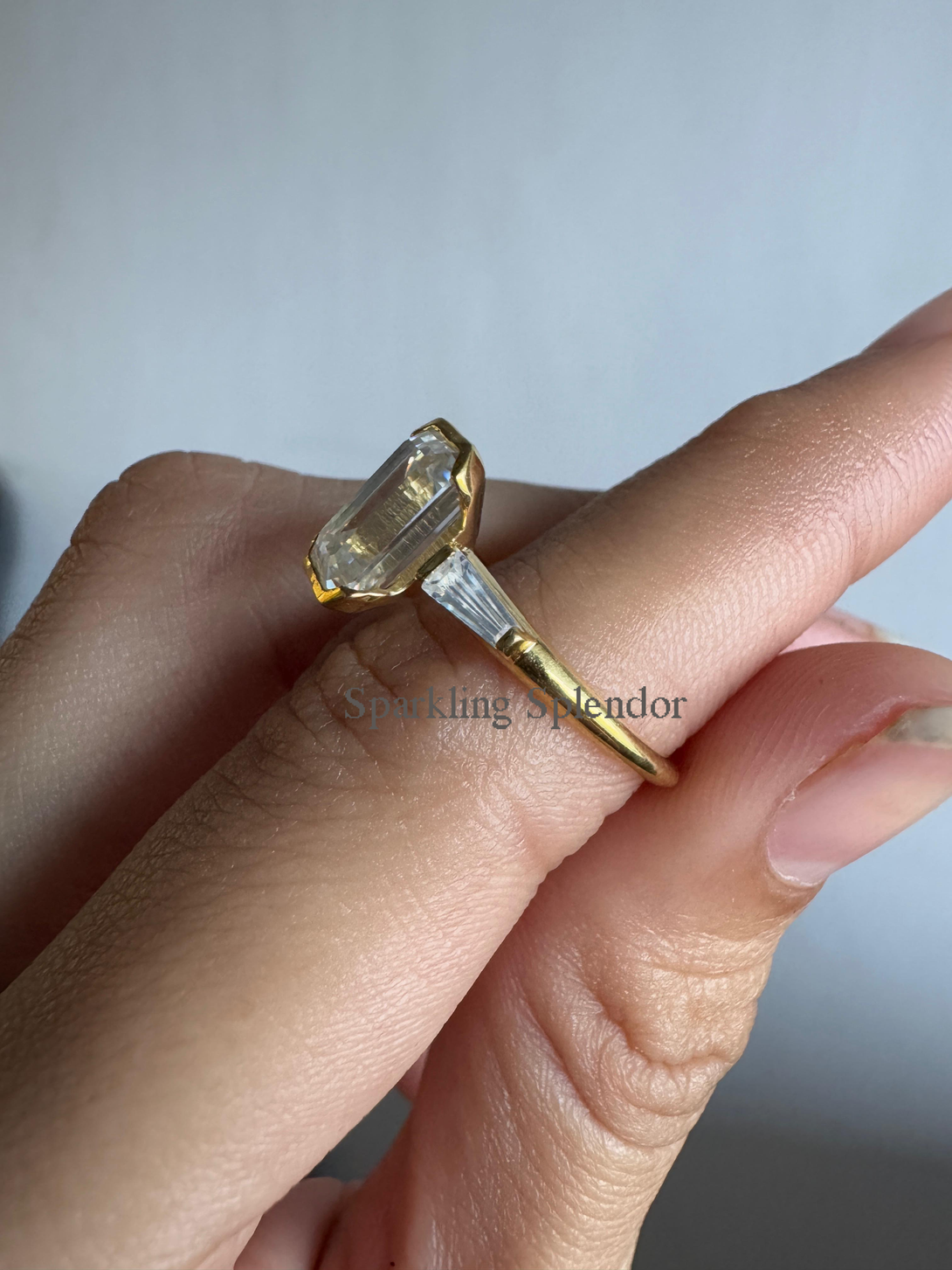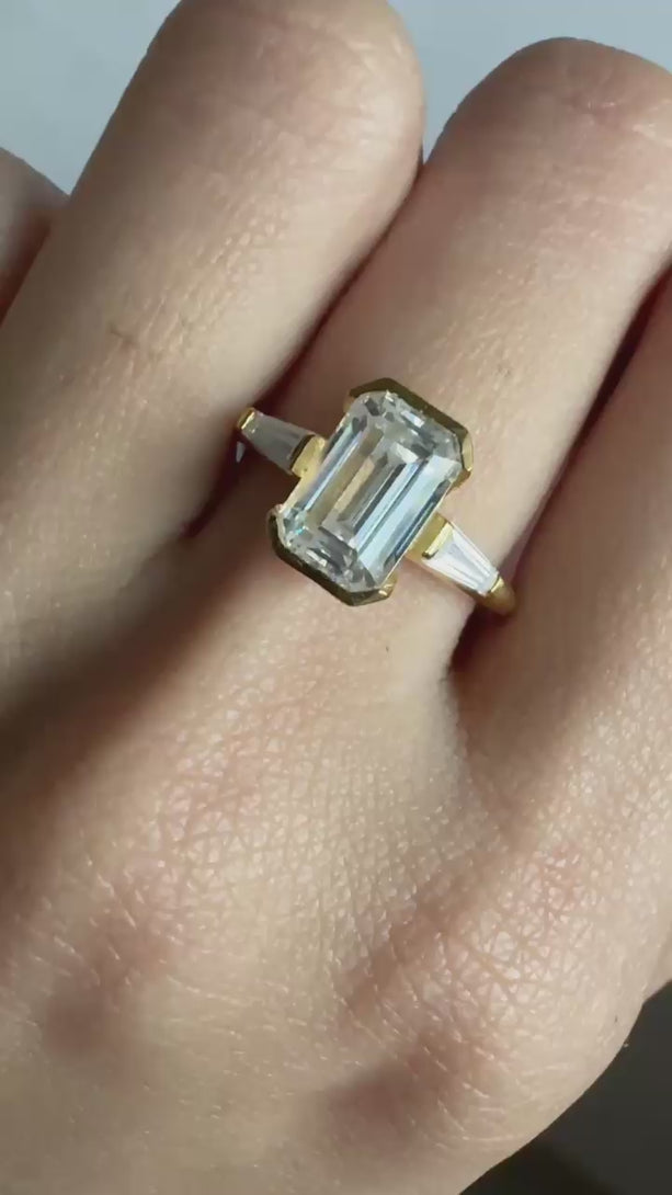Three Stone Engagement Ring Half Bezel Set Emerald Cut Anniversary Gift Ring