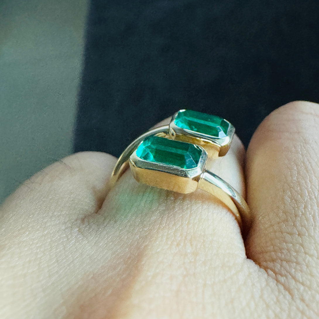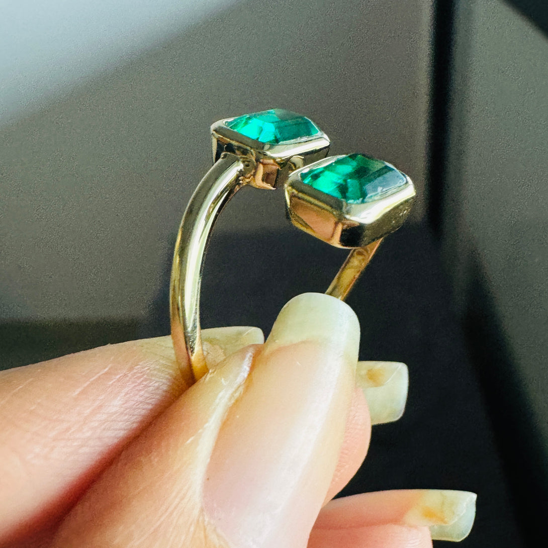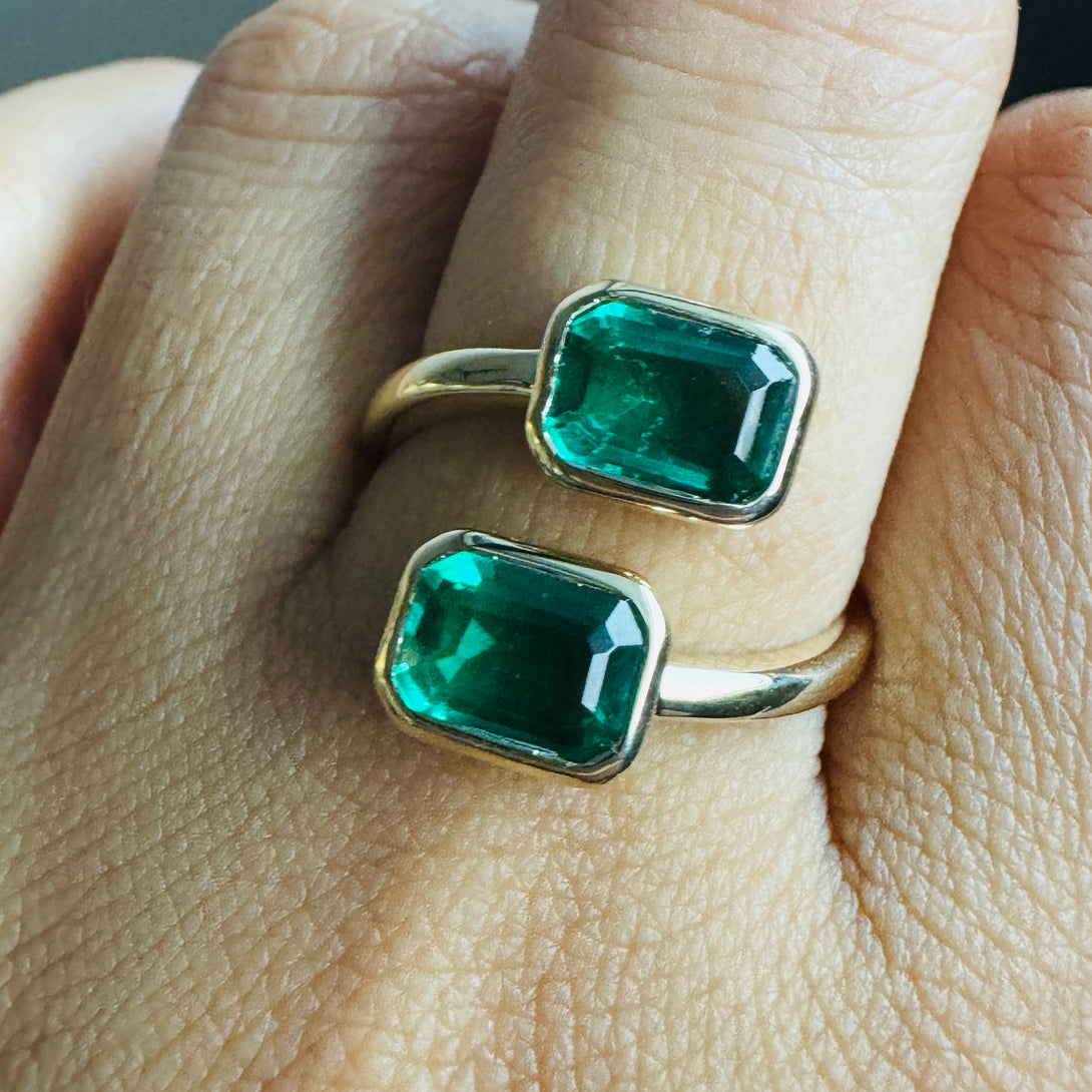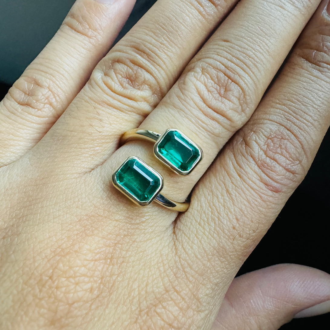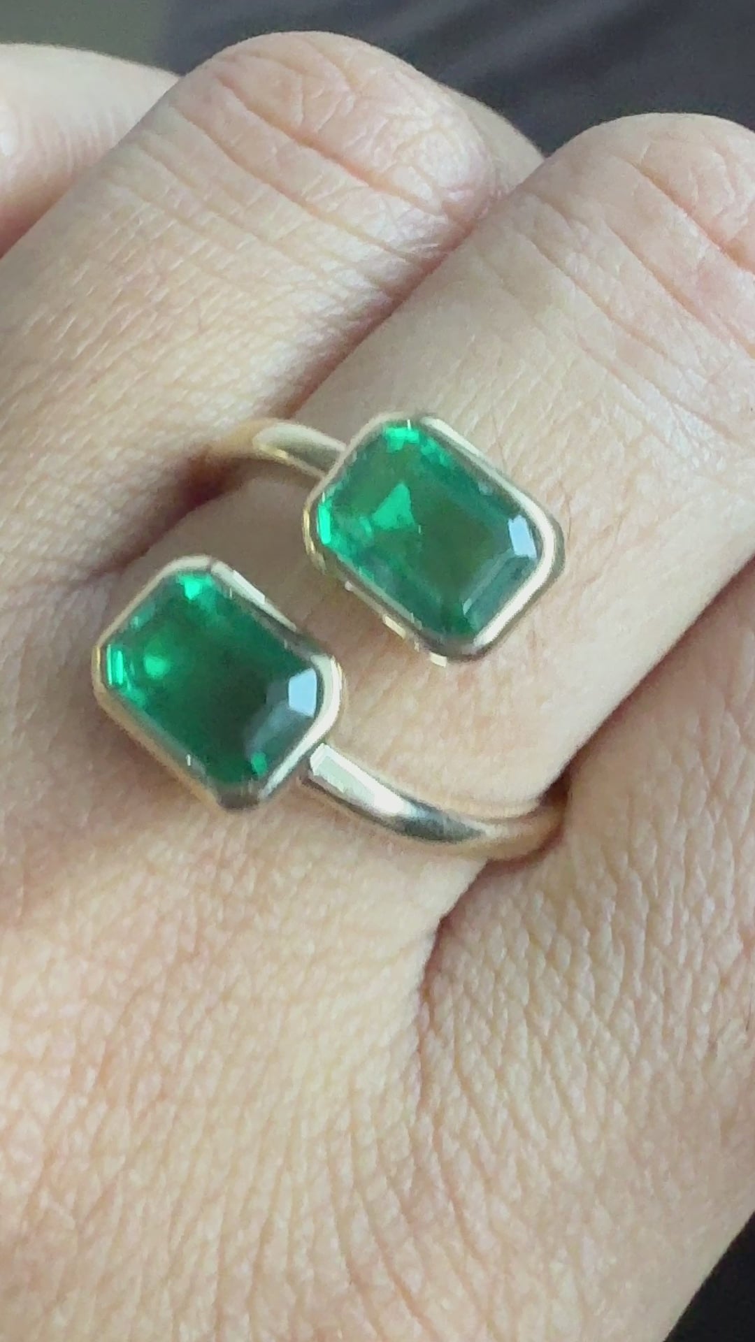 Toi Et Moi Green Emerald Engagement Ring Bezel Set Two Stone Bypass Ring