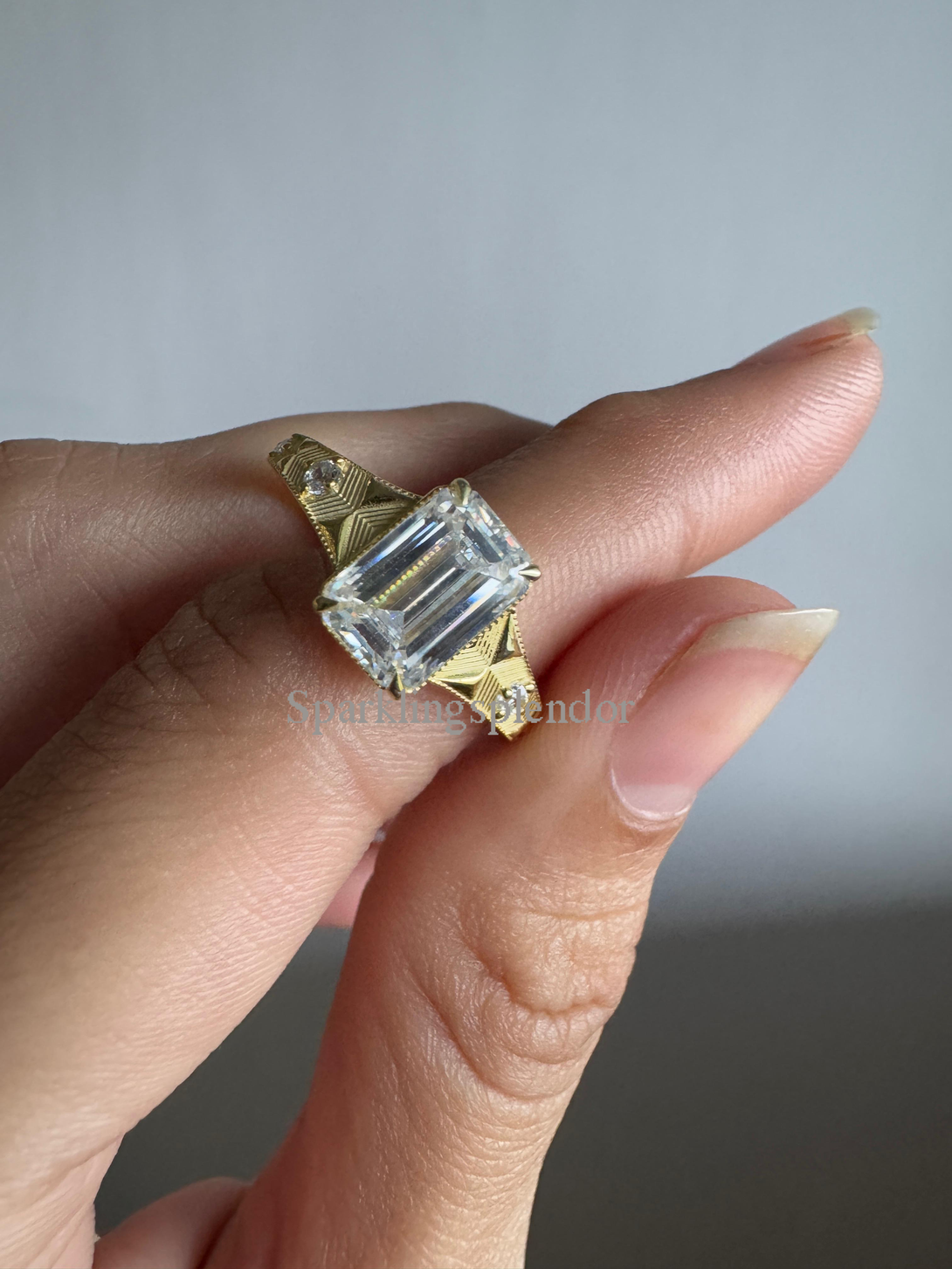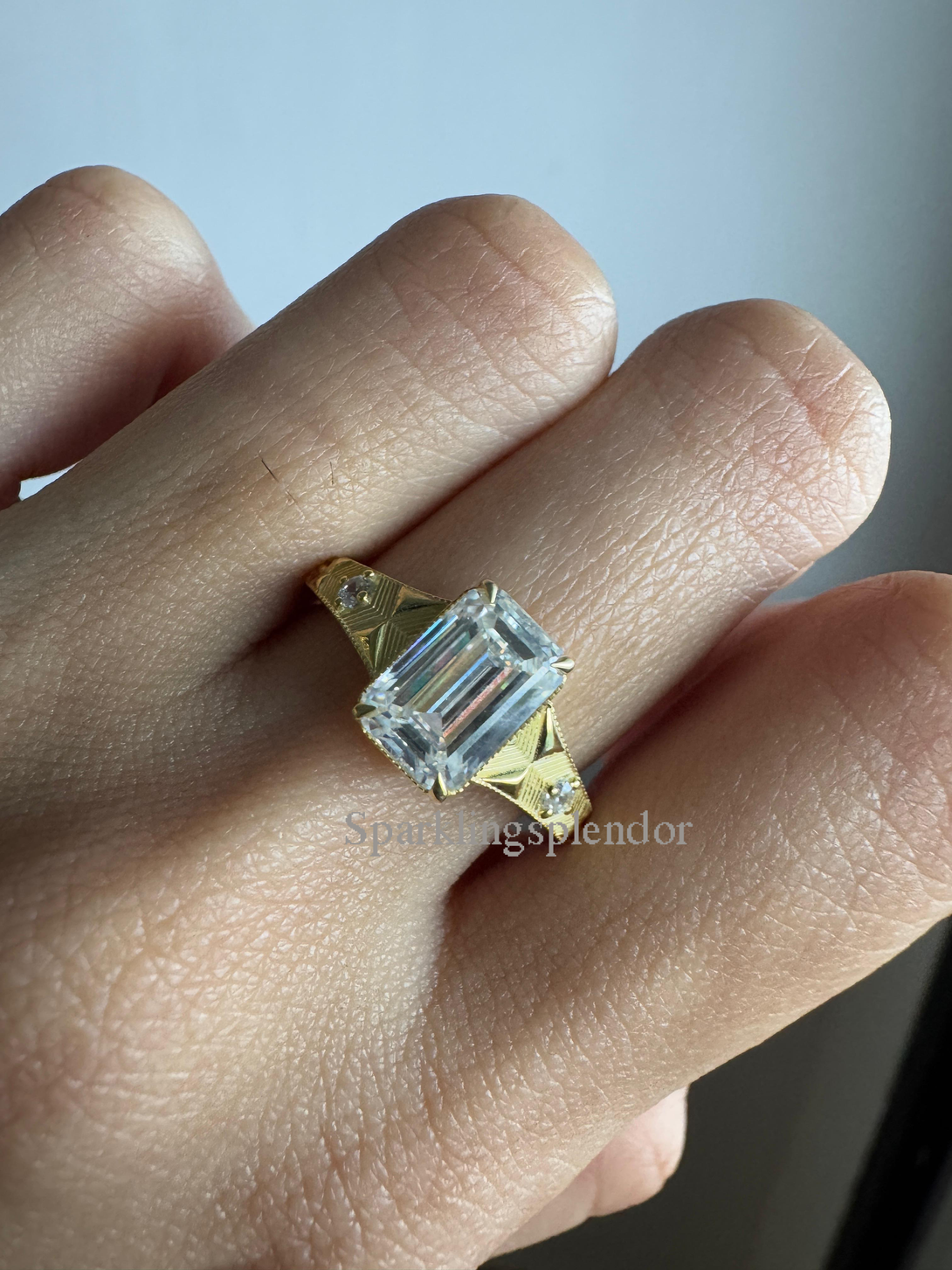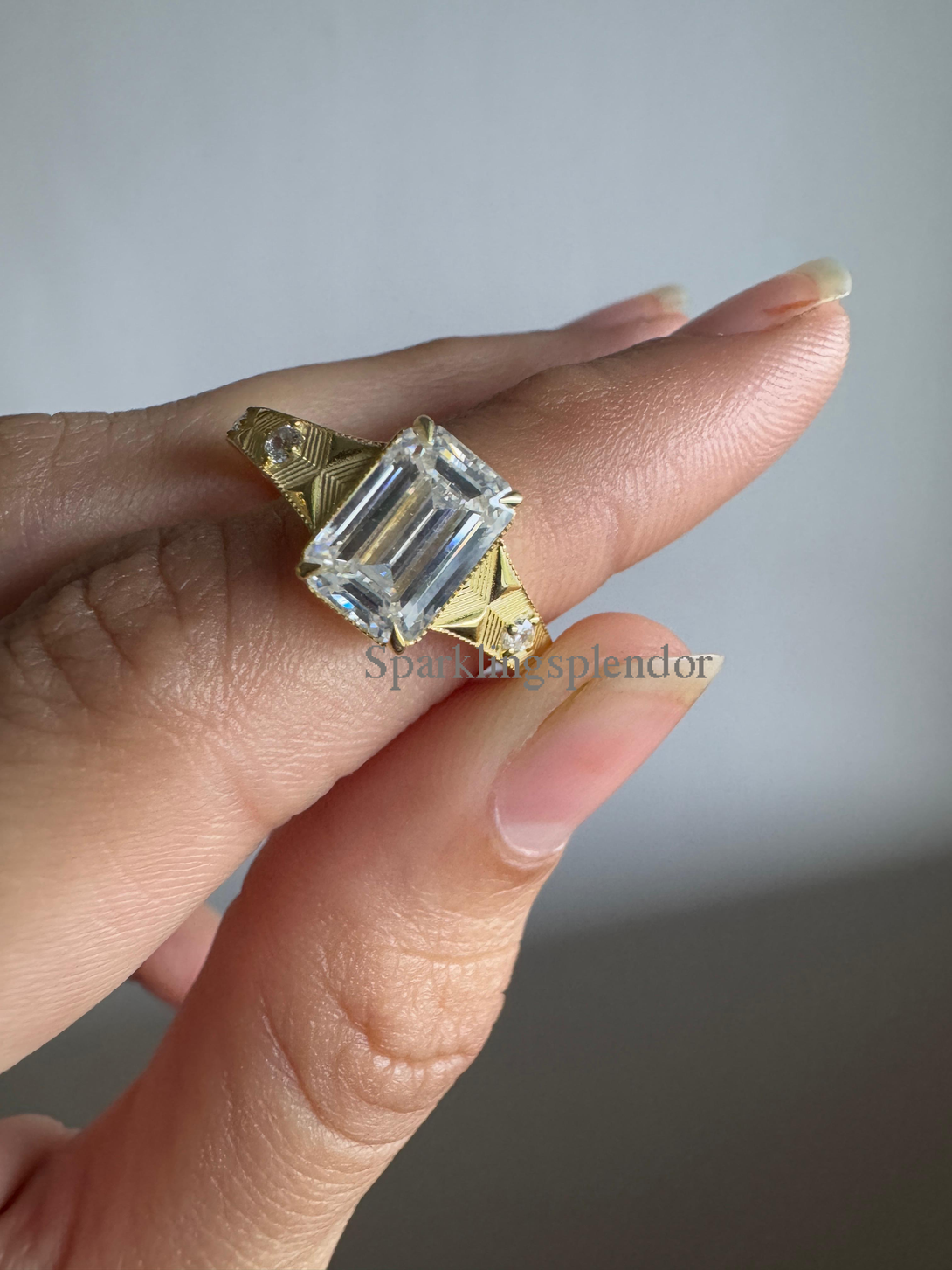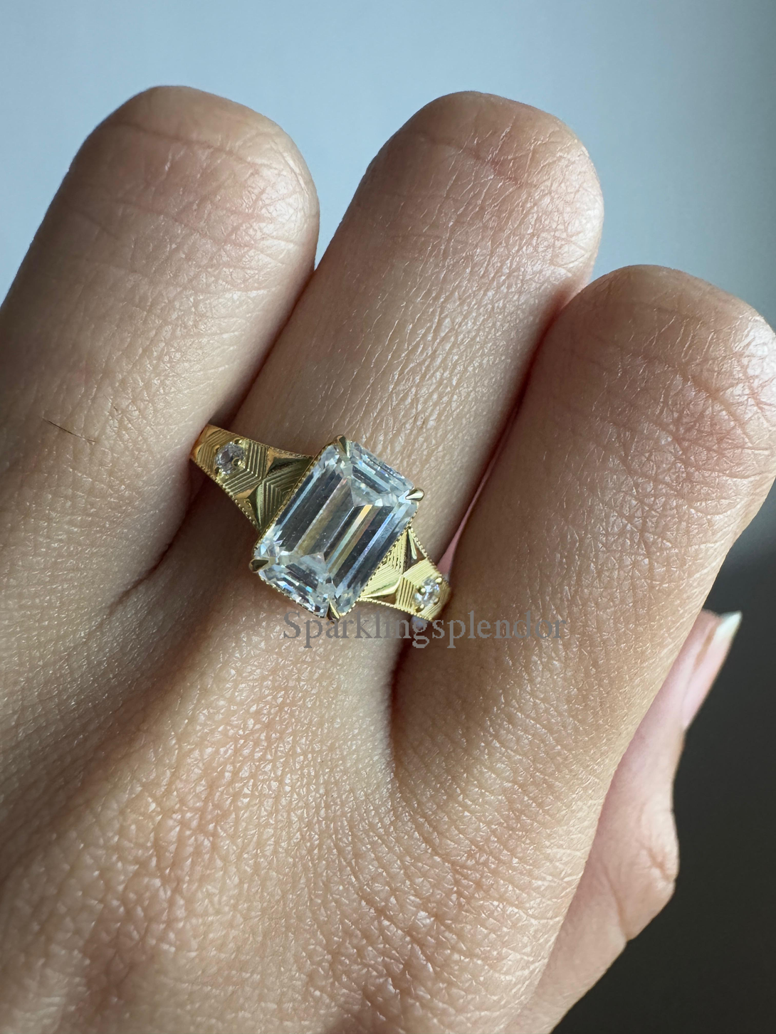 Vintage Emerald Cut Moissanite Engagement Ring 18K Gold Antique Style Jewelry