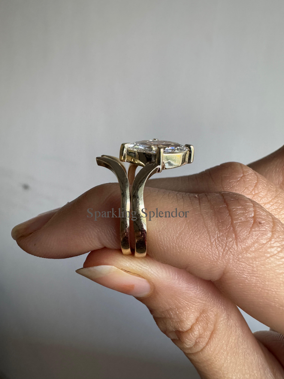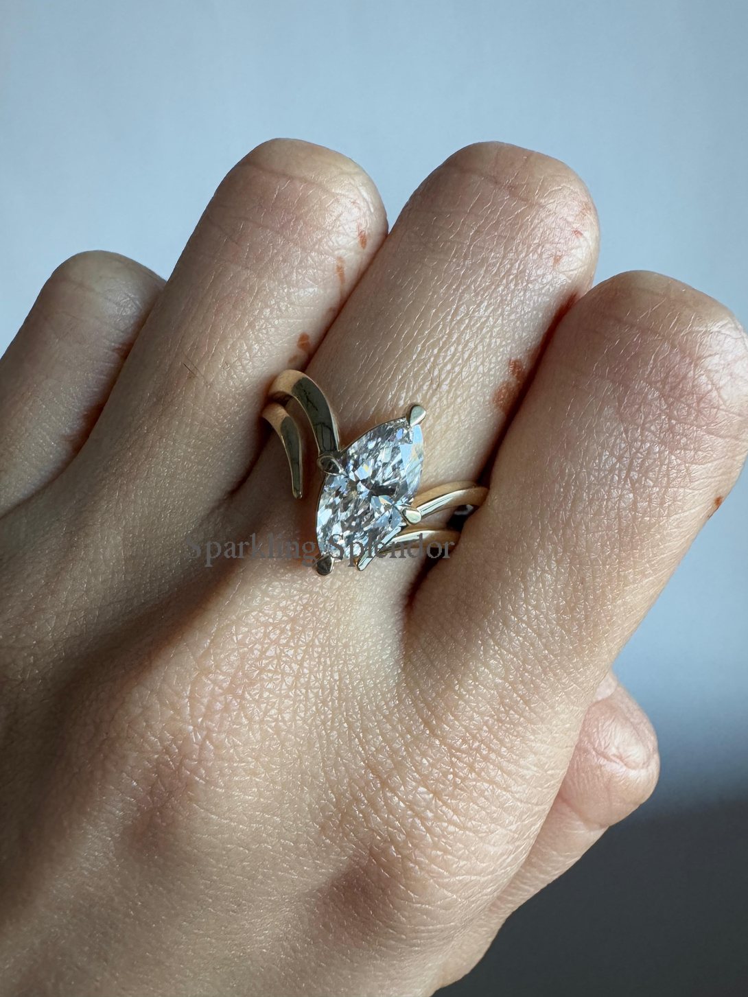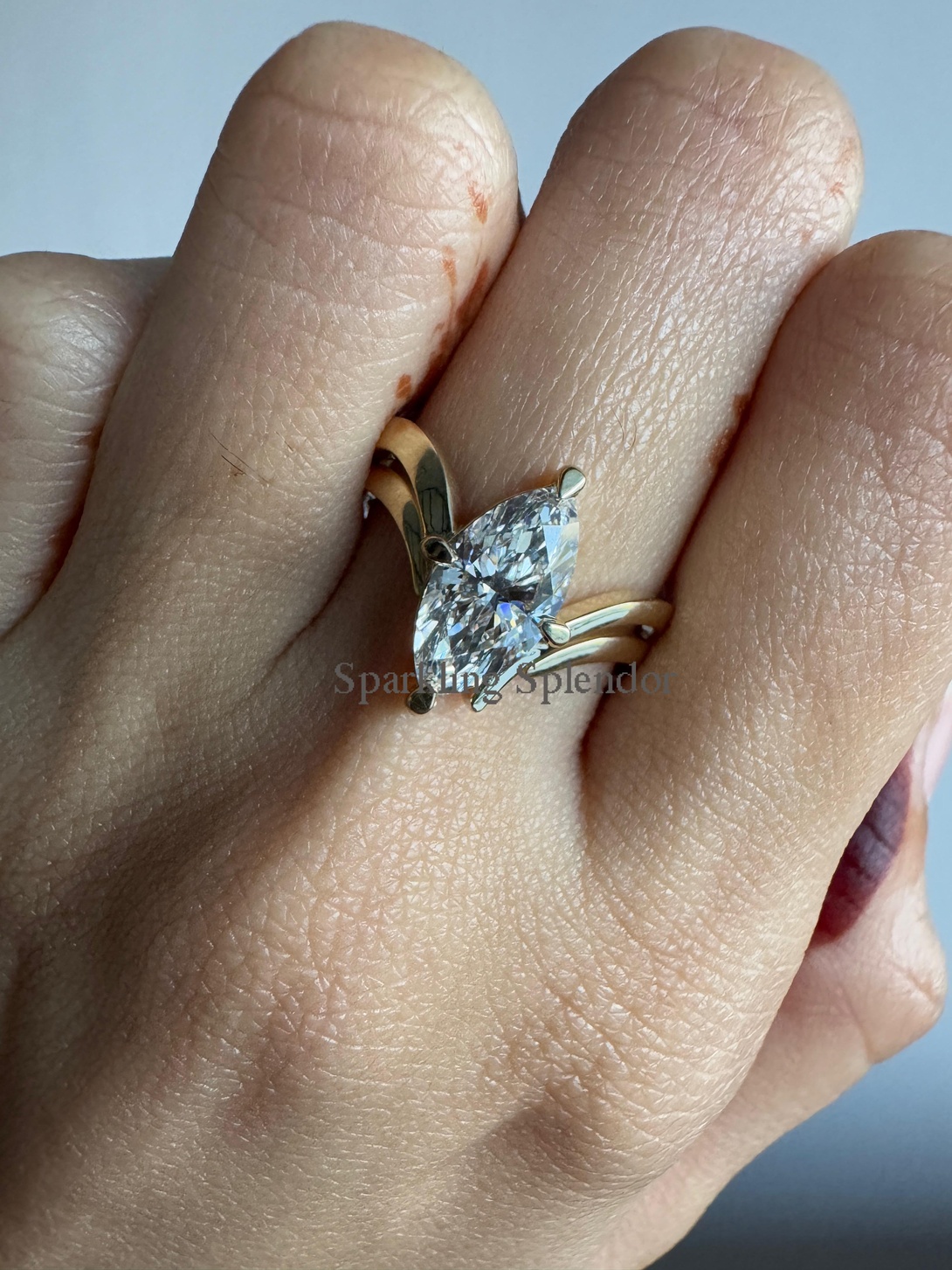 Marquise Cut Moissanite Solitaire Ring With Matching Open Band Wedding Ring Set