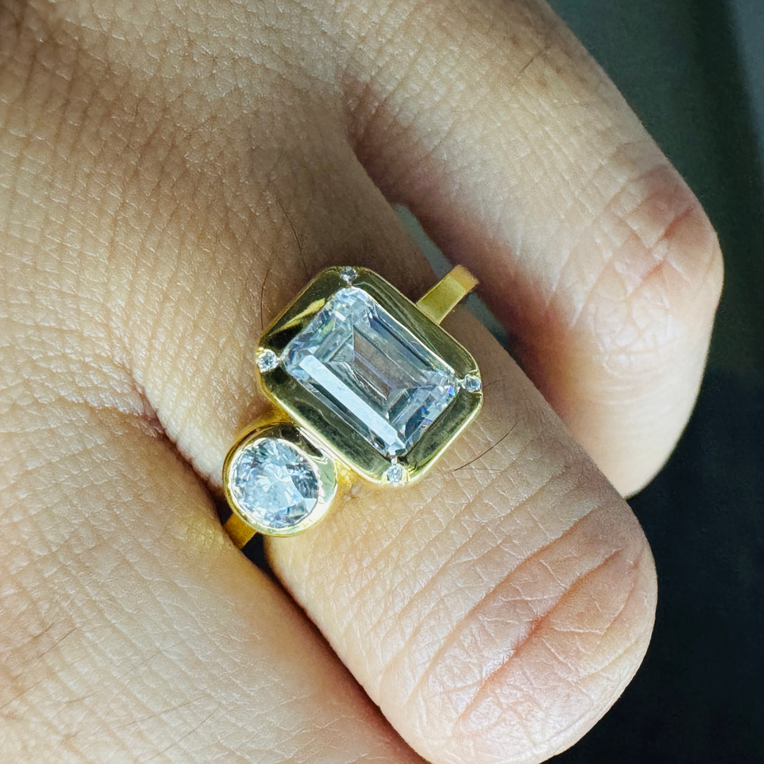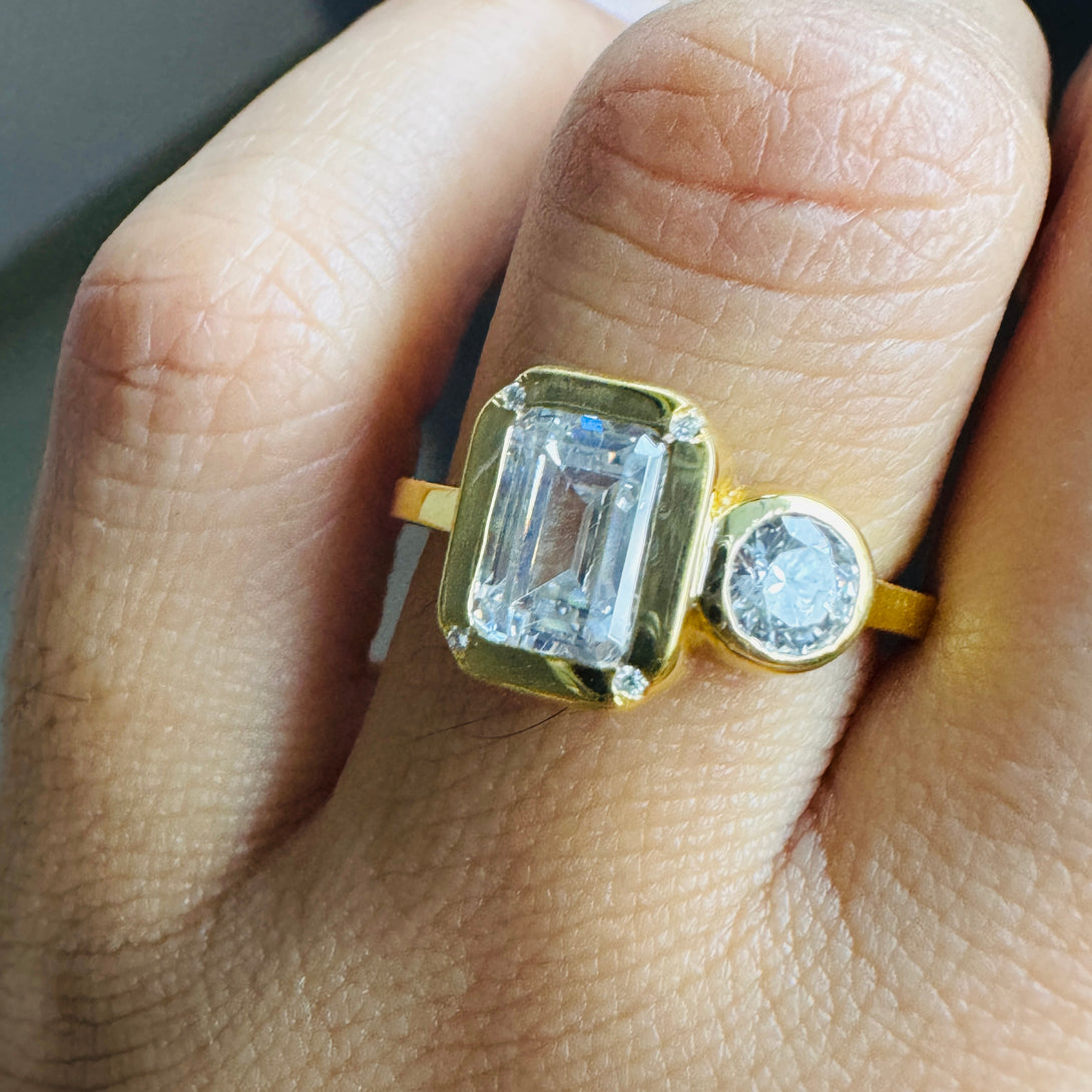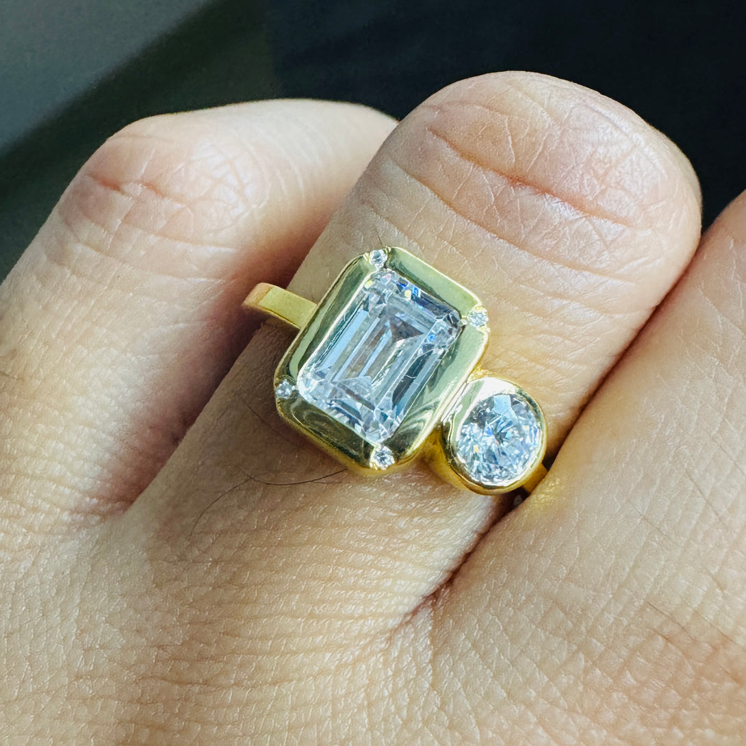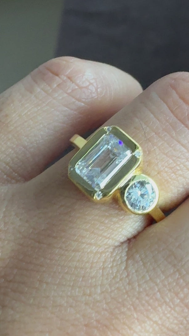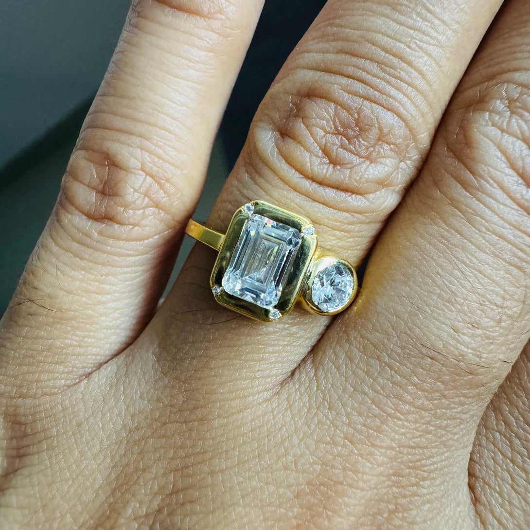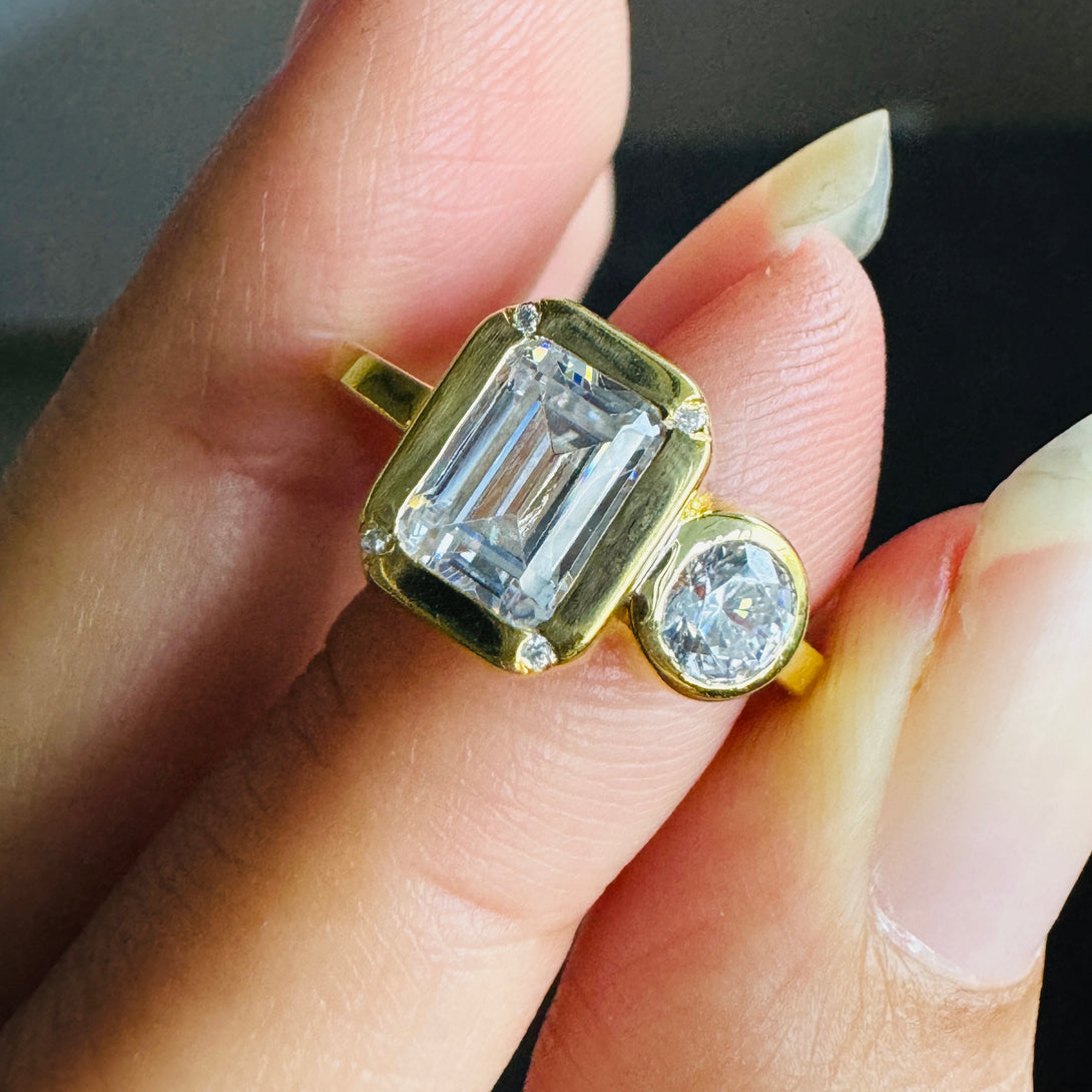 Emerald & Round Cut Moissanite Bezel Set Ring Toi Et Moi Engagement Ring