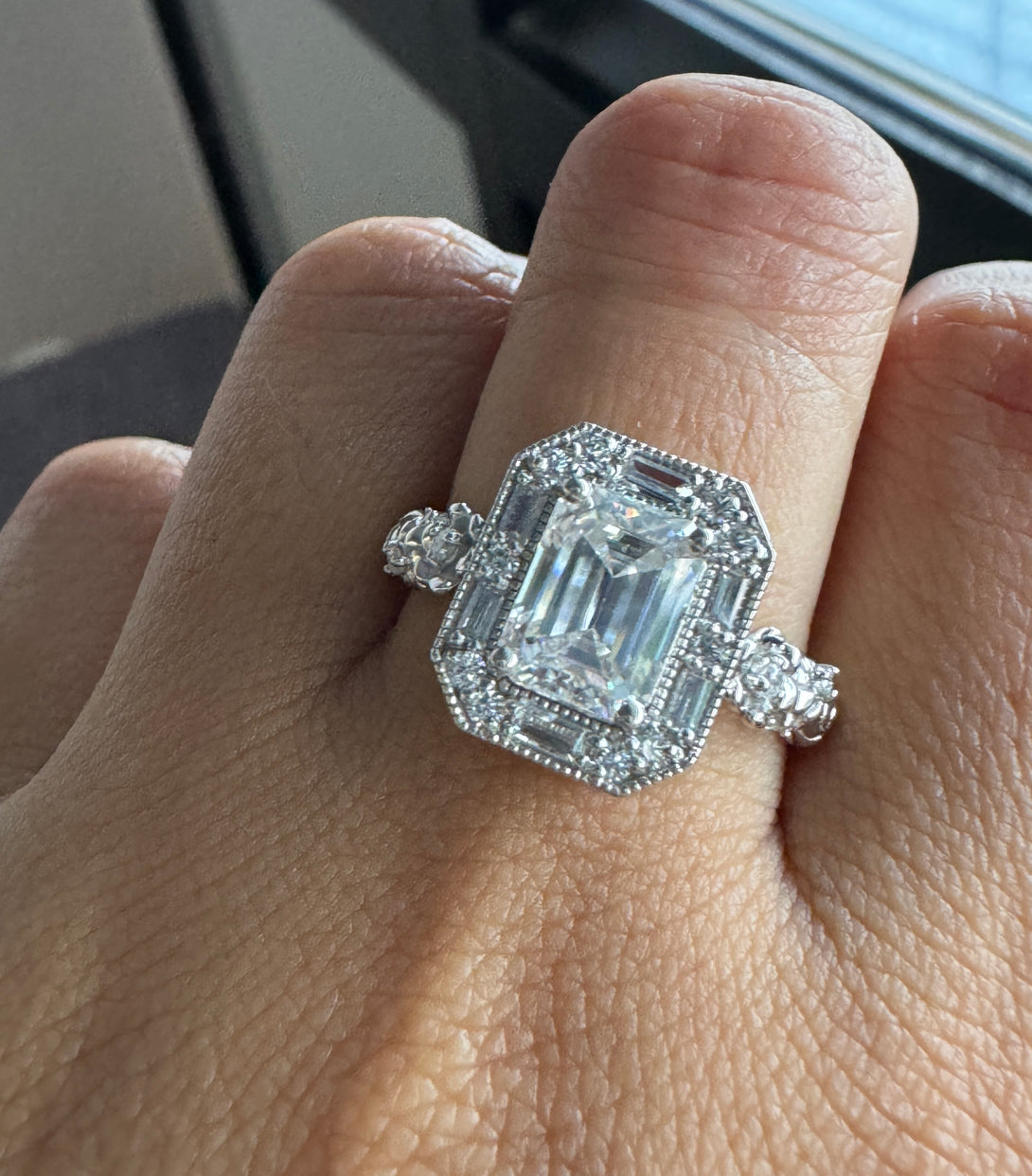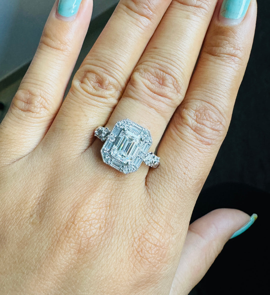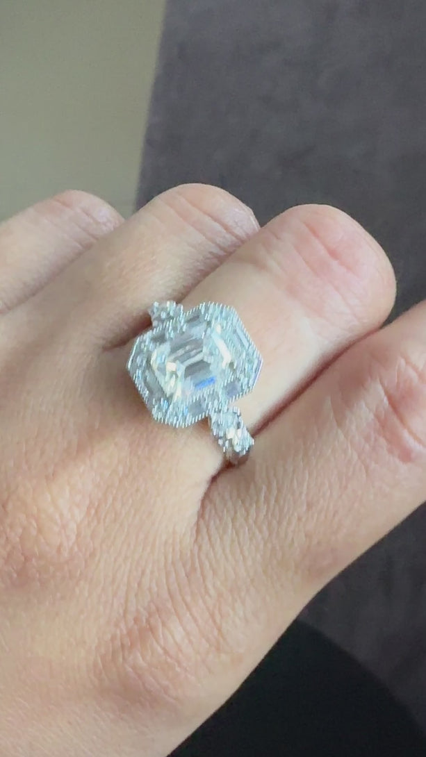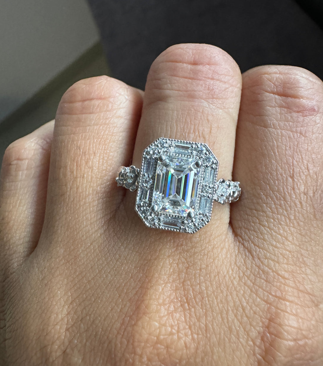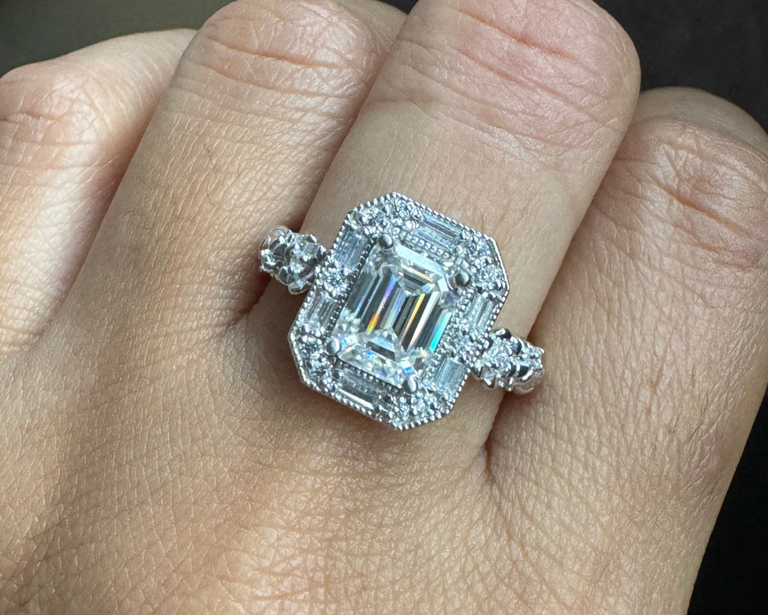 Emerald Cut Moissanite Halo Baguette Vintage Ring Art Deco Engagement Ring