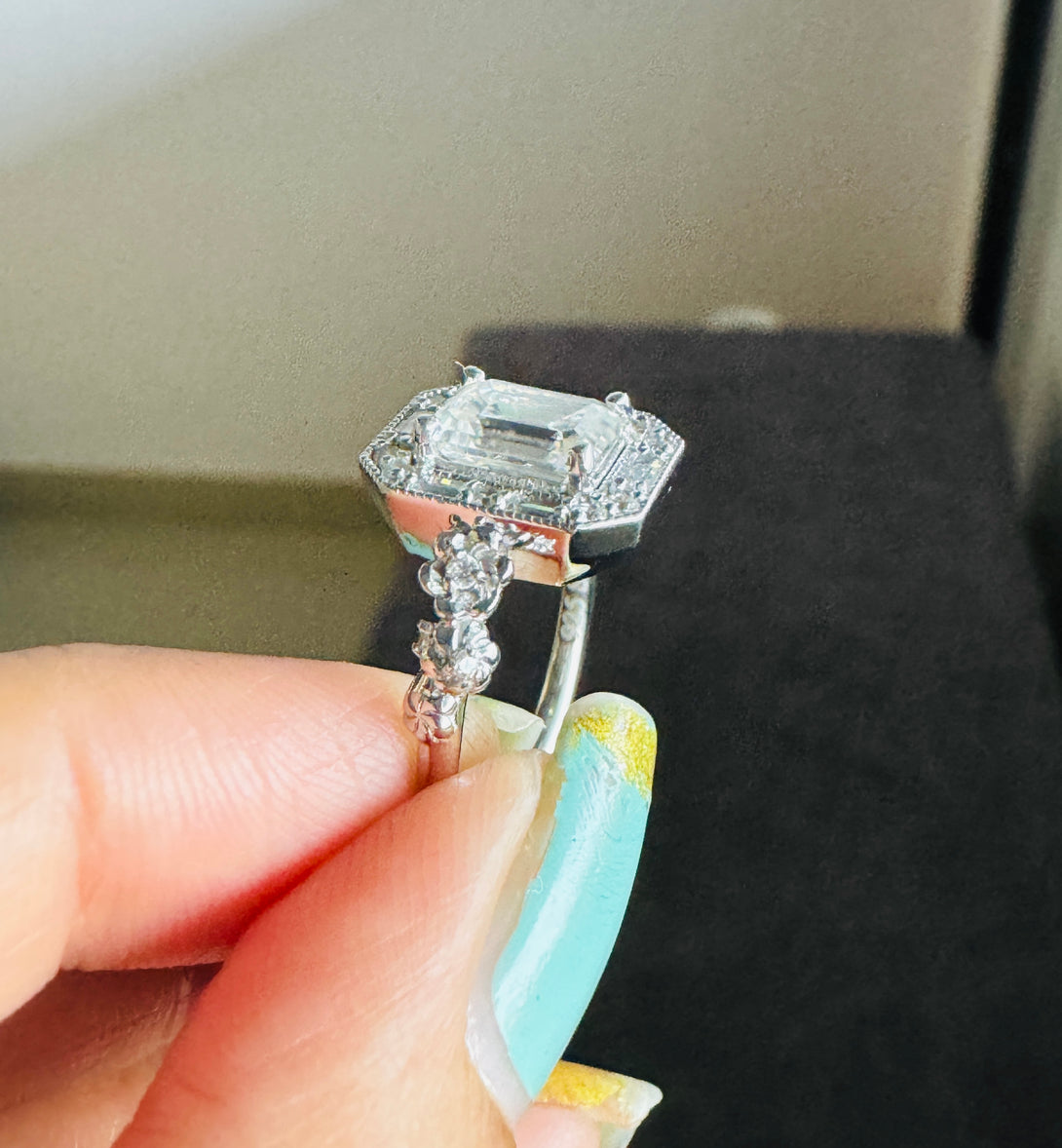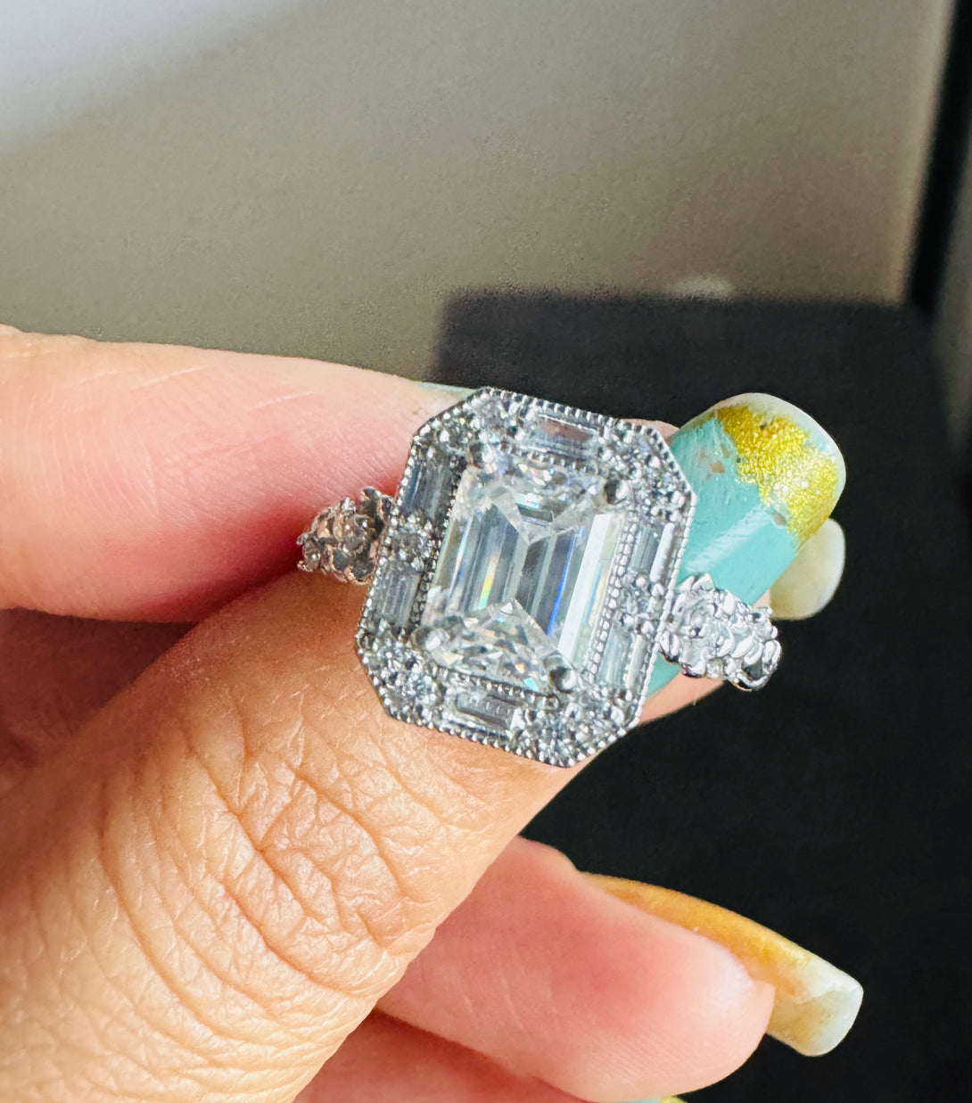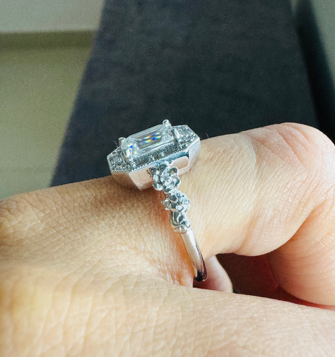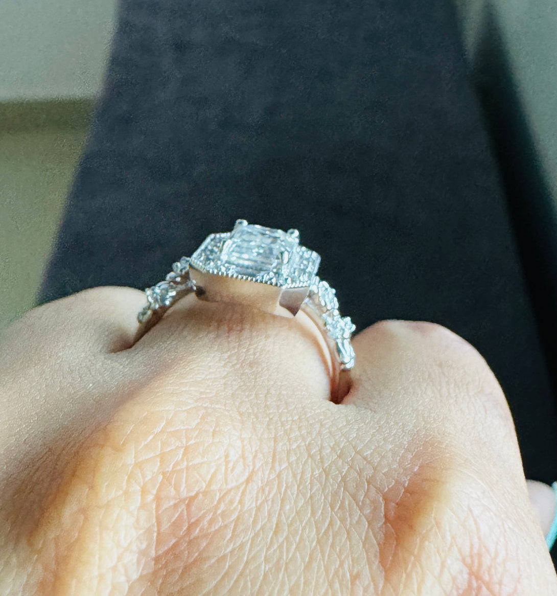 Emerald Cut Moissanite Halo Baguette Vintage Ring Art Deco Engagement Ring