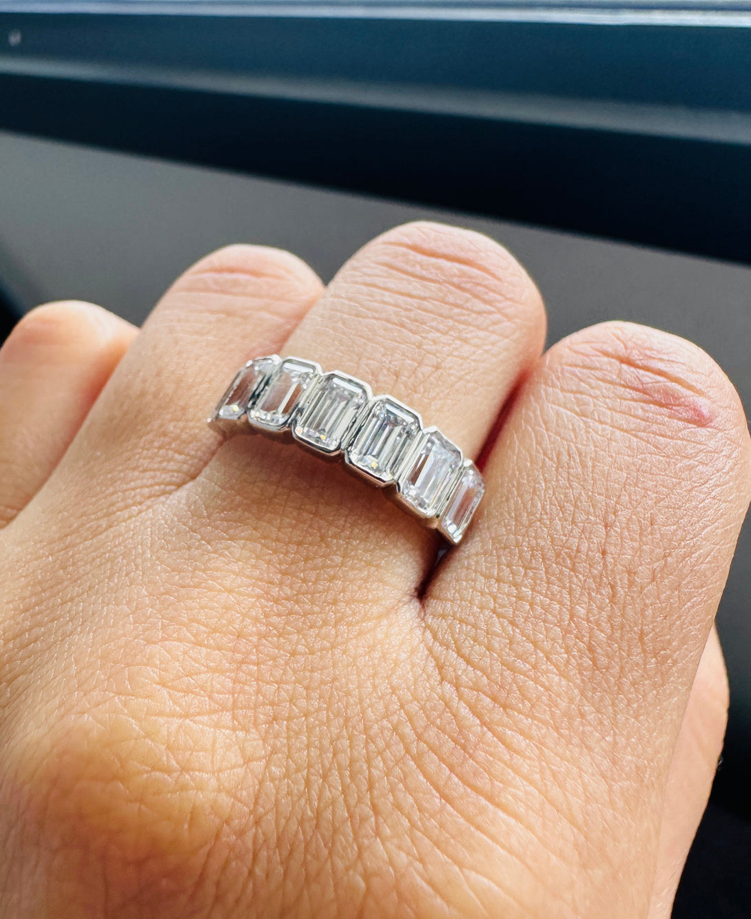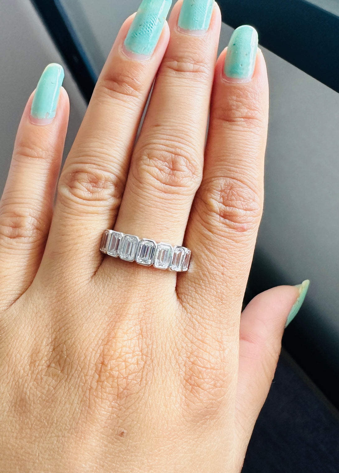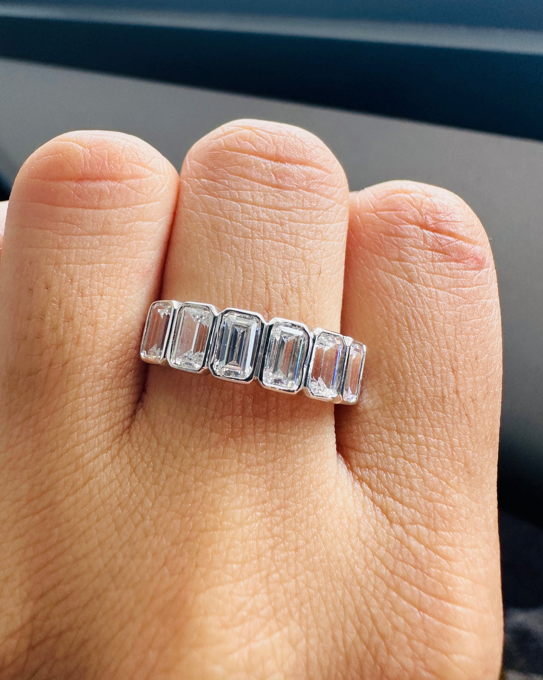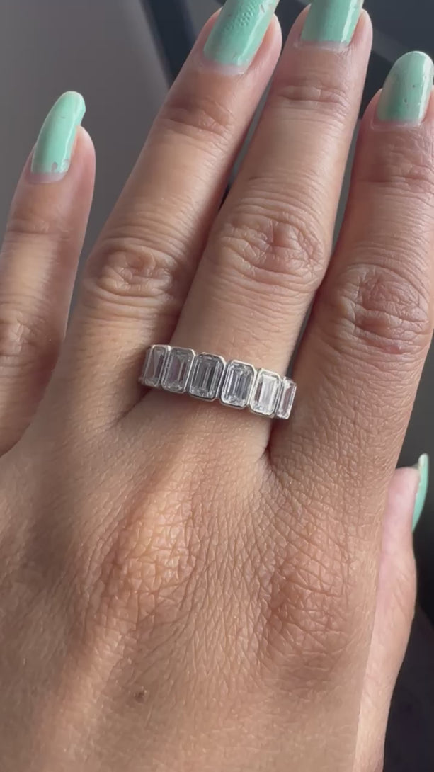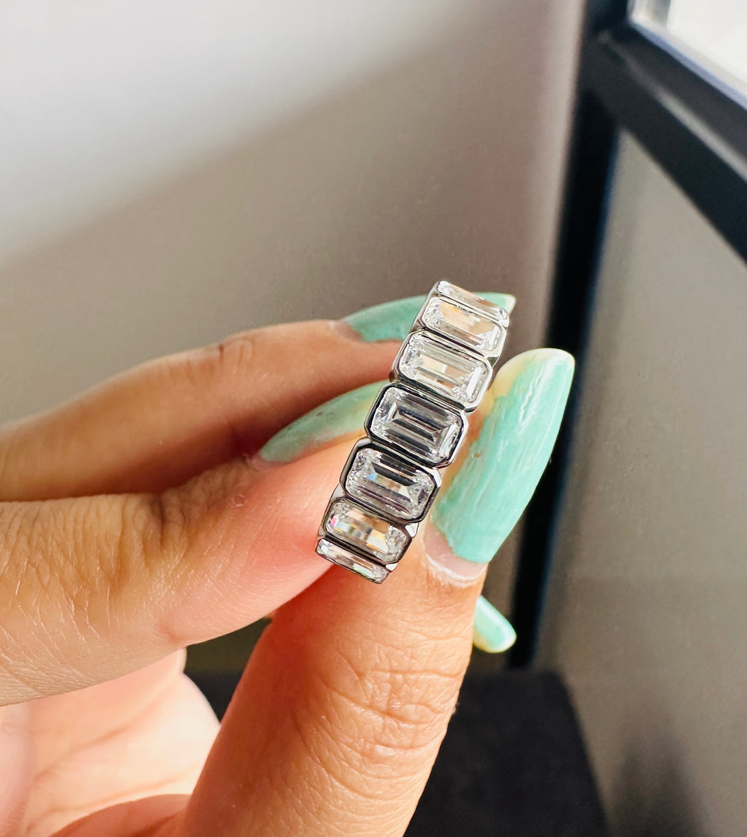 Bezel Set 7 Stone Emerald Cut Moissanite Eternity Wedding Band For Women