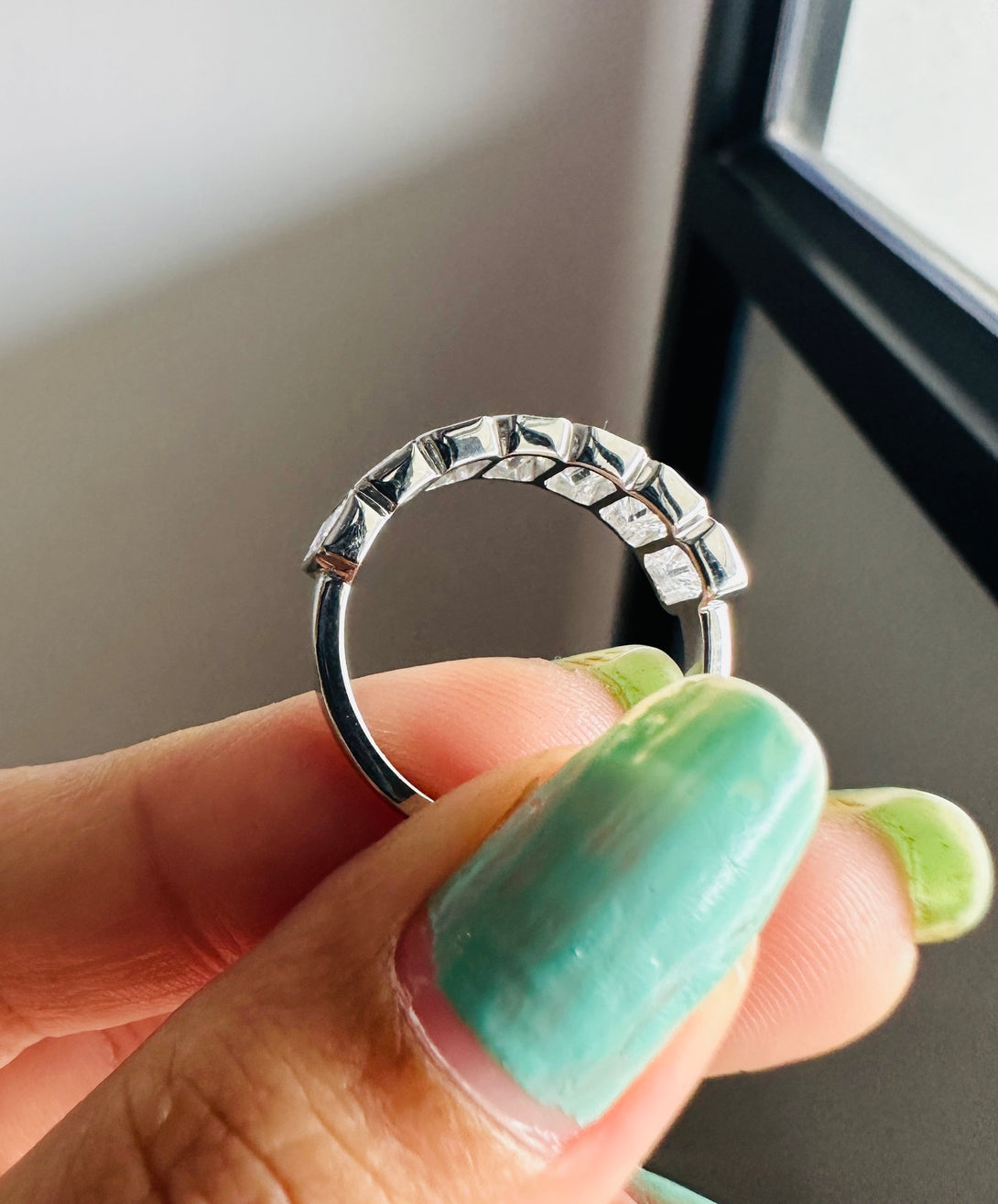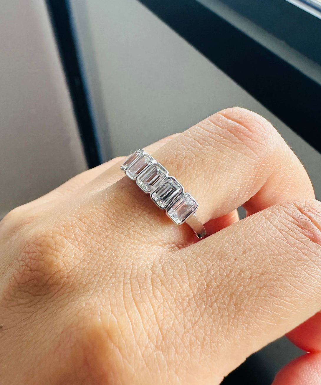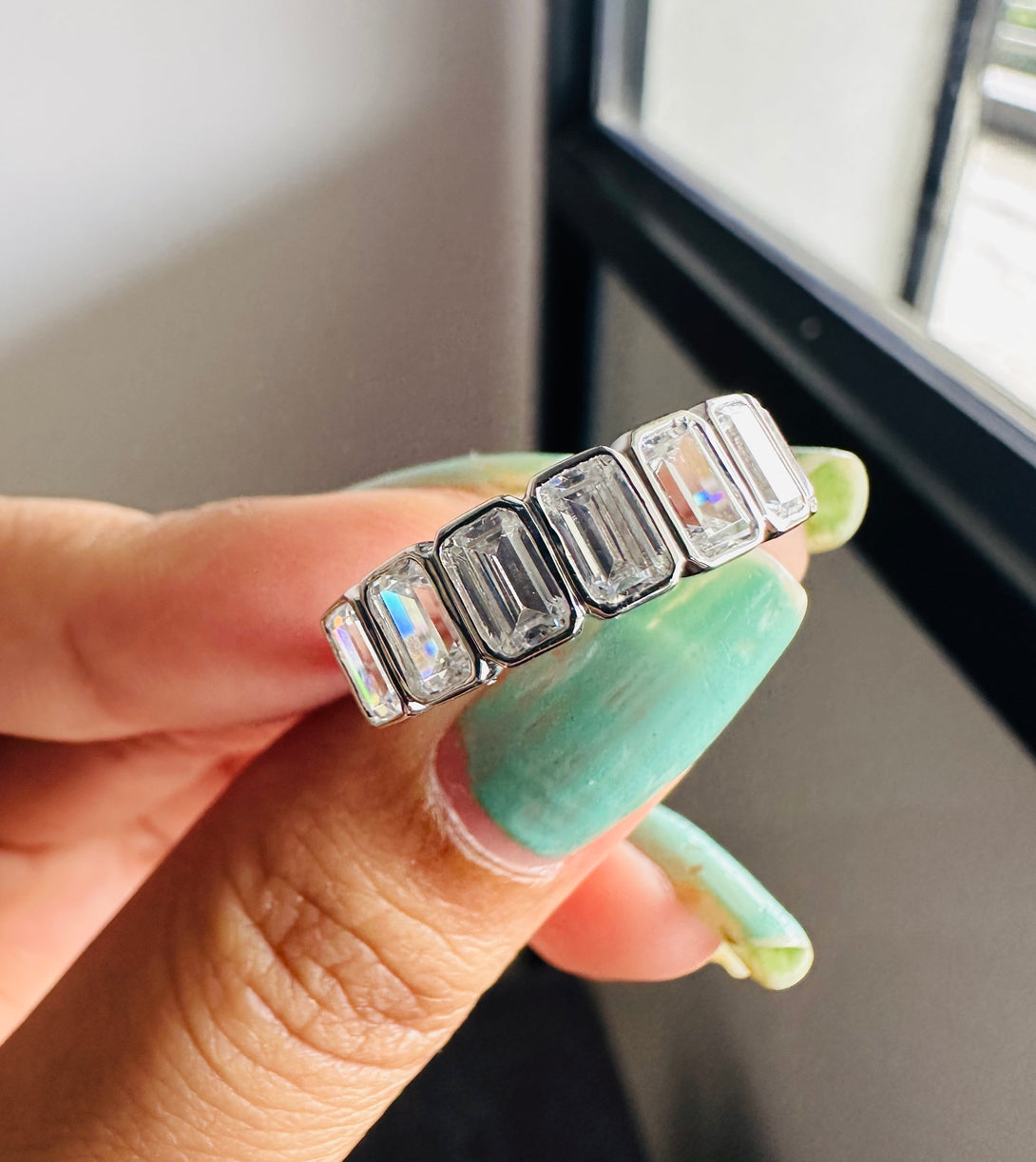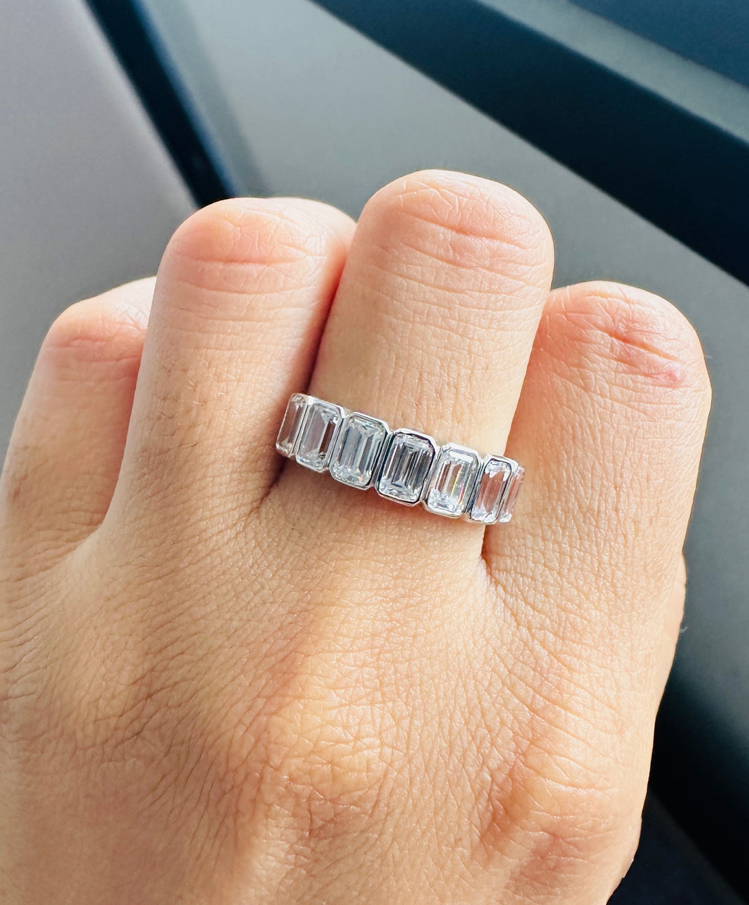 Bezel Set 7 Stone Emerald Cut Moissanite Eternity Wedding Band For Women