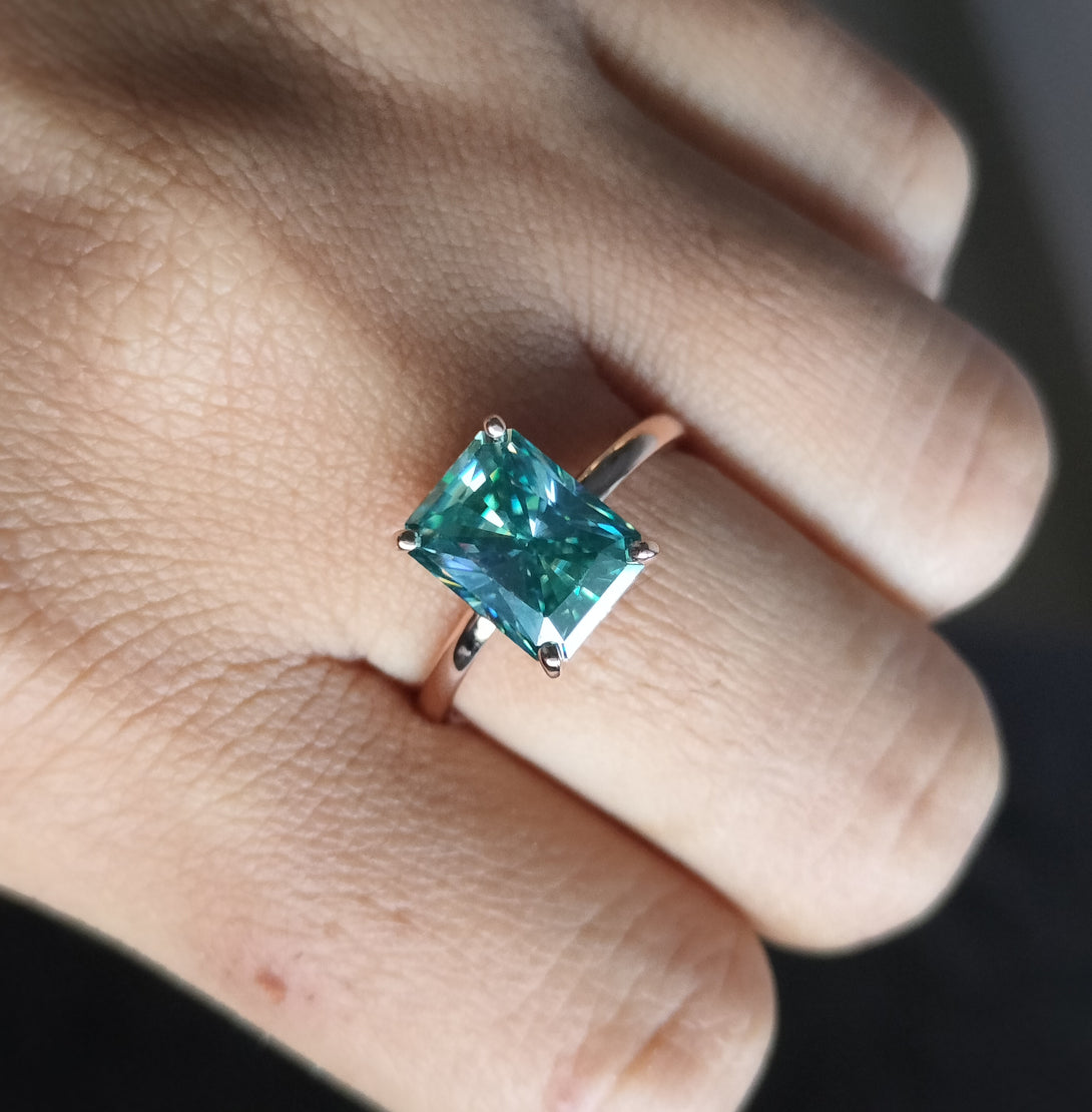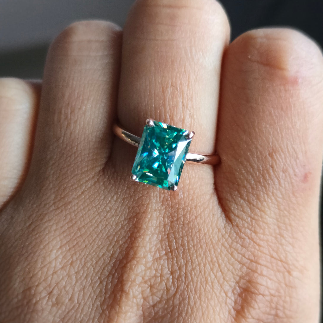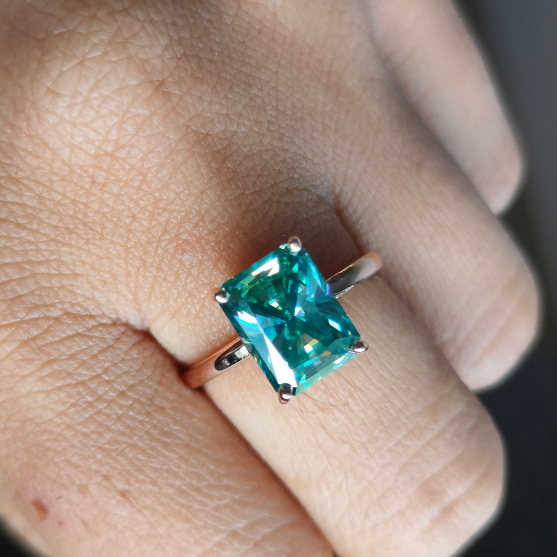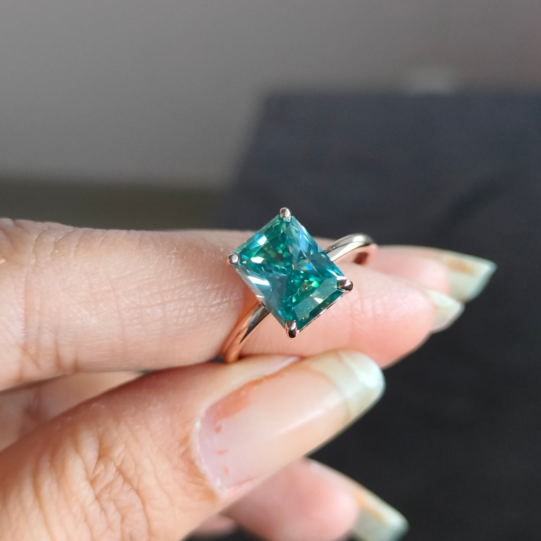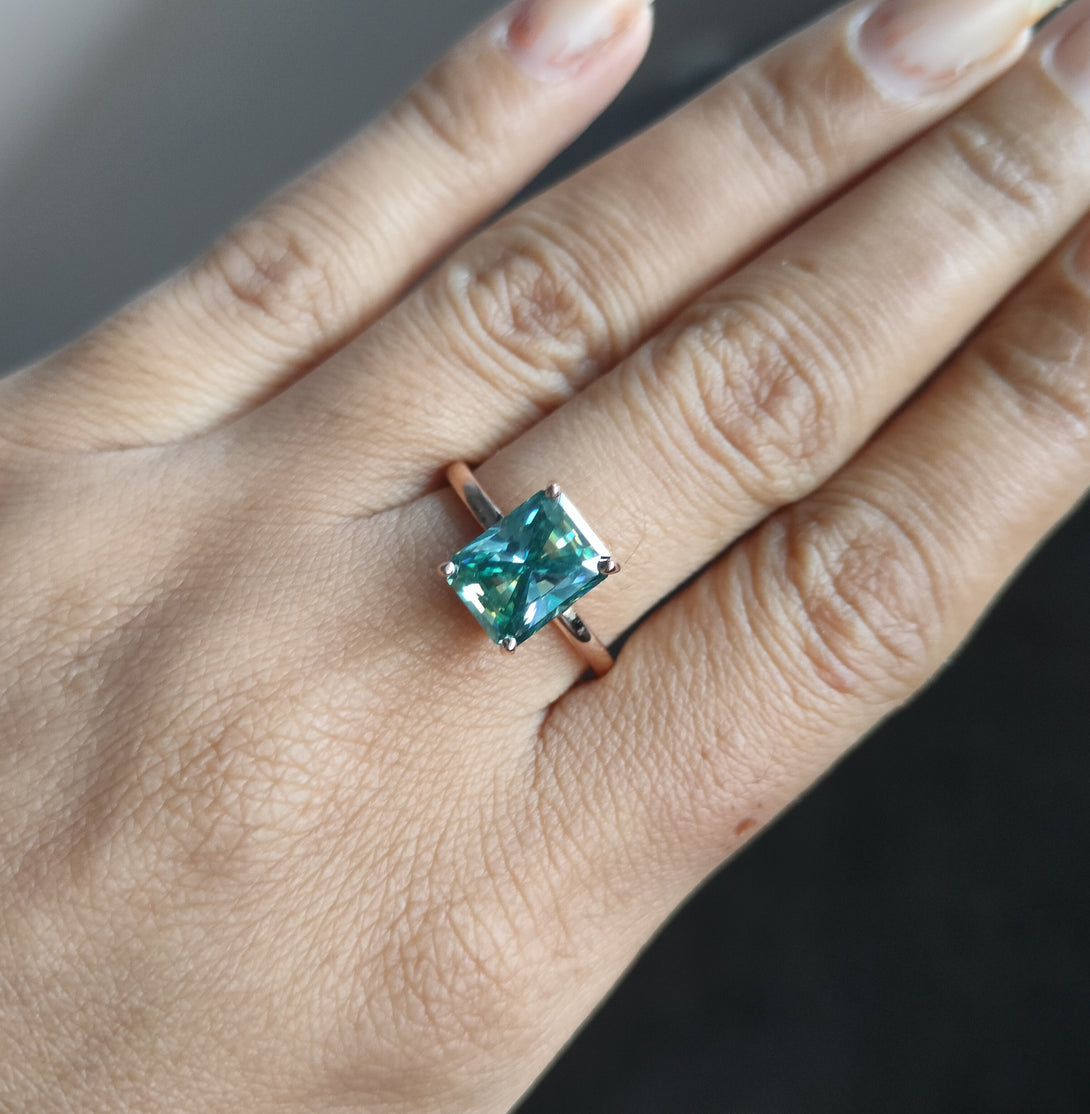 Blue Moissanite Engagement Ring Radiant Cut Solitaire Ring in 18K Solid Gold