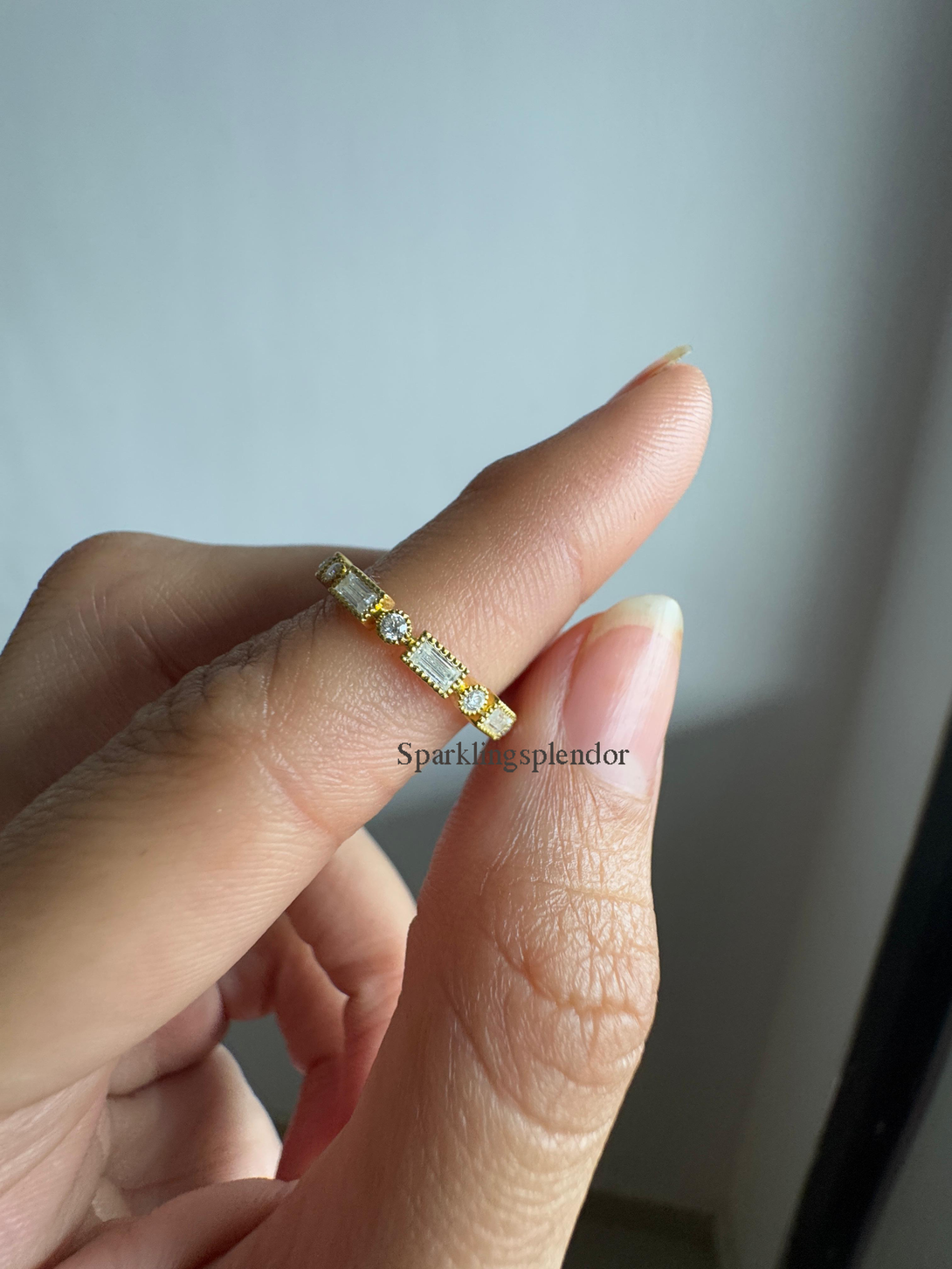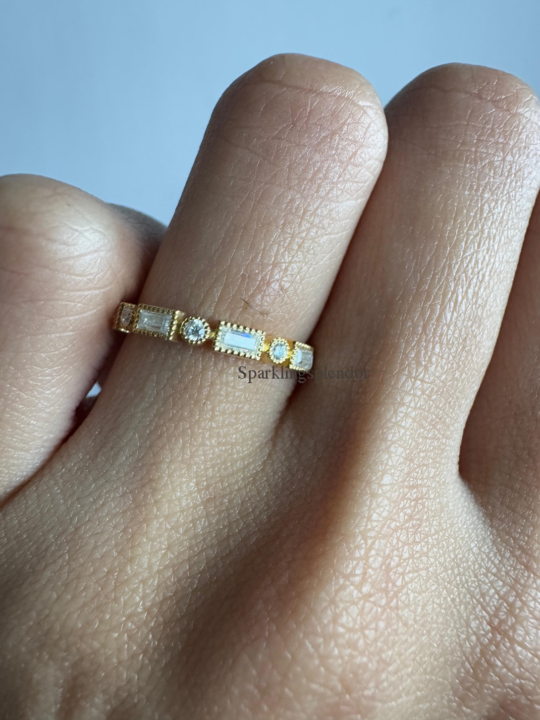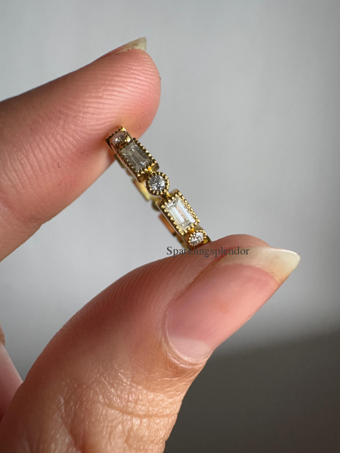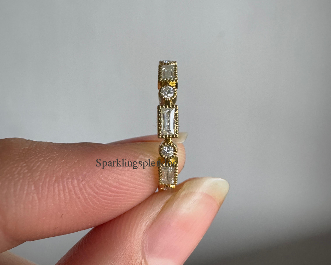 Dainty Baguette & Round Cut Moissanite Band Yellow Gold Eternity Wedding Band