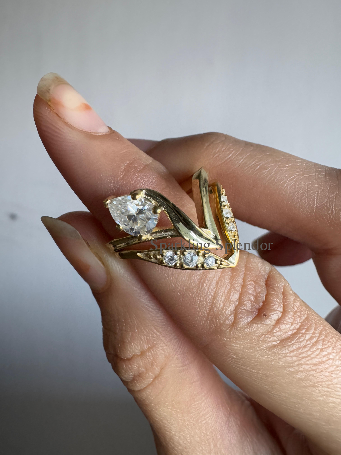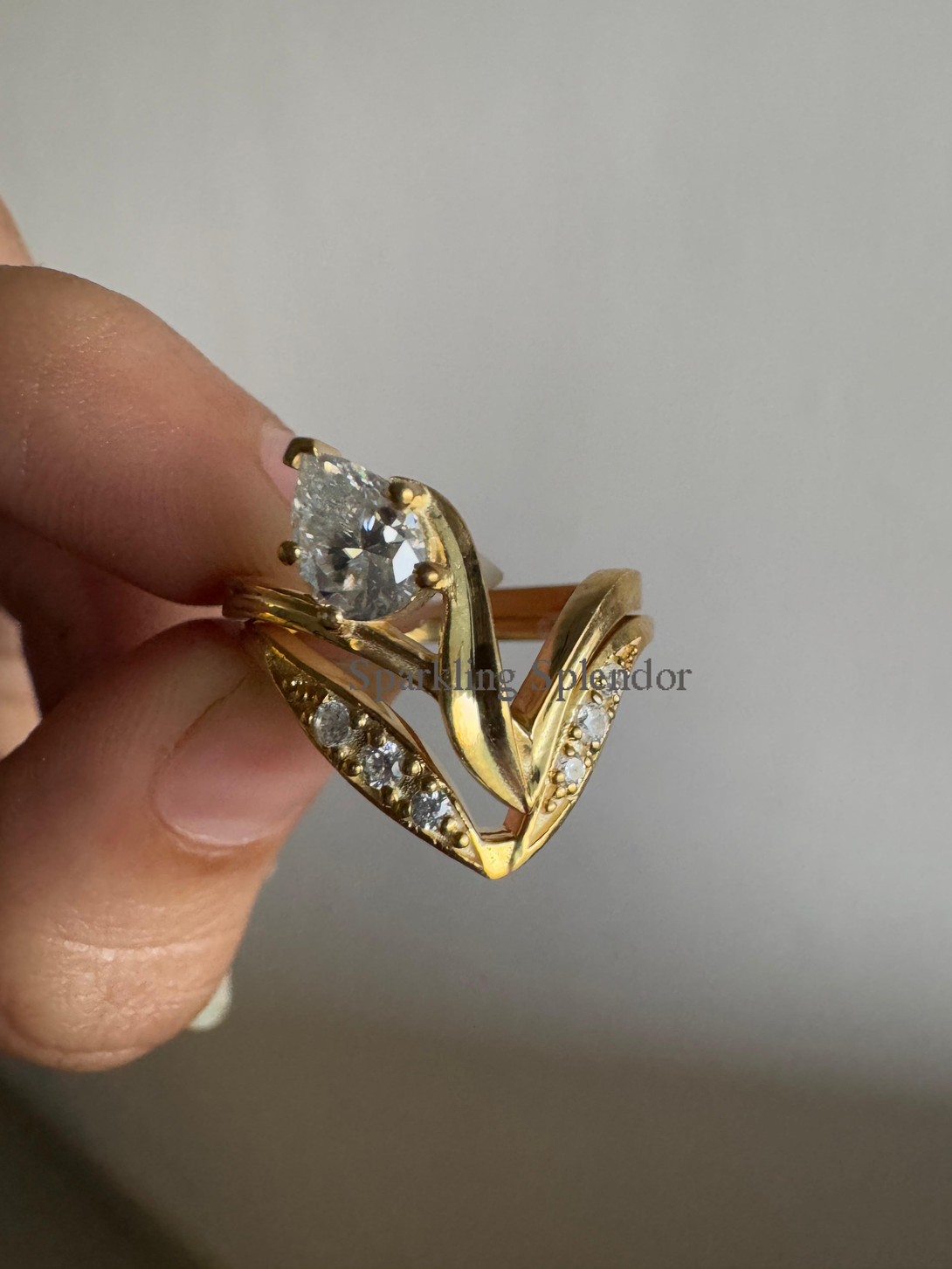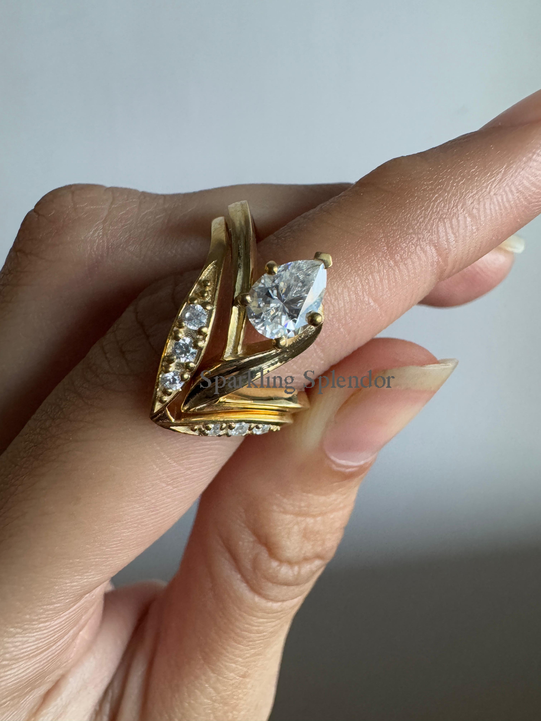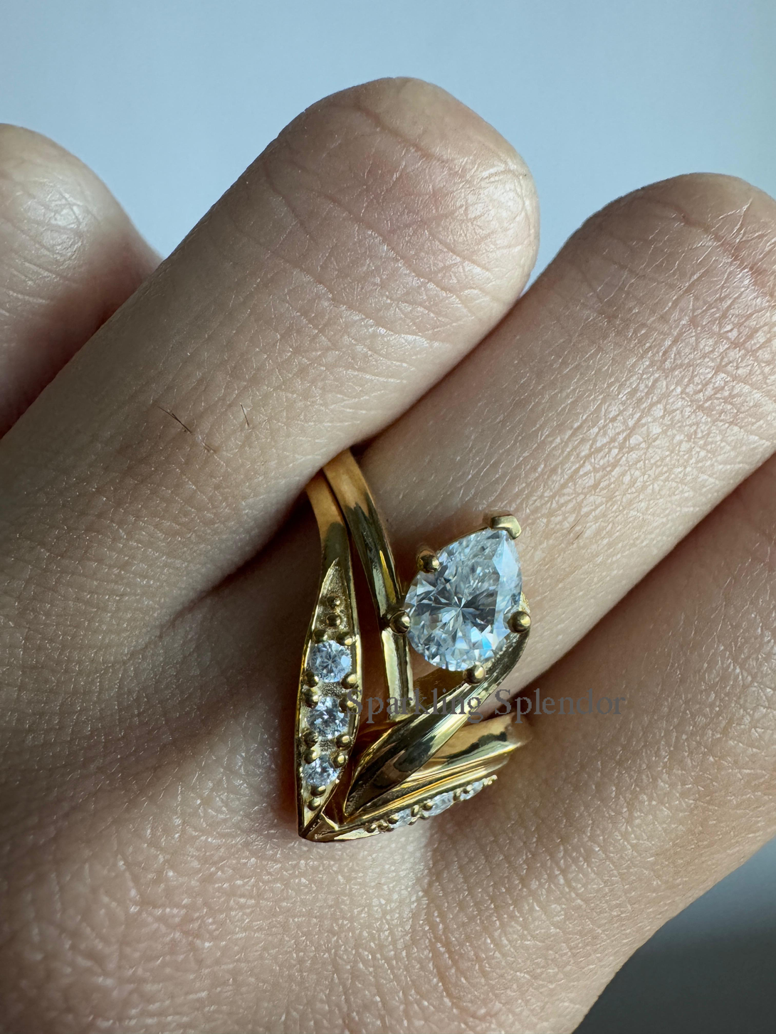 Pear Cut Moissanite Ring With Matching Band Solid Gold Unique Wedding Ring Set