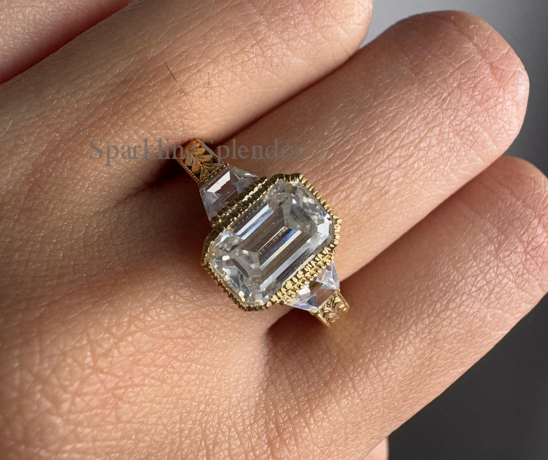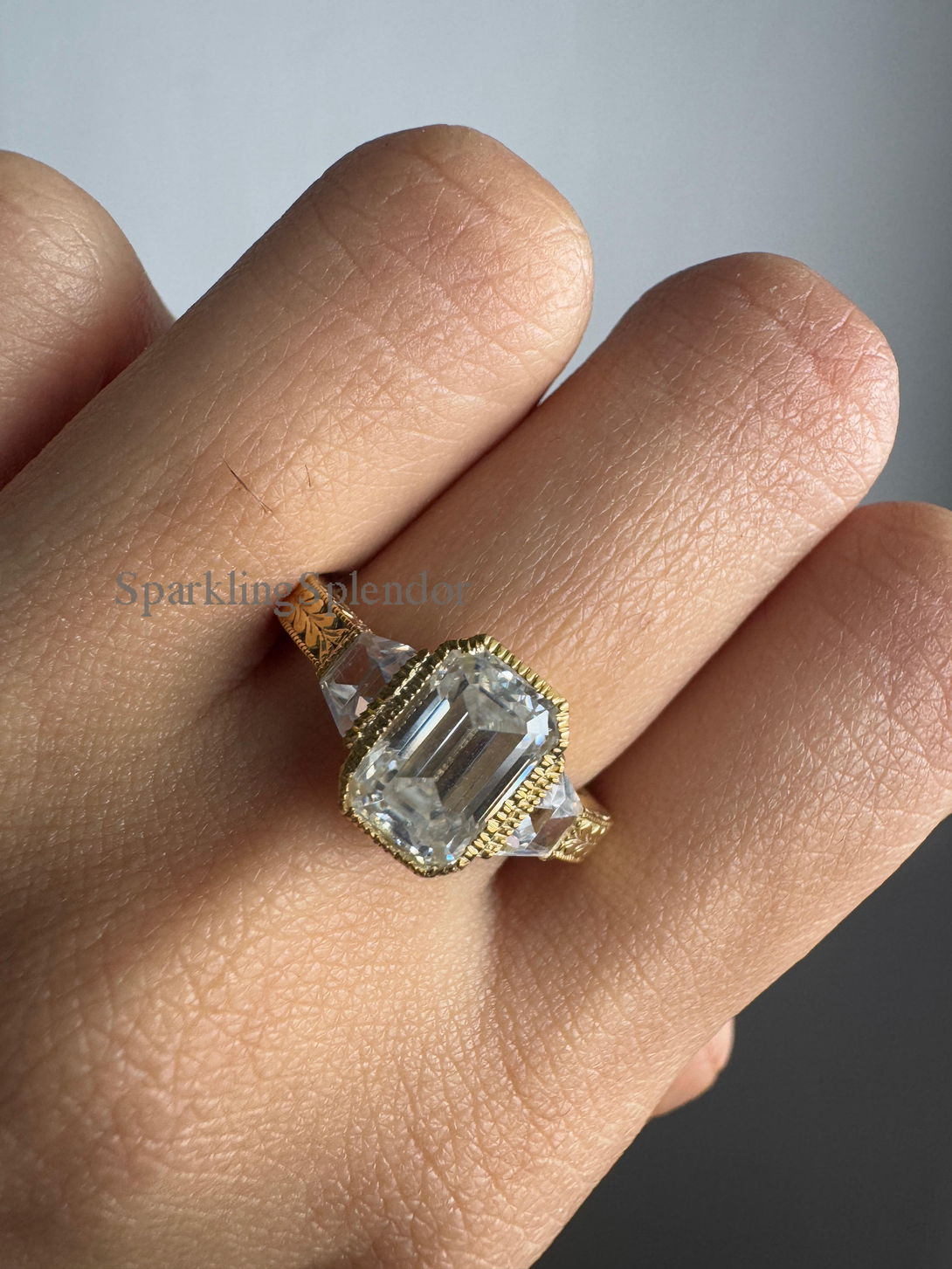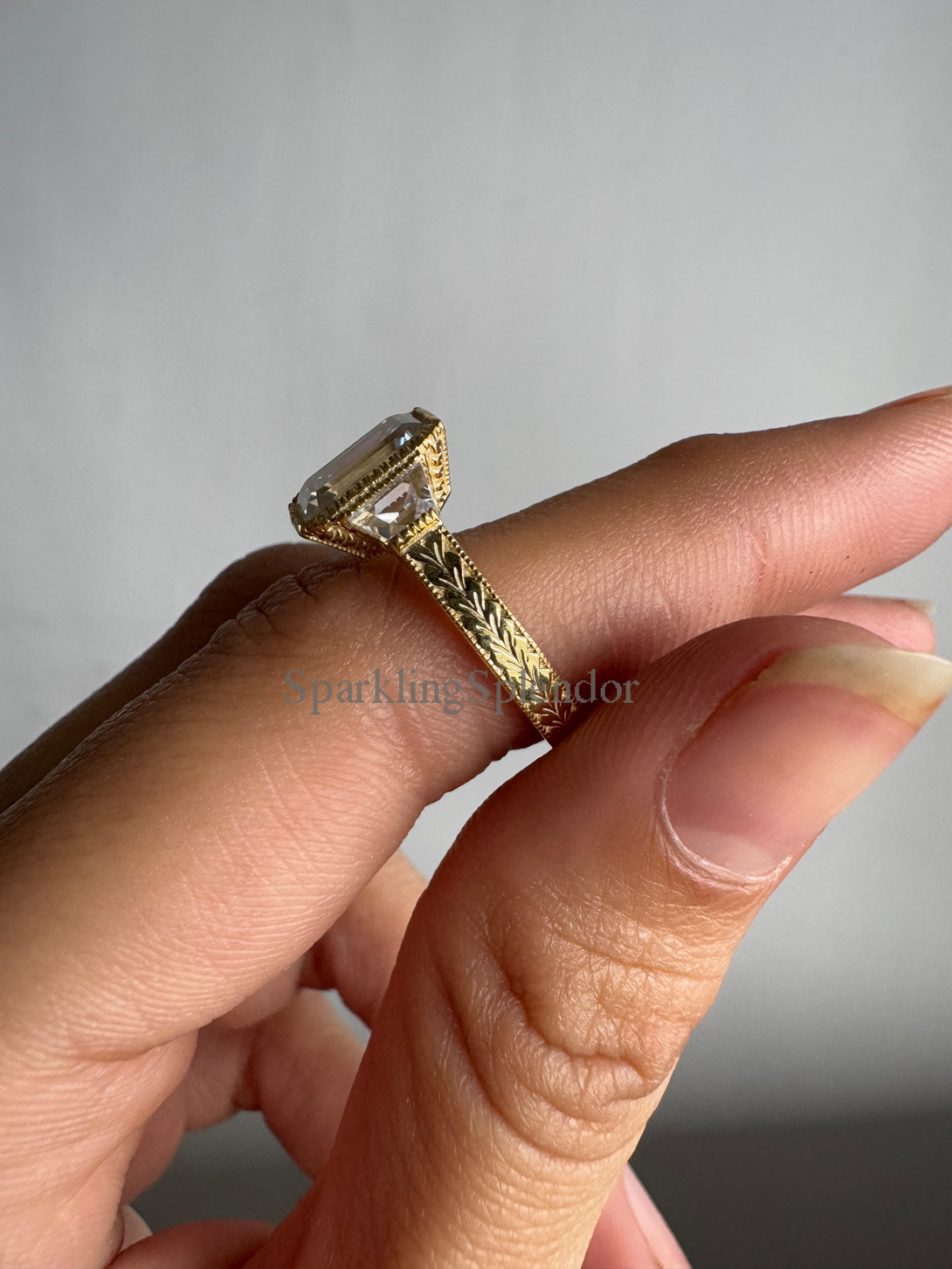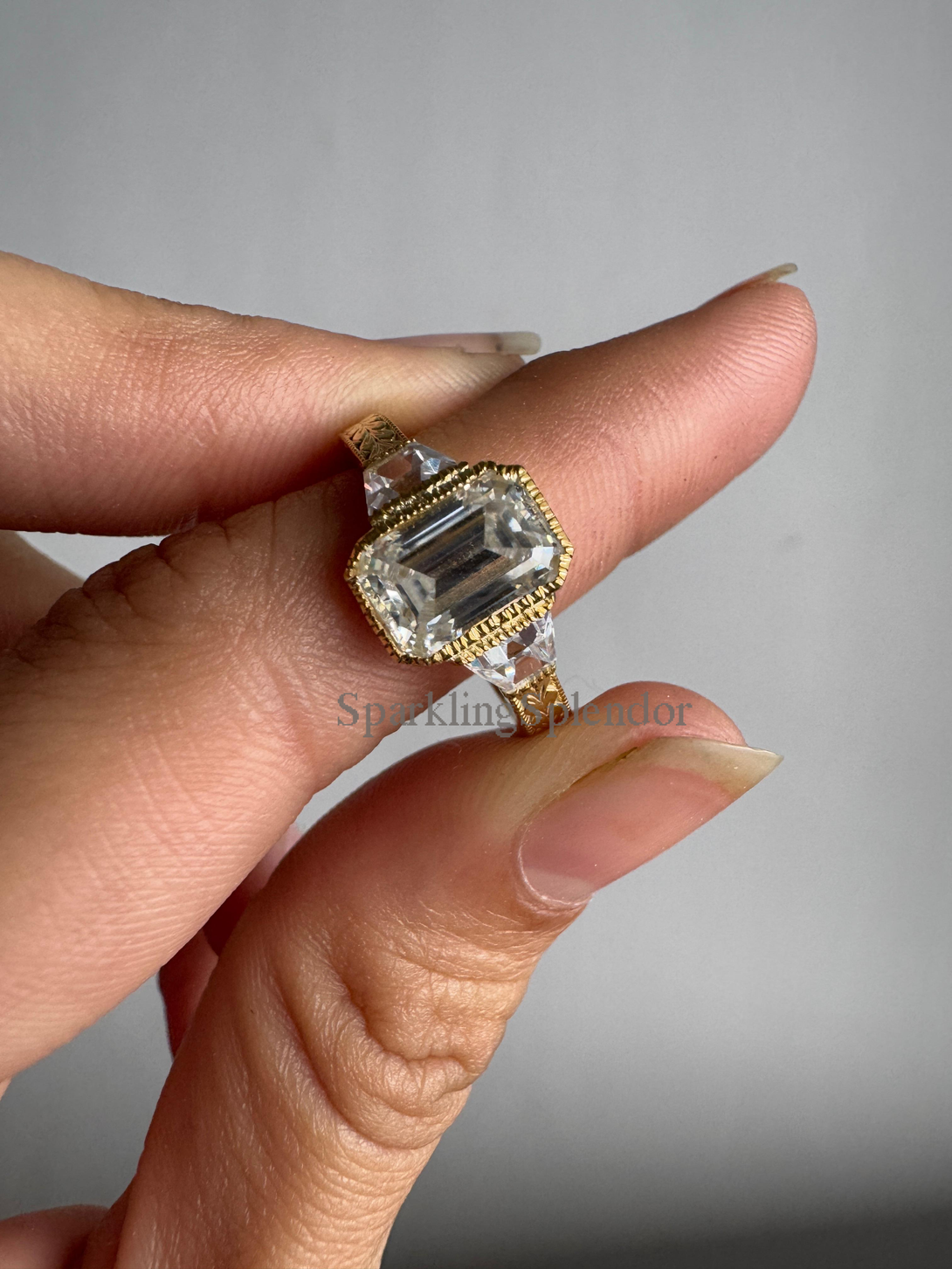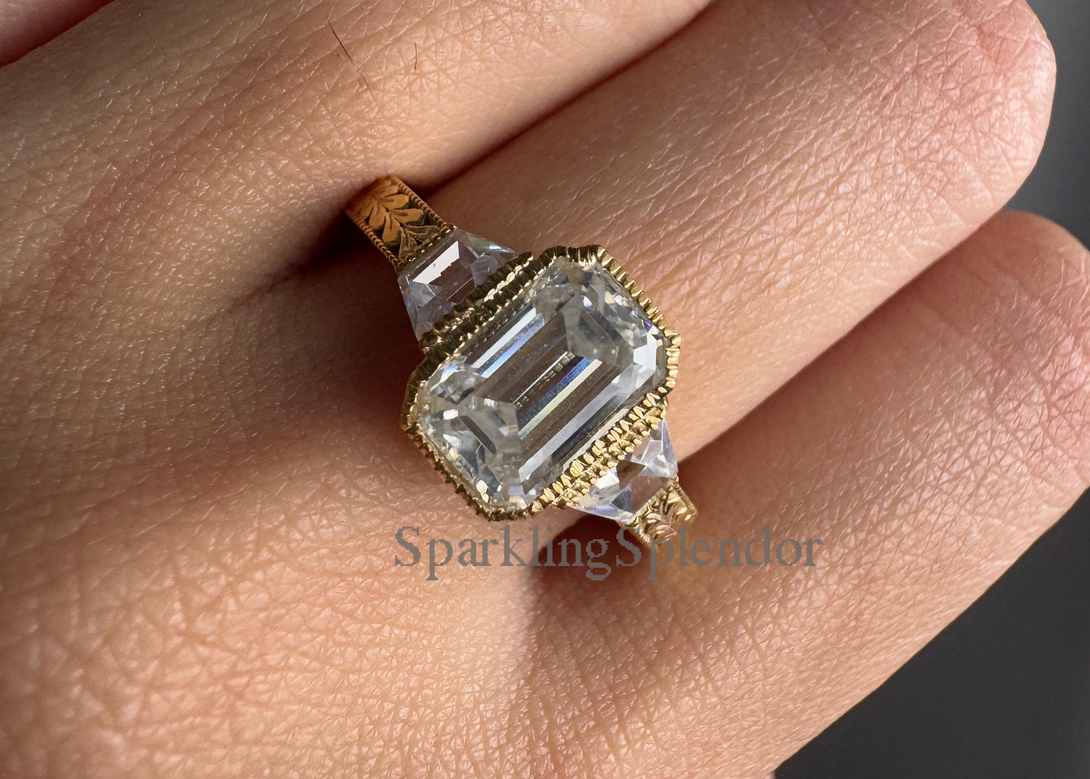 Milgrain Bezel Three Stone Wedding Ring Emerald Cut Moissanite Engagement Ring