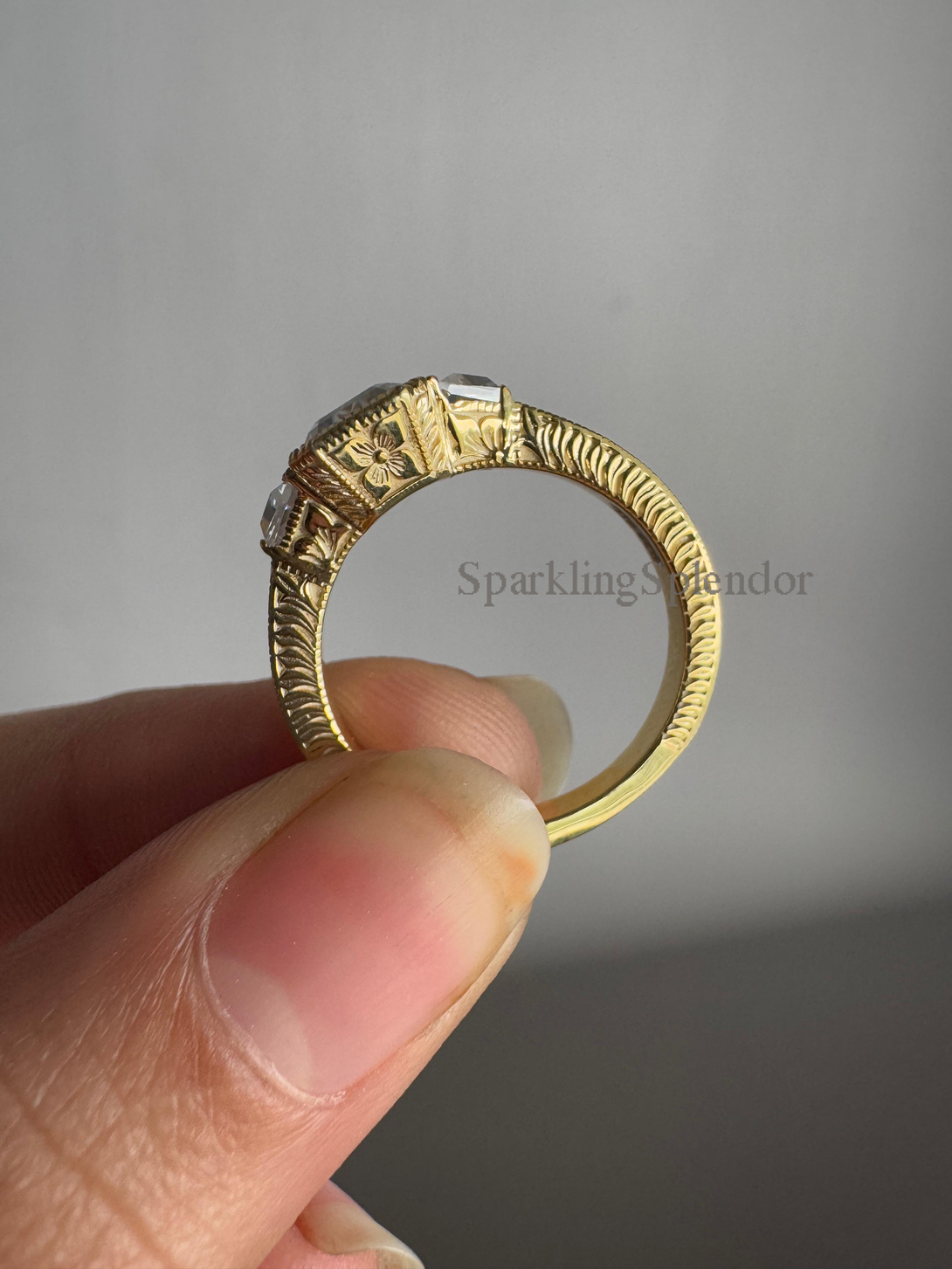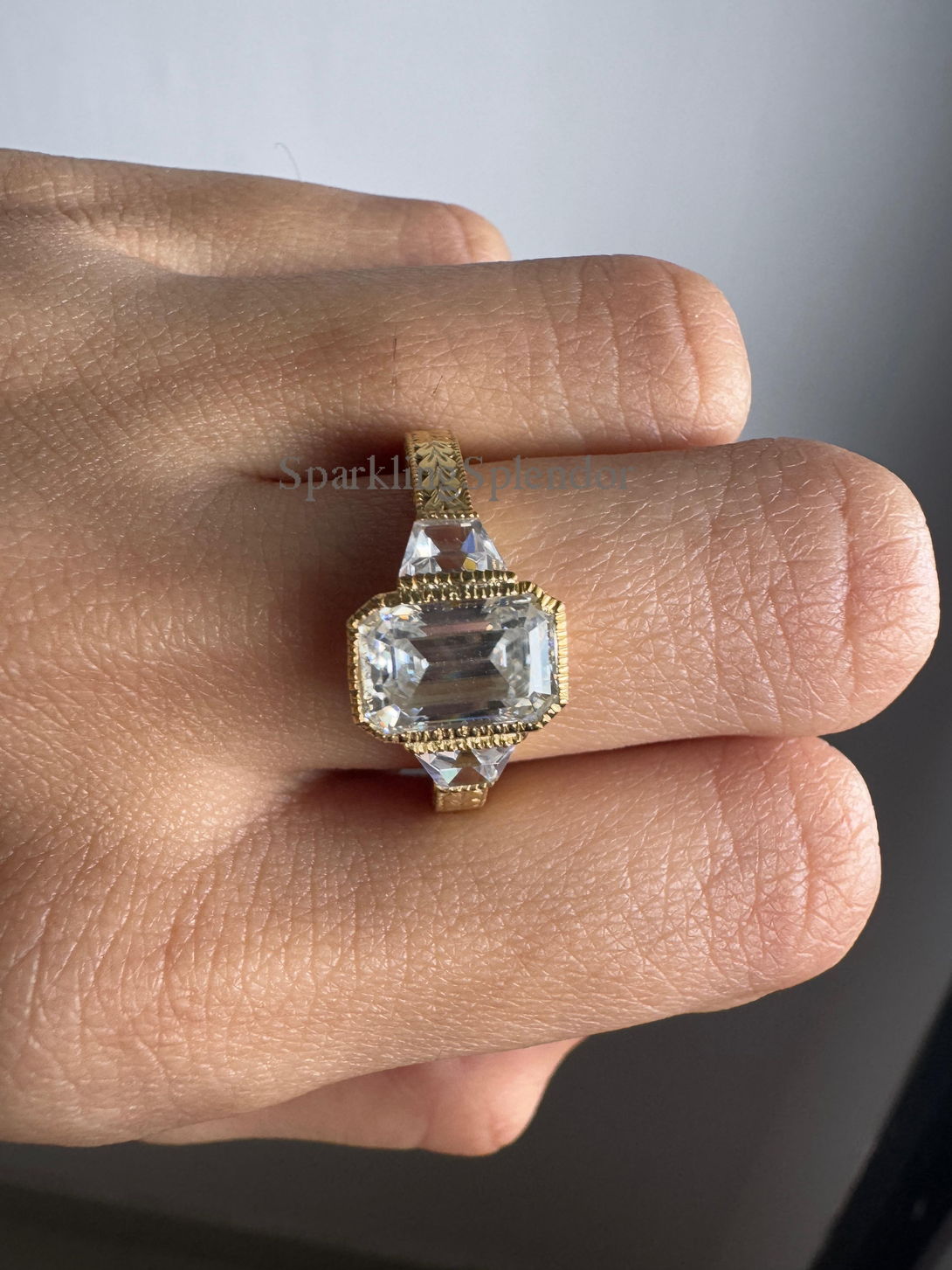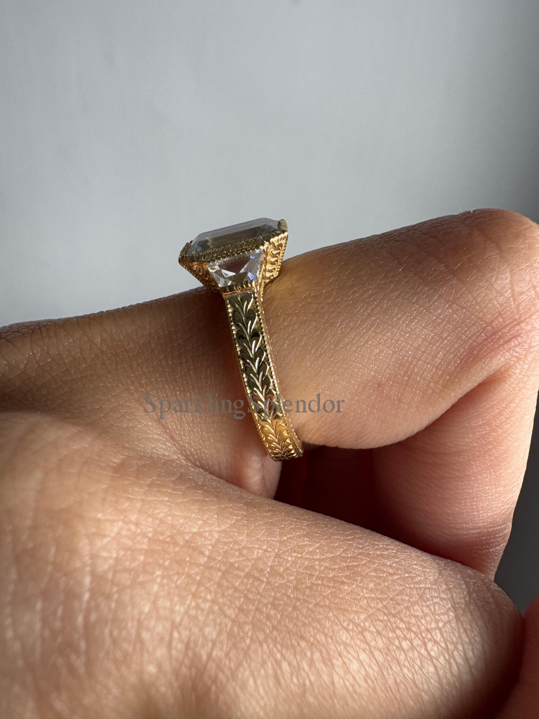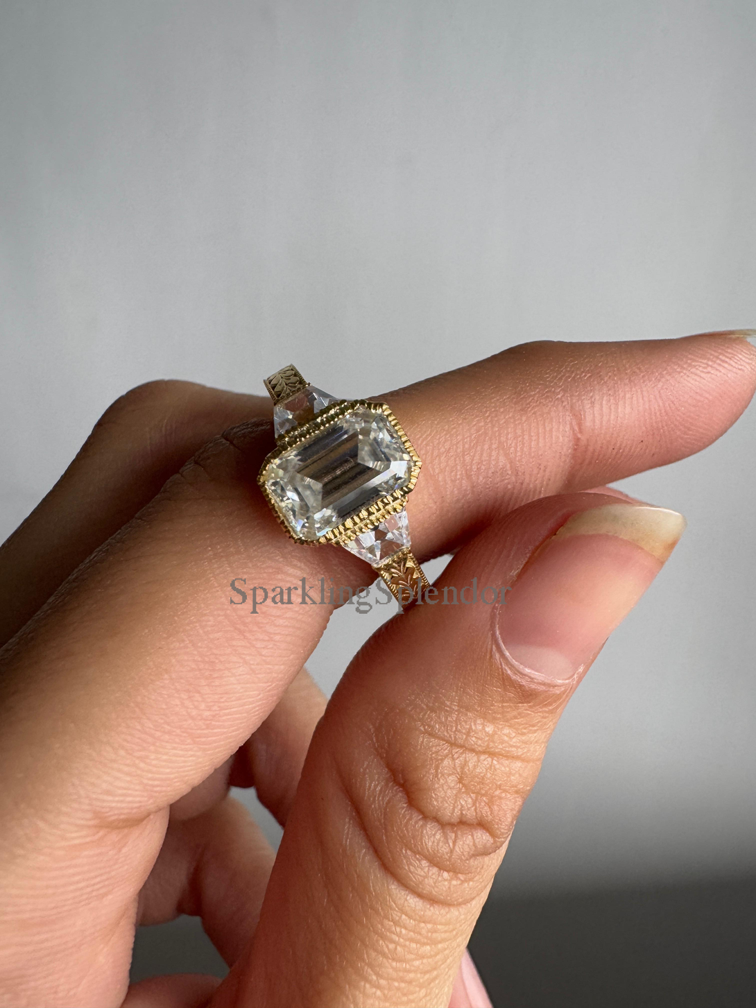 Milgrain Bezel Three Stone Wedding Ring Emerald Cut Moissanite Engagement Ring
