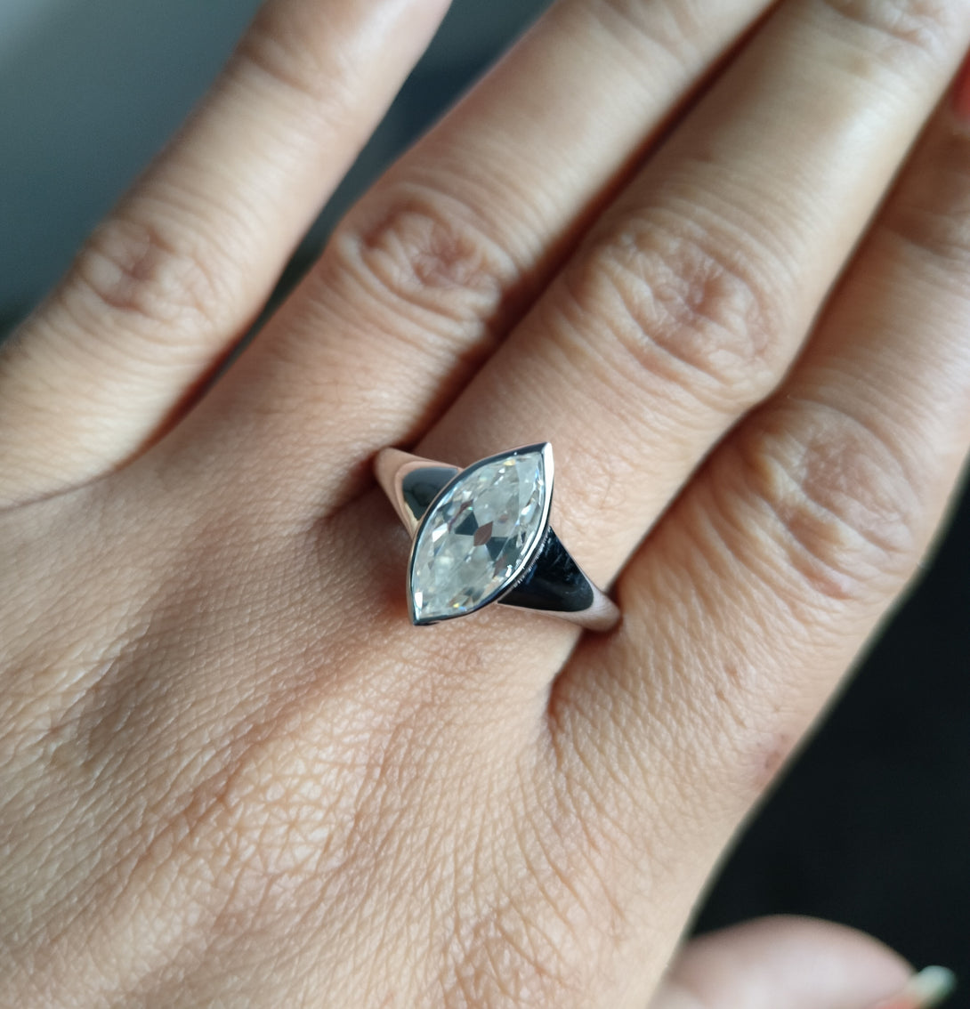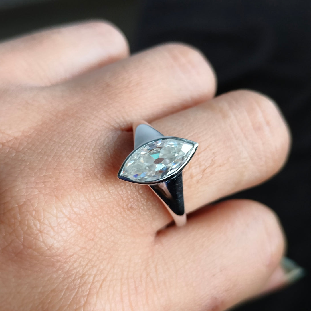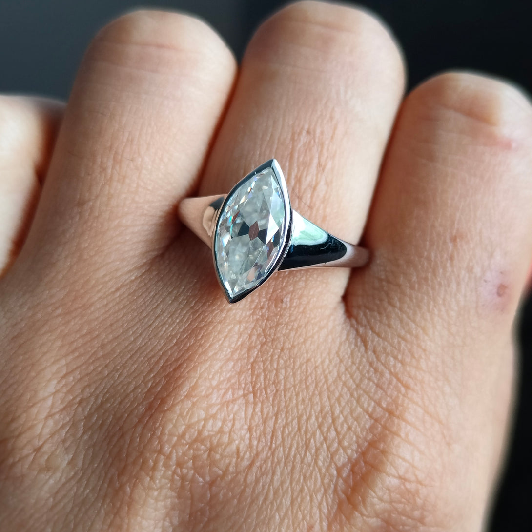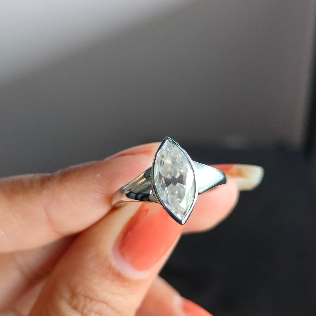 Old European Cut Marquise Moissanite Ring Solitaire Bezel Set Engagement Ring