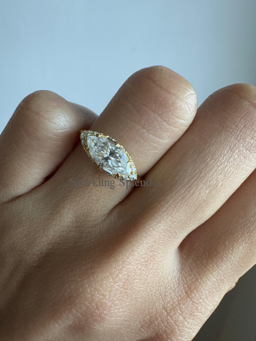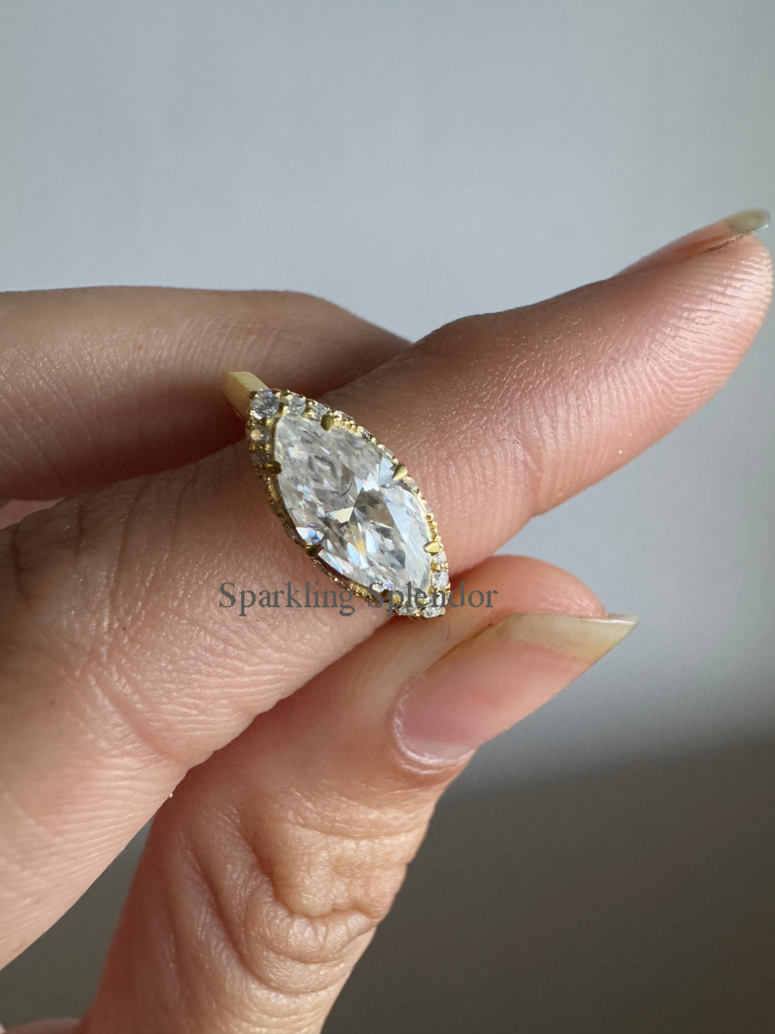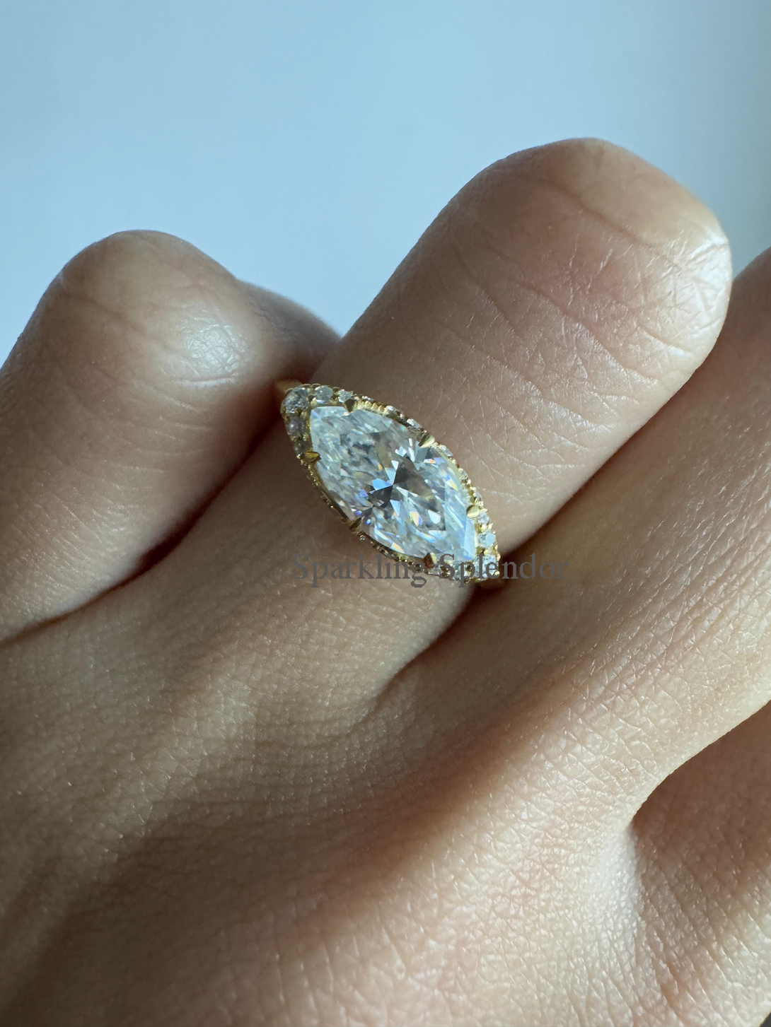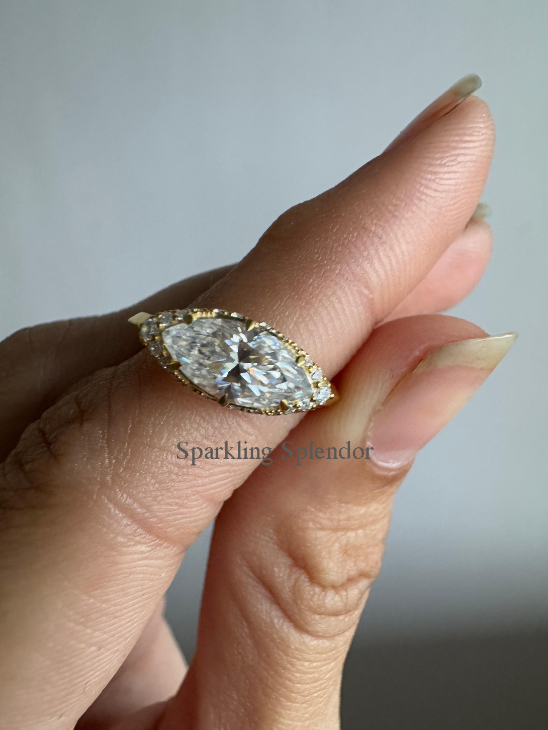 Classic East West Marquise Cut Real Moissanite Designer Engagement Ring in Gold