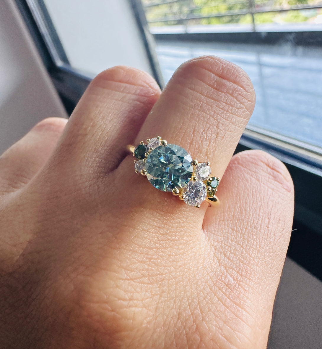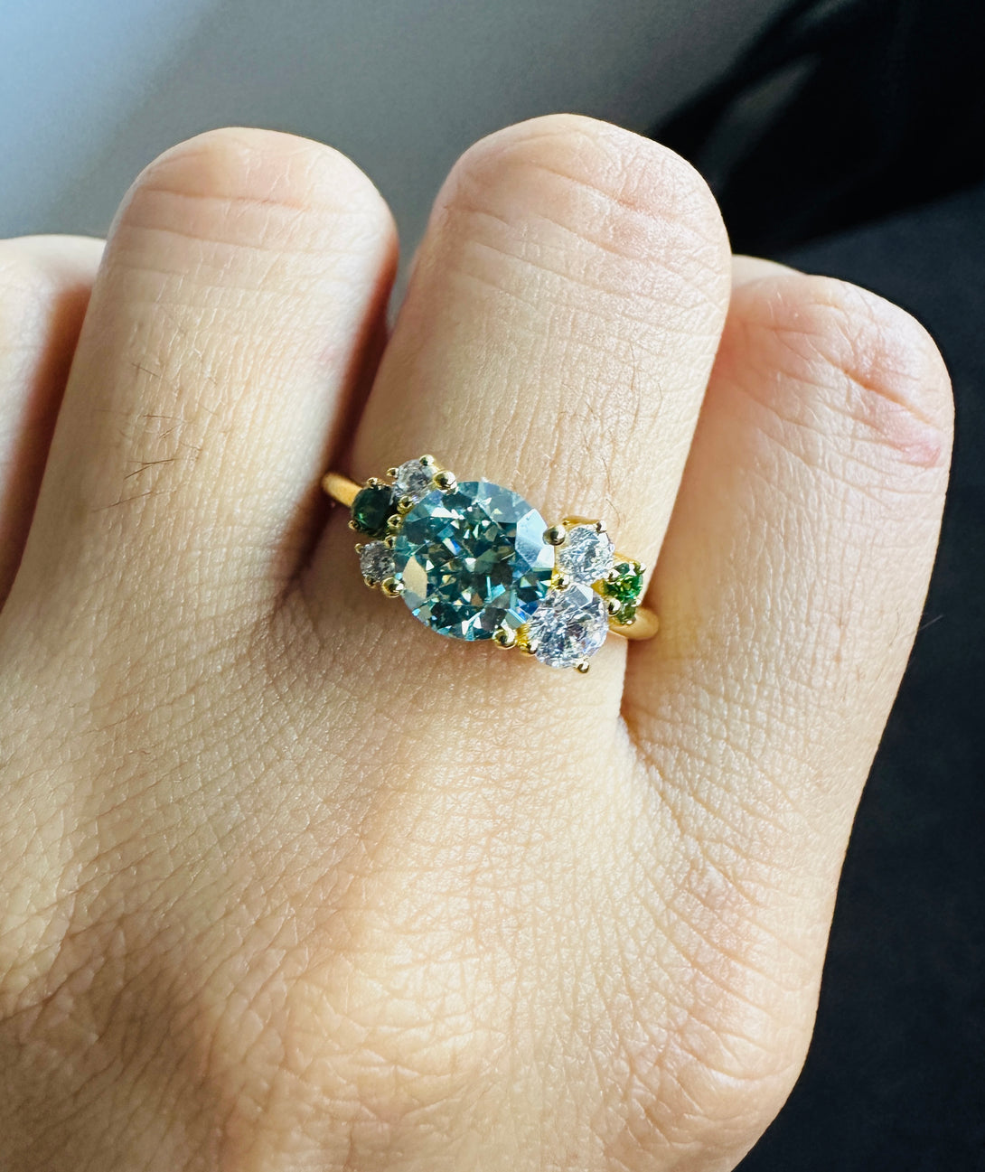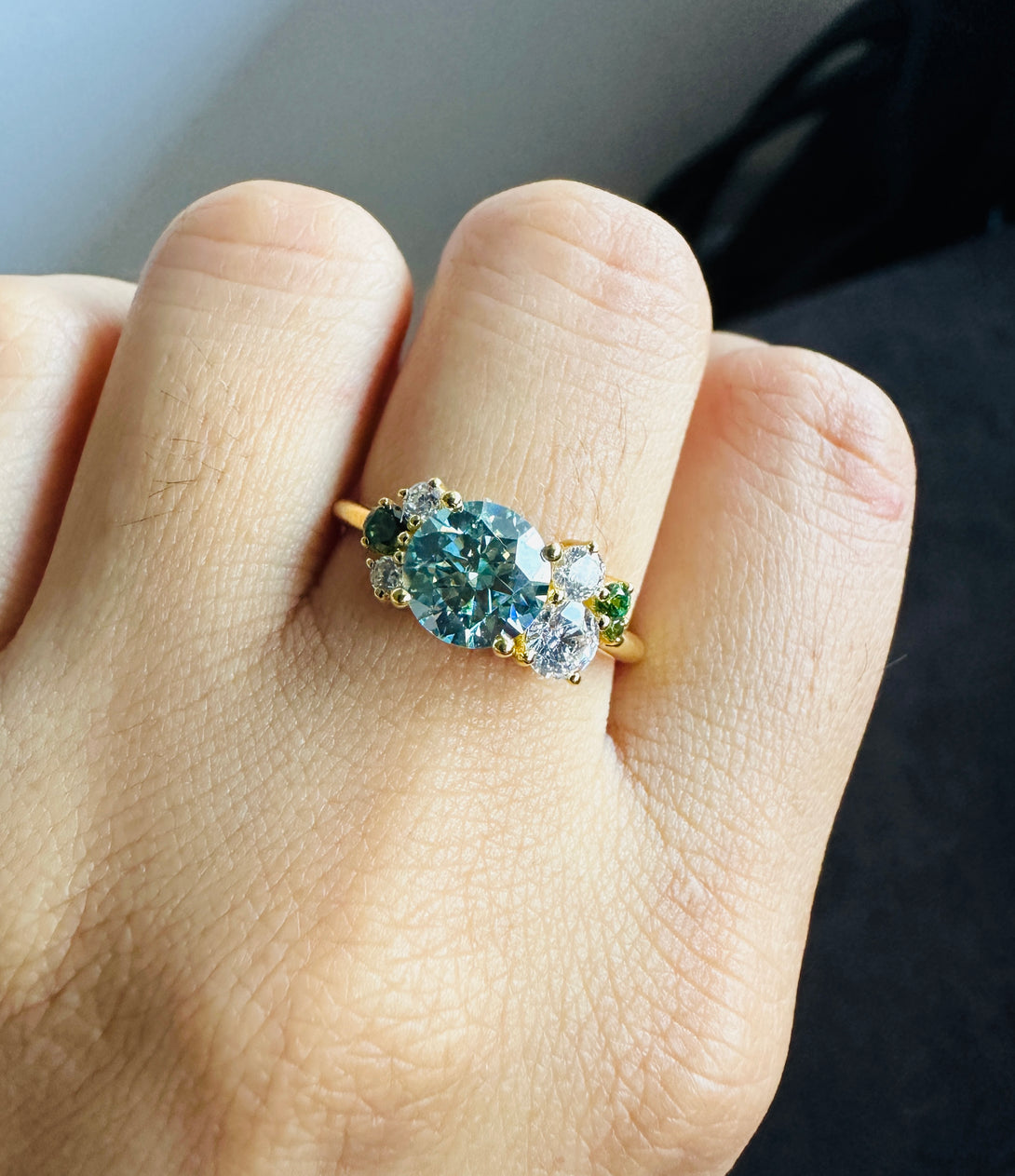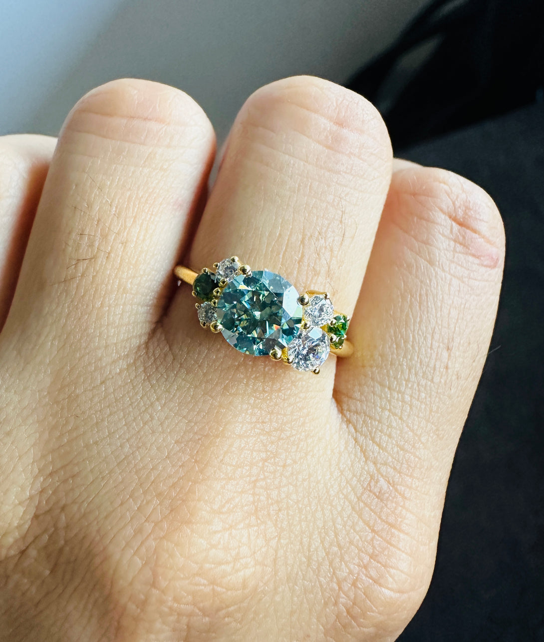 Cluster Moissanite Ring Green Round Brilliant Cut 18K Gold Engagement Ring Her