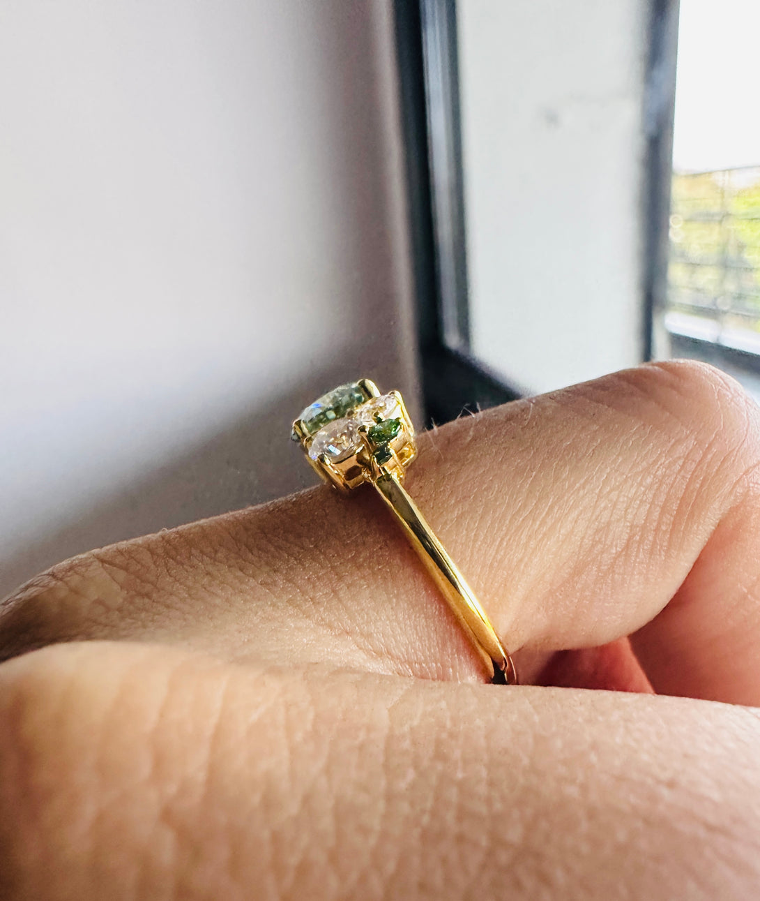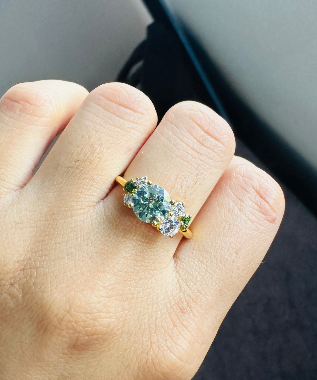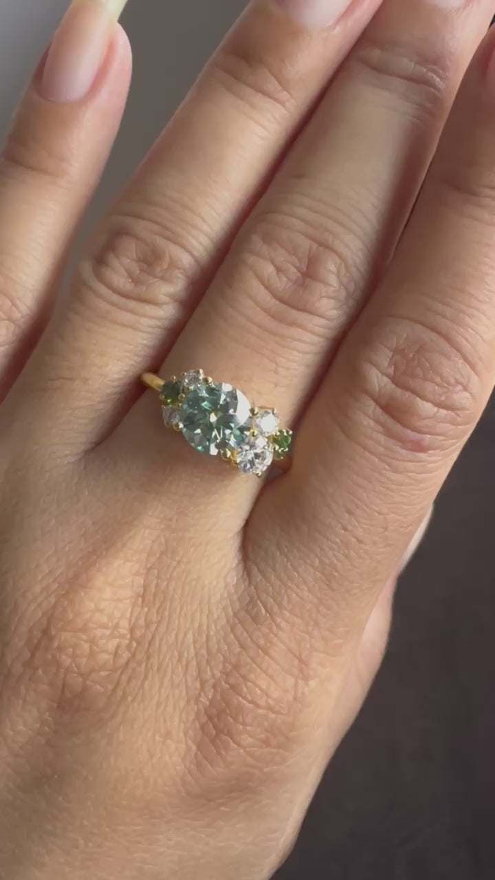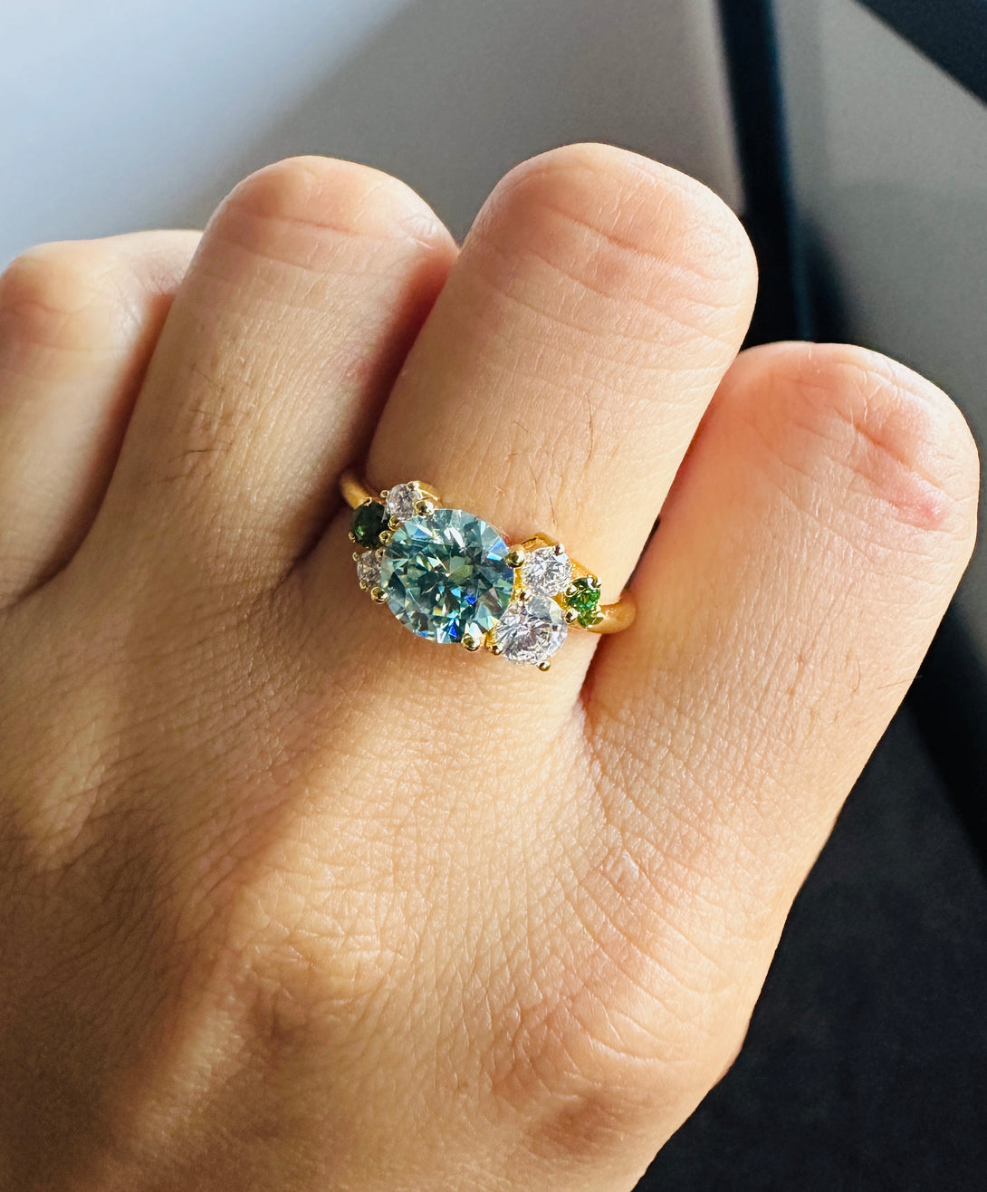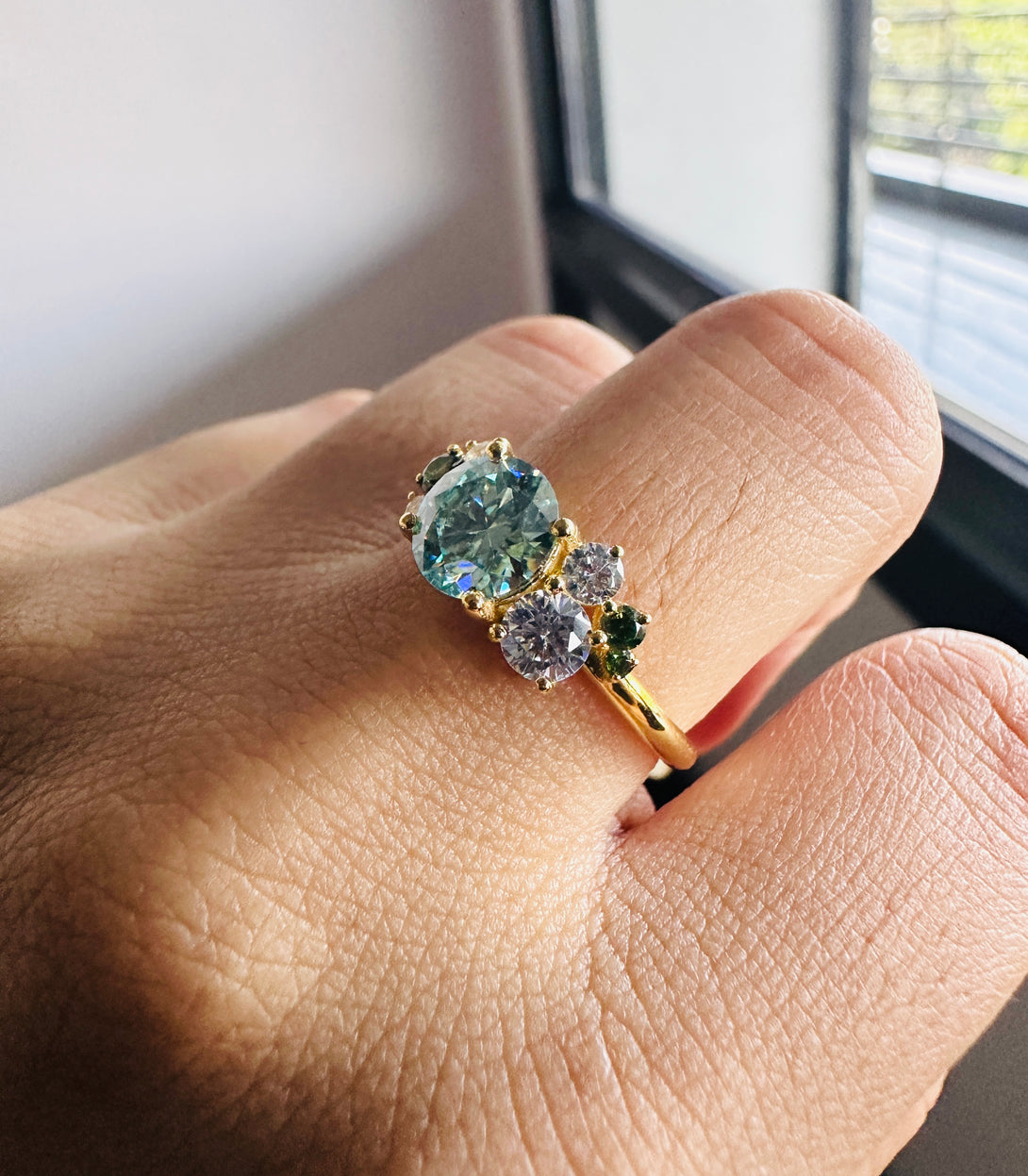 Cluster Moissanite Ring Green Round Brilliant Cut 18K Gold Engagement Ring Her
