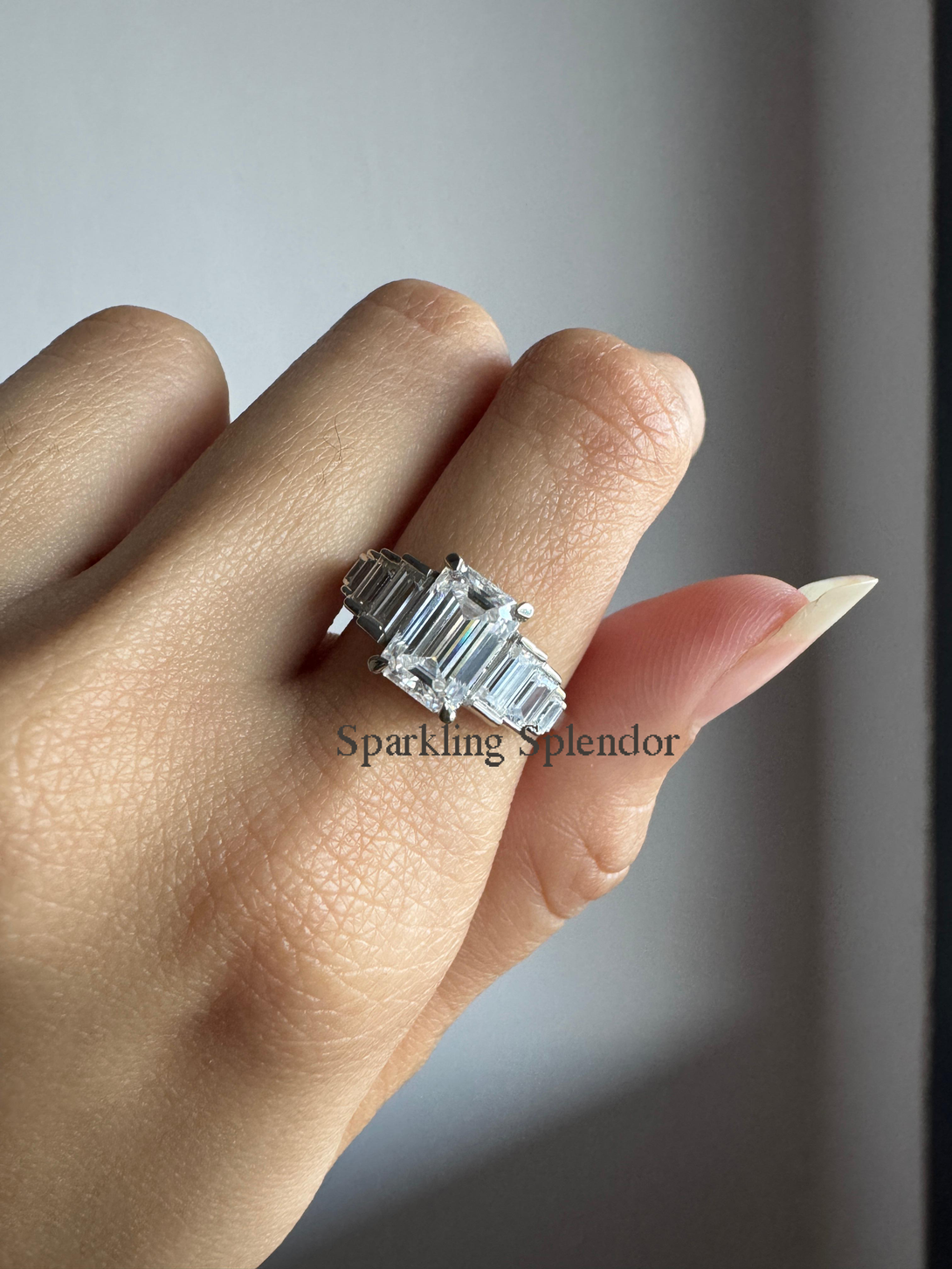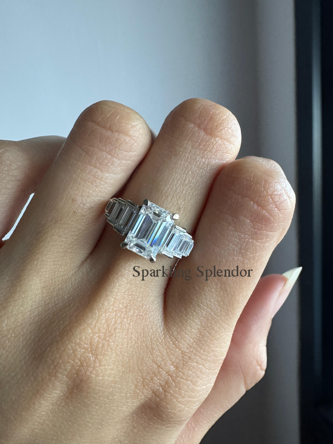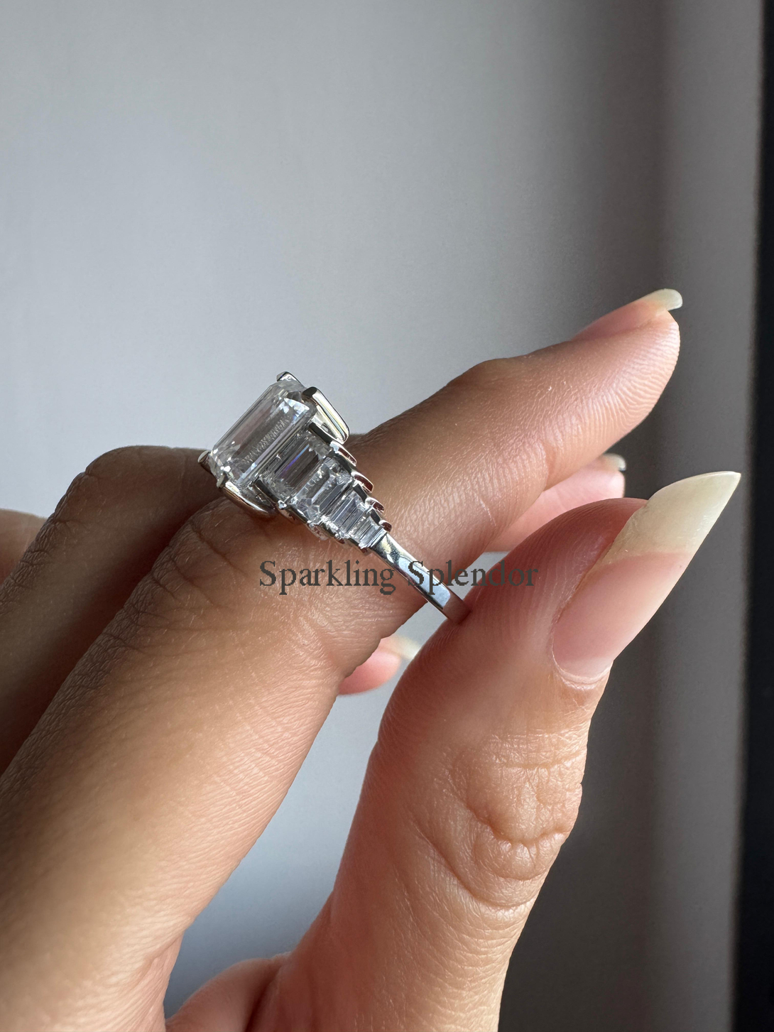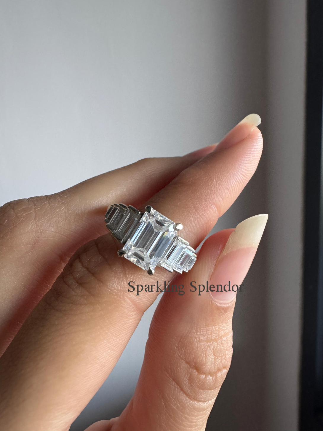 Emerald Cut Moissanite Solitaire With Baguette Accents Engagement Ring For Women