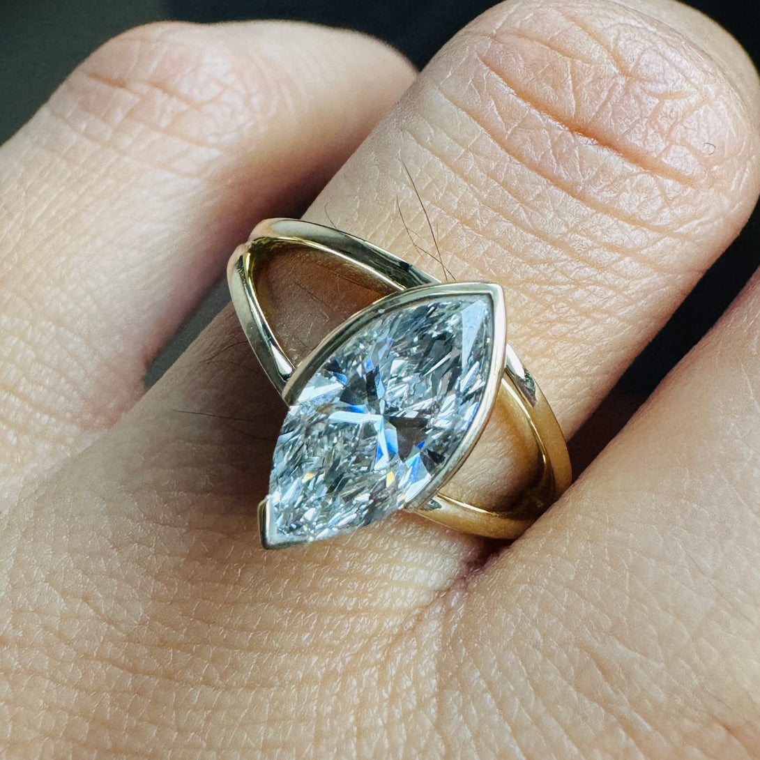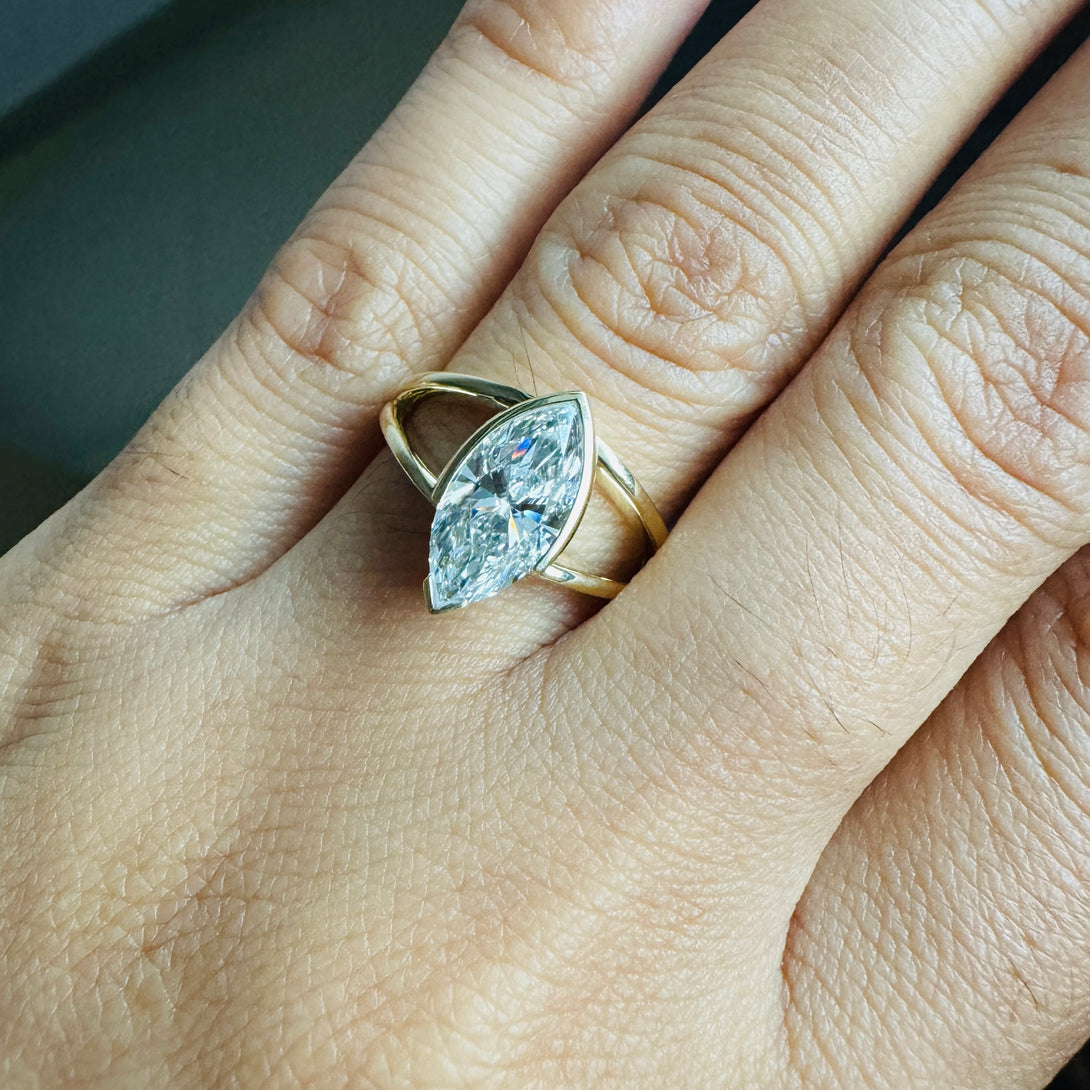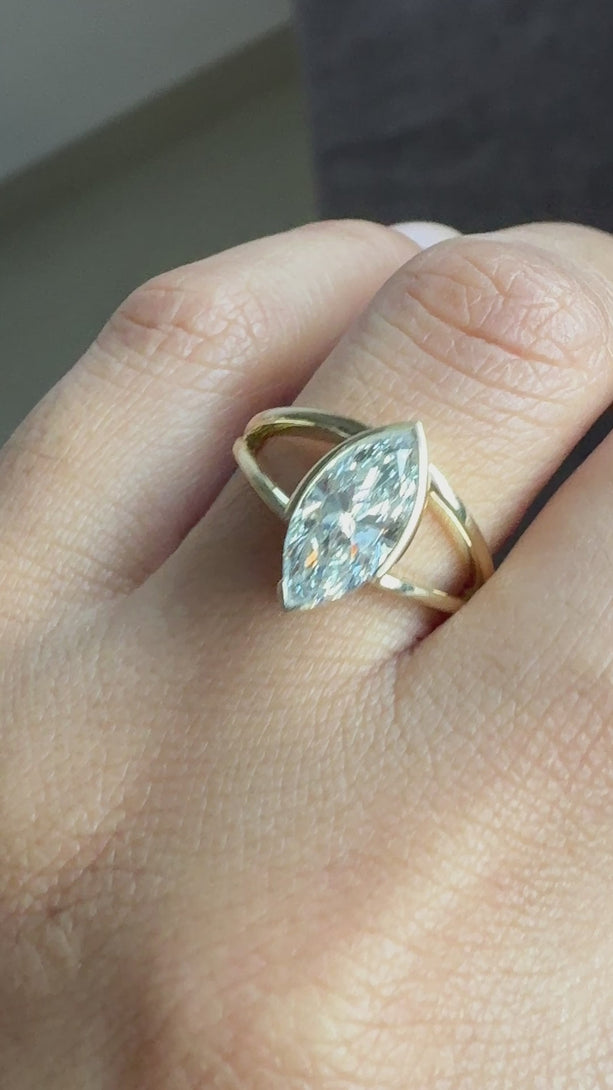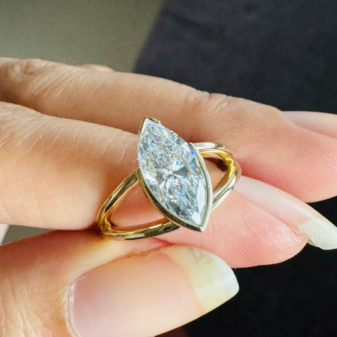Half Bezel Set Moissanite Split Shank Ring White Marquise Cut Solitaire Ring