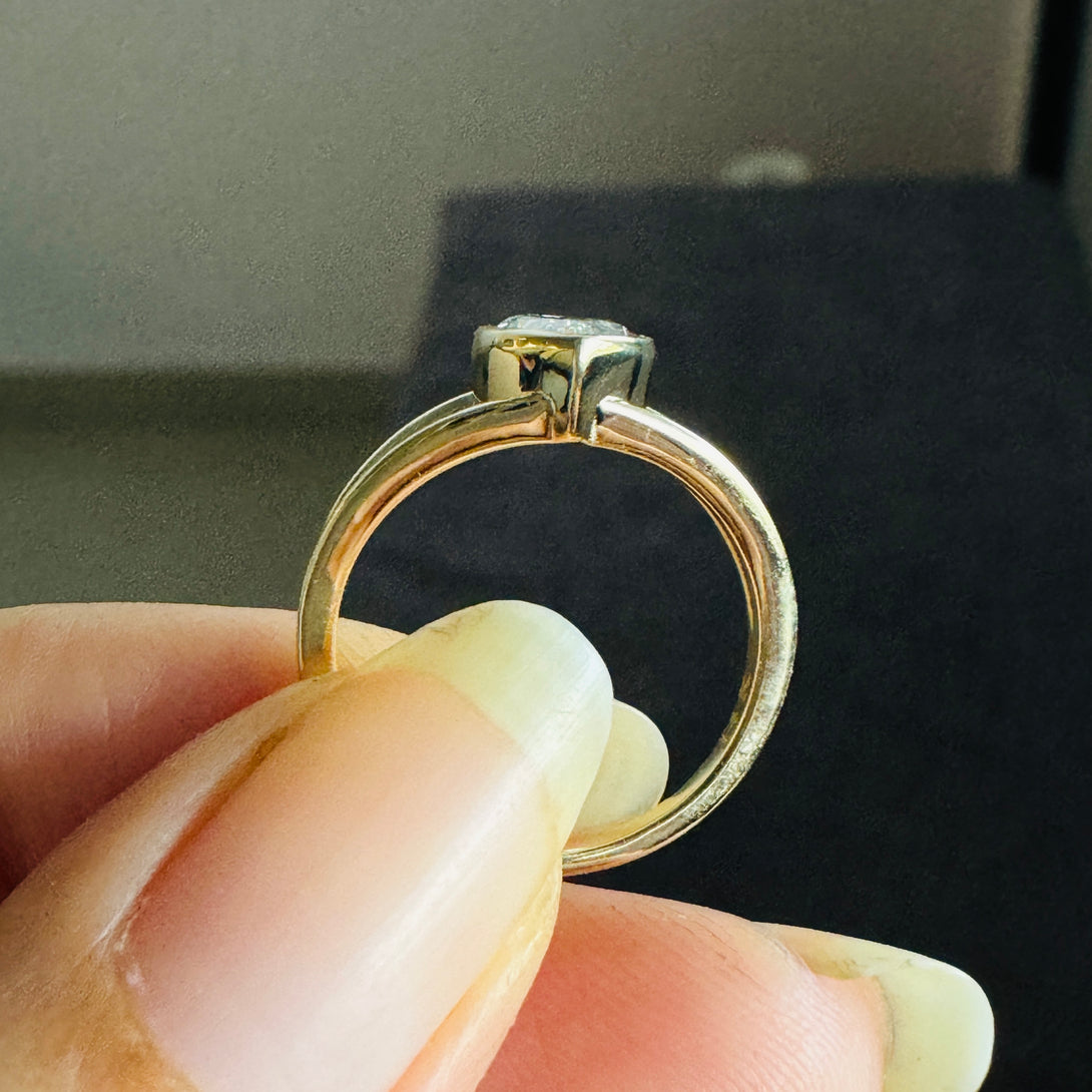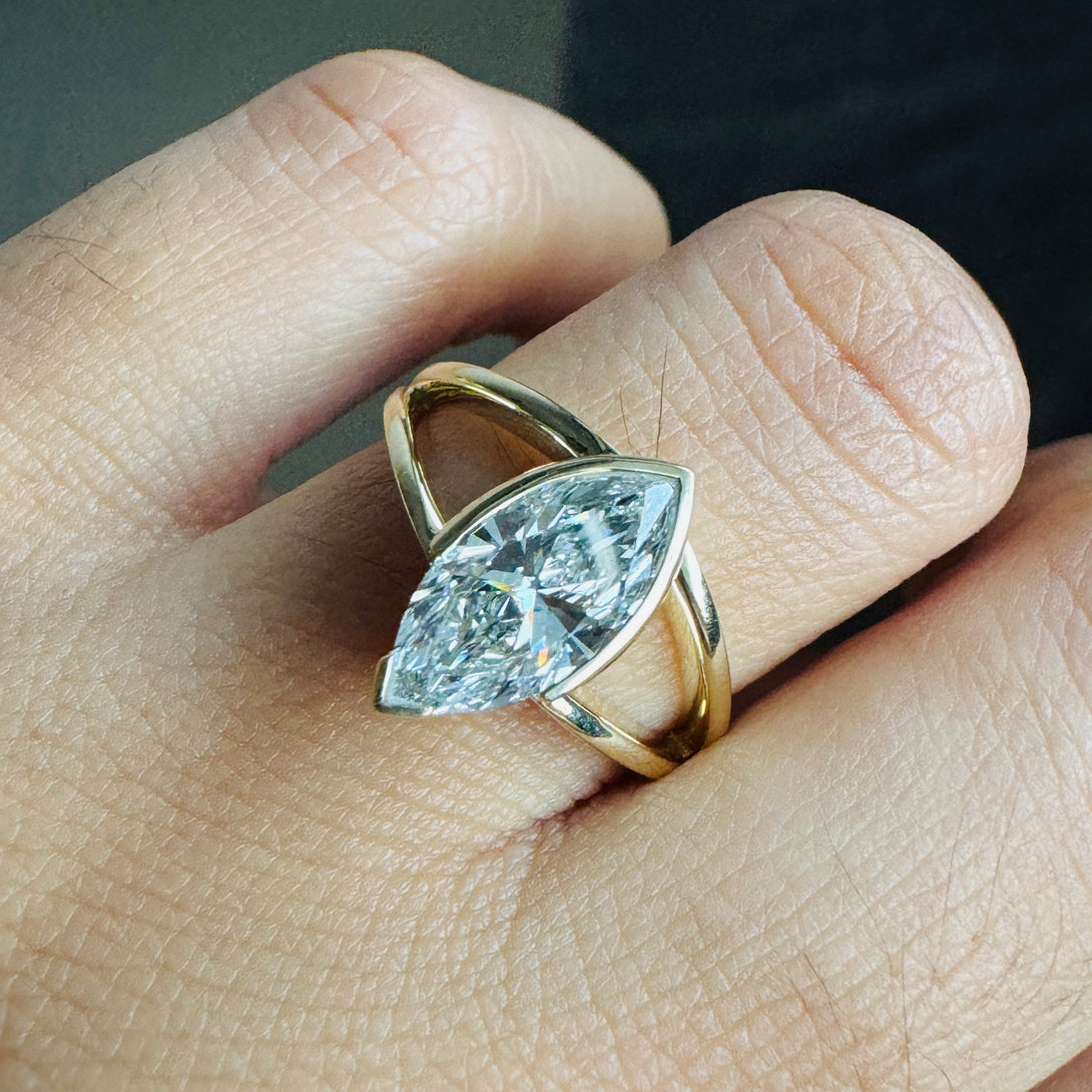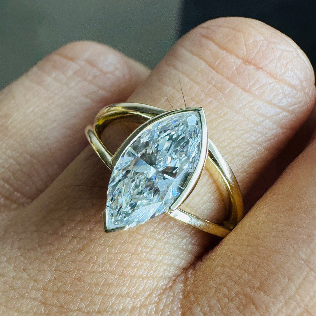 Half Bezel Set Moissanite Split Shank Ring White Marquise Cut Solitaire Ring