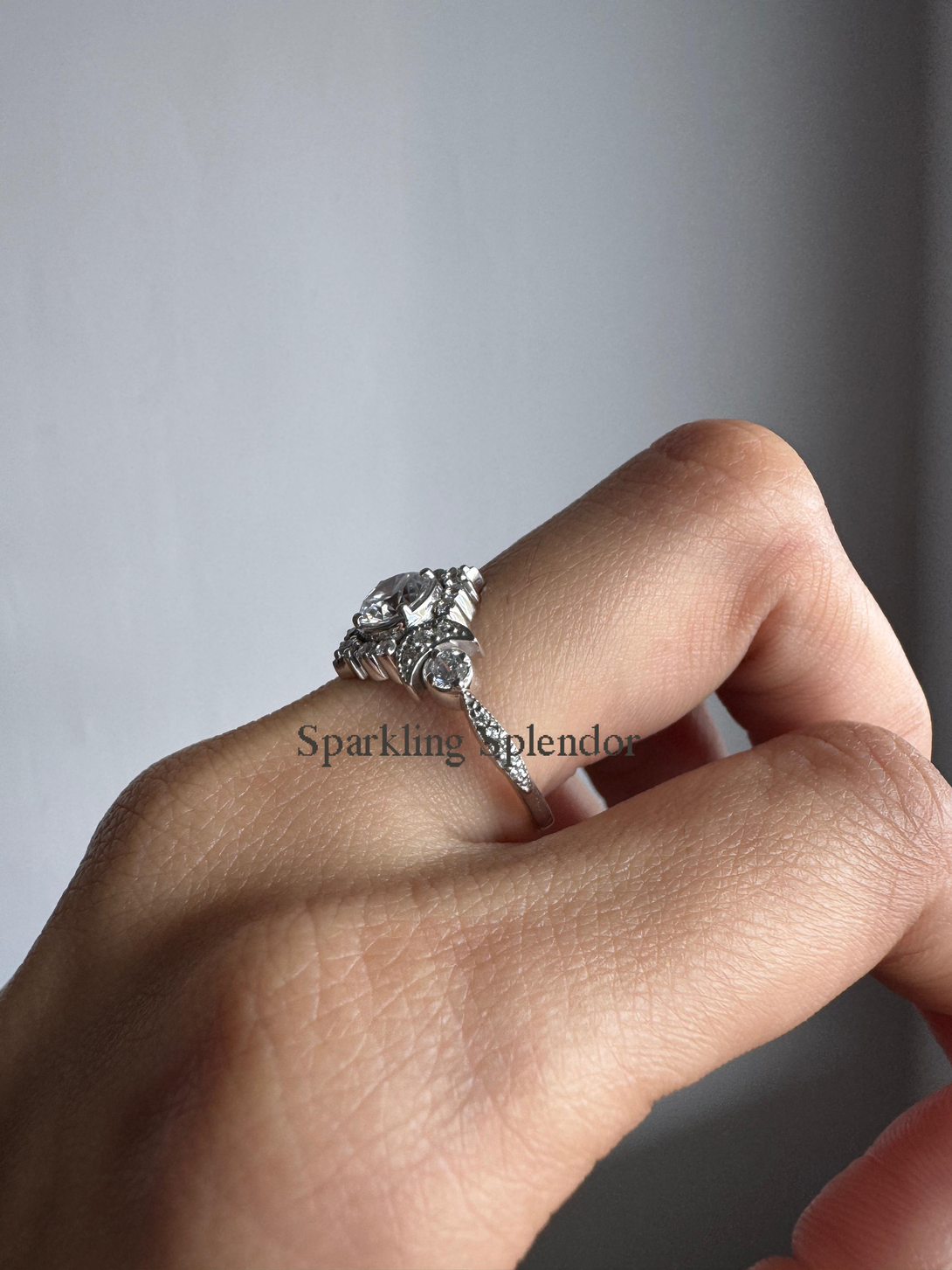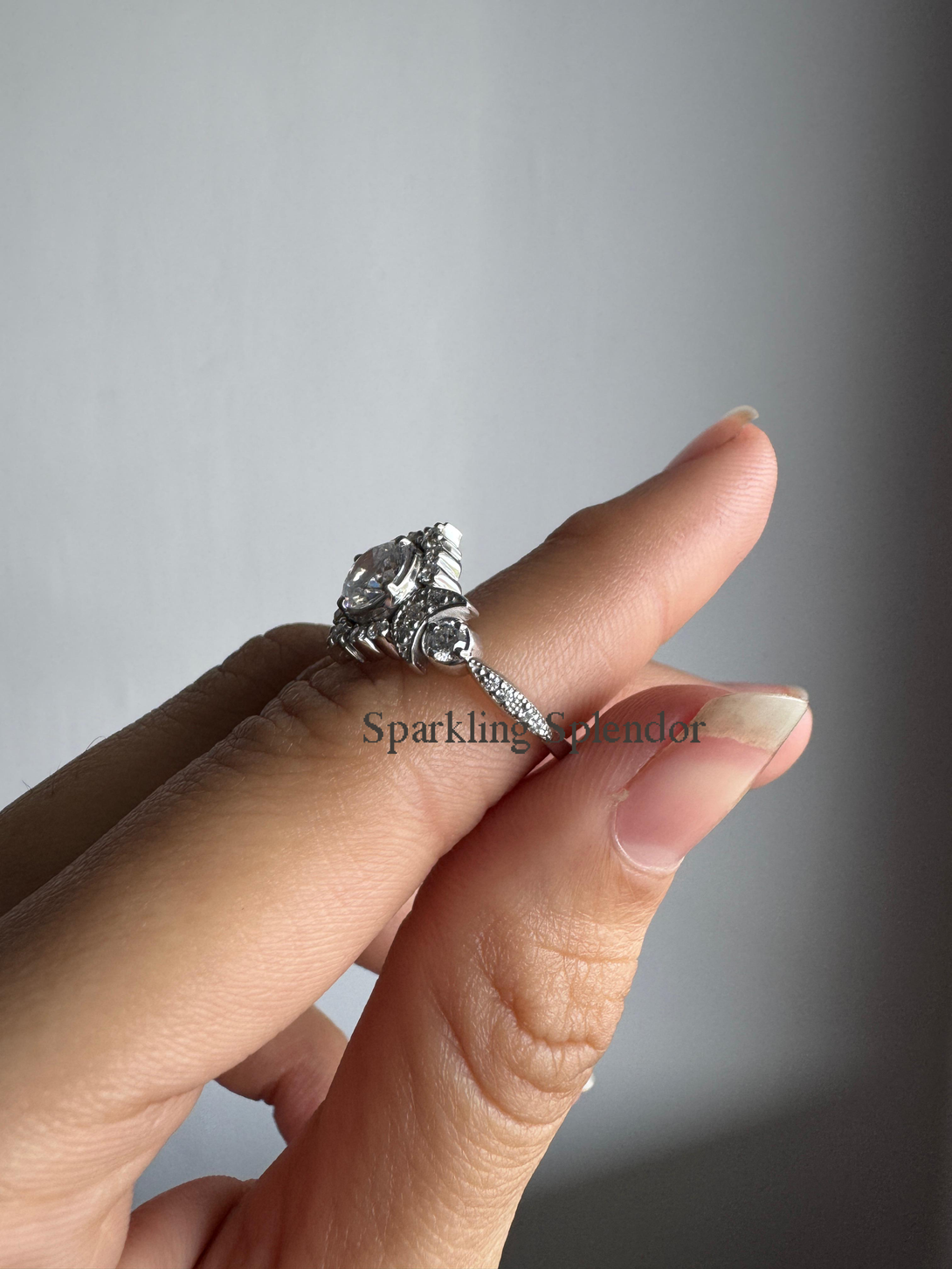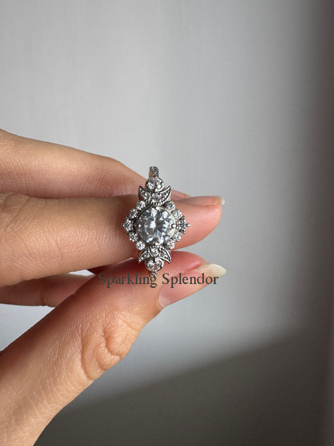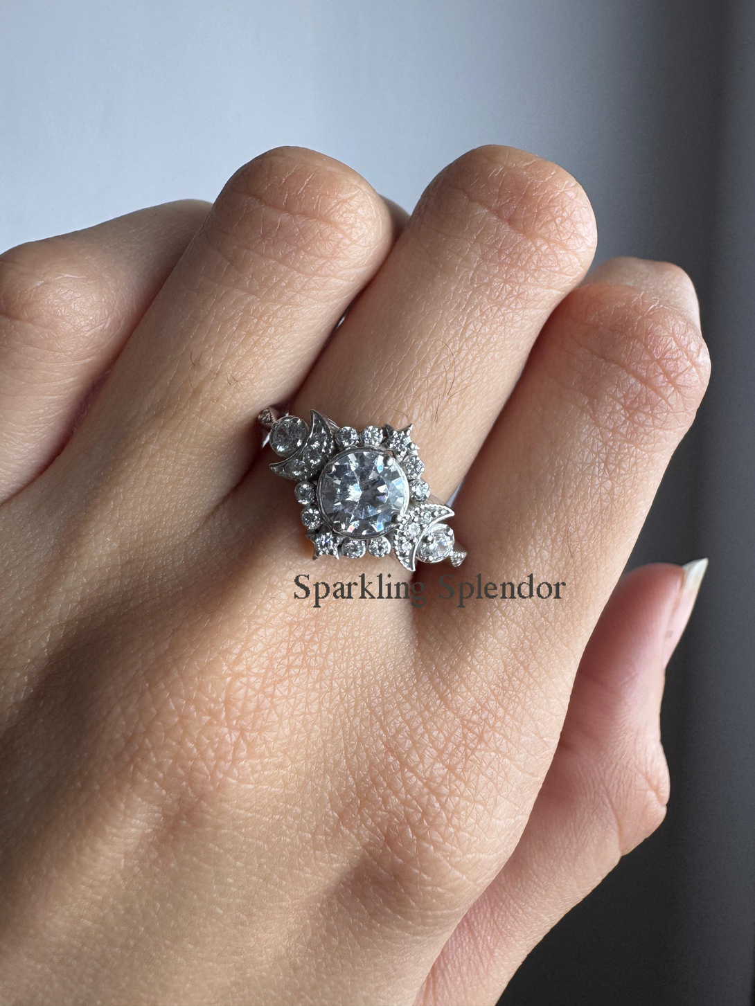 Round Cut Moissanite Engagement Ring Art Deco Vintage Inspire Wedding Her